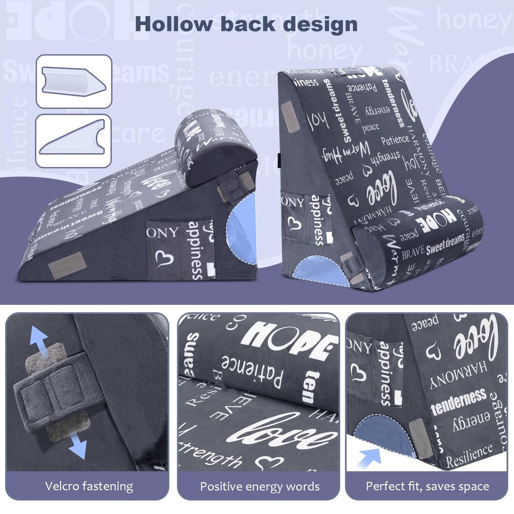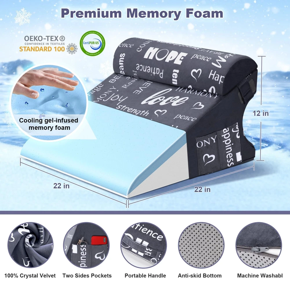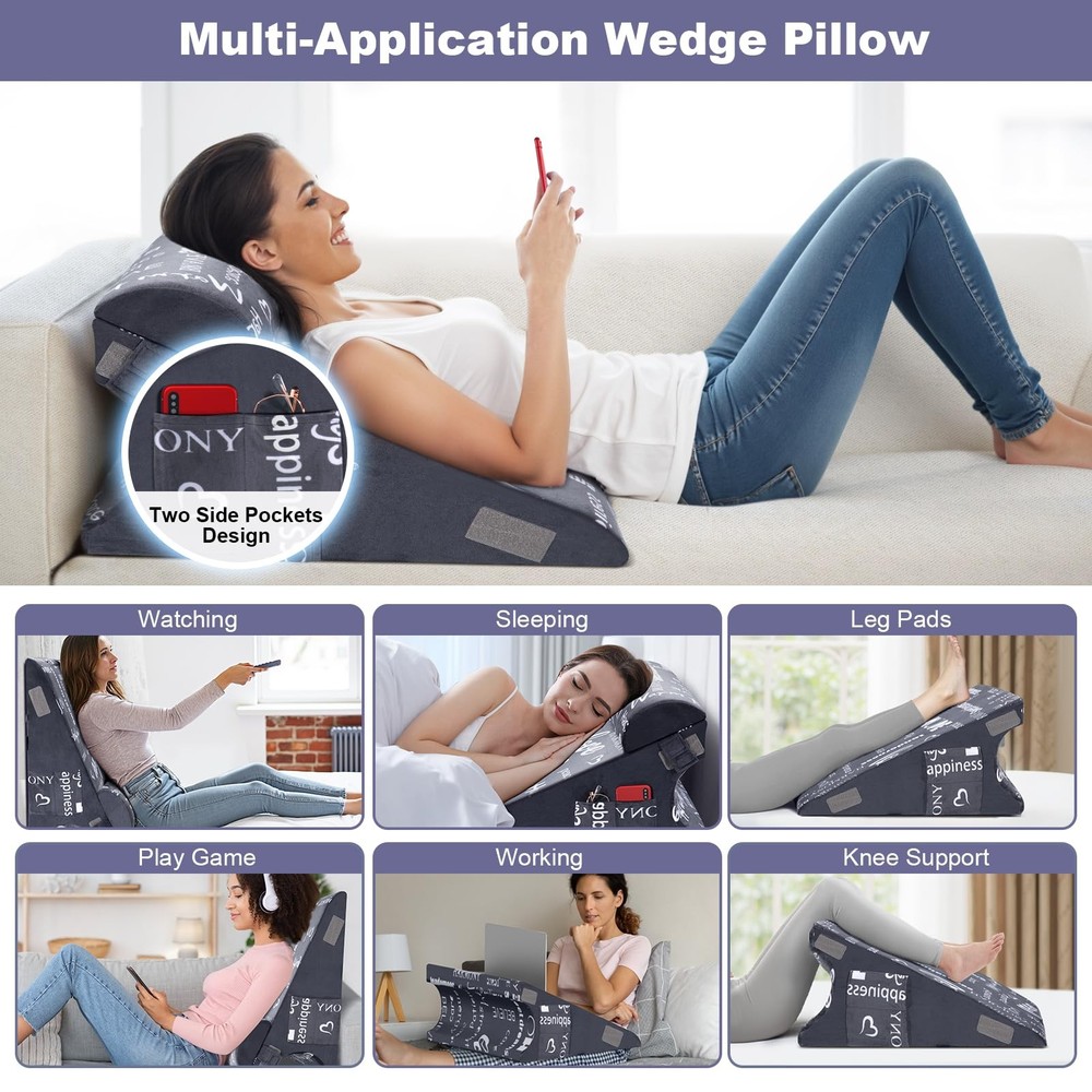 Wedge Pillow Bed Wedge Pillow & Half-Moon Knee Pillow Set: This set includes a 12" wedge pillow for sleep apnea (22" x 22" x 12"), designed for body support and full-body comfort, a bolster pillow for extra arm, leg, or neck support. Whether you're sleeping, lounging, or recovering, this partner provides customized comfort for a restful night's sleep Your Relief Companion: Don't let pain steal your peace! this elevated pillow wedge help alleviate acid reflux, GERD, back pain, snoring, and post-surgery discomfort Elegance Design and Positive Words: Your bedroom deserves elegance, not clinical vibes. This bed wedge pillow for sleeping features an artistic Eiffel Tower-inspired design with uplifting words to bring a touch of inspiration and positivity to your space. Removable zippered acid reflux pillow cover is machine-washable and hides the high-density foam core in style Dual-Layer Foam: Durable high-density base foam meets cloud-soft and cooling gel-infused memory foam top– built to hold its shape while cradling your body and reduce heat buildup. Non-slip PVC grip particles prevent shifting during use.Two side pockets hold remotes or other items A Thoughtful Gift For Loved Ones: Whether it's for relaxation, better sleep, or recovery, this wedge pillow for acid reflux relief is a great choice for anyone who deserves a little extra care