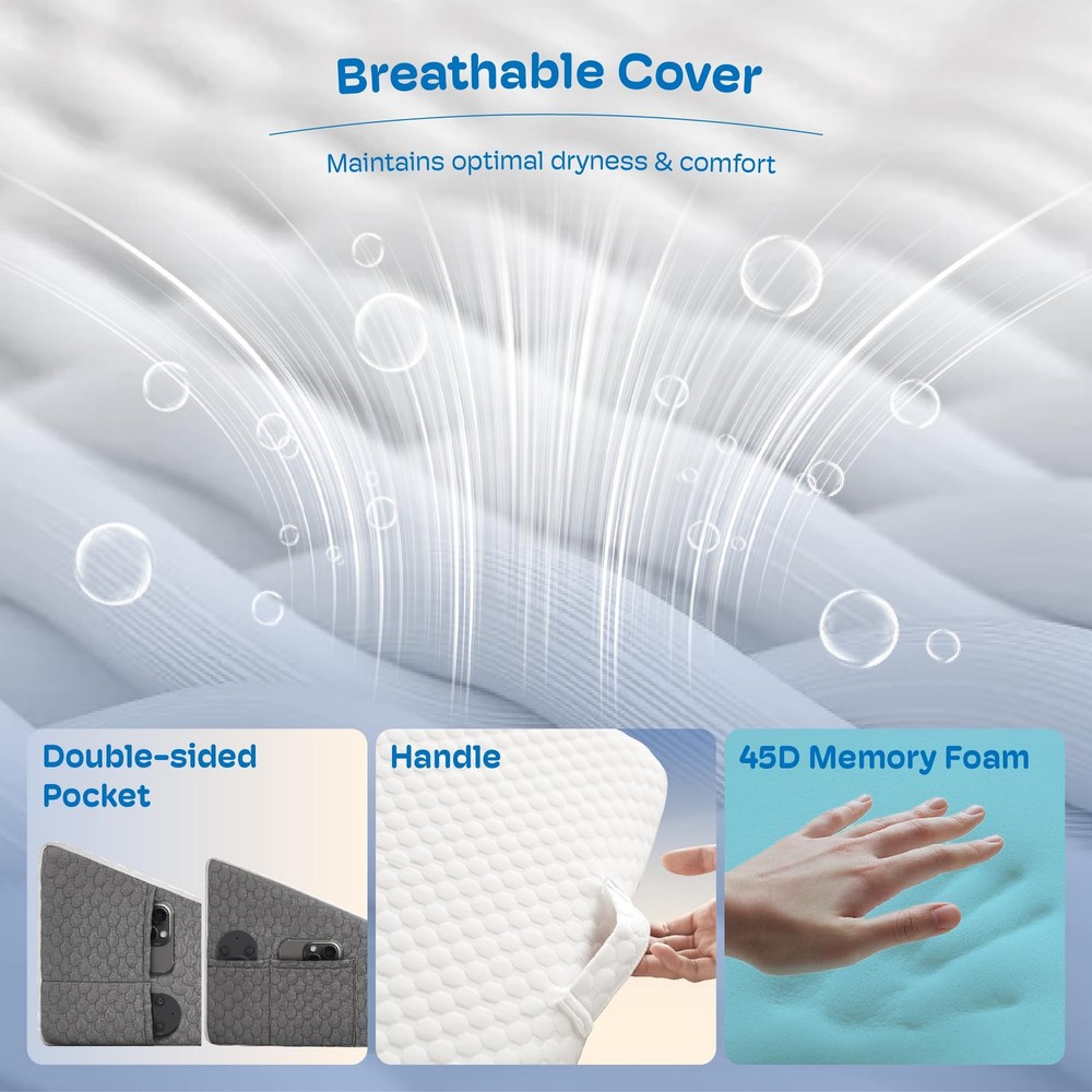 triangle wedge pillow bed gap filler queen king incline sleeping headboard sitting up post after surgery acid reflux memory foam wedge adults mastectomy orthopedic reading neck shoulder pain knee leg ankle elevation SUPER COMFORTABLE WEDGE PILLOW: Features 45D cooling gel-infused memory foam on top, offering a soft and slow rebound that ensures every inch of your skin fits snugly against the wedge pillow headboard. It also includes 25D high-density premium foam for reliable support. Available in 7.5-inch and 12-inch heights to meet your different needs (24 x 24 x 12). PORTABLE WEDGE PILLOW FOR BACK PAIN RELIEF: Portable carry handle for easy repositioning. Dual side pockets are designed to hold your glasses, remote control, mobile phone, and other belongings, so you don't have to worry about waking up and not being able to find them. MULTIPLE EFFECTS FOR ALL DISCOMFORTS: Are you still tired because you can't sleep well at night? This bed wedge pillow for sleeping also suitable for acid reflux relief (GRED), post-operative recovery, snoring, and heartburn. Additionally, it can help alleviate headaches, shoulder and neck pain, back pain, as well as leg and knee pain. Its mission is to make you more comfortable while resting or sleeping. MULTIPLE USAGE SCENARIOS: It's not just a bed wedge, but also a back pillow for bed sitting up or on the couch. It is the perfect companion for reading, using your phone, working, watching TV, or simply relaxing. QUALITY PILLOWCASE: The 280gsm Polyester fiber air layer pillow cover, combined with cooling gel-infused memory foam, keeps you dry and clean even on hot summer days. The anti-slip particle design ensures stability. Featuring a silky smooth zipper, the pillowcase can be easily removed and washed in the machine, making it simple to clean. Sleeping soundly throughout the night is the secret to staying energised the next day.