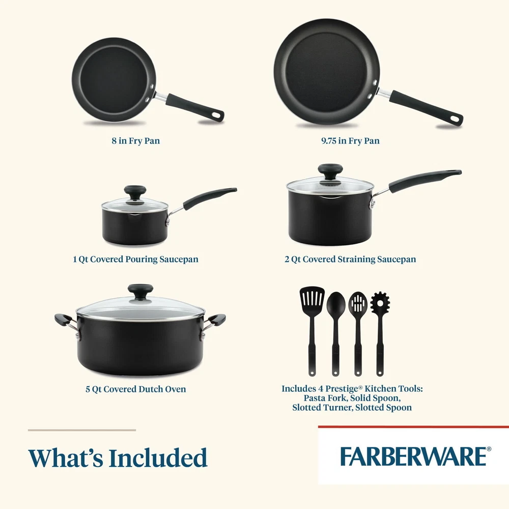 You may also like 28 Qt Clear Under Bed Plastic Storage Box Set of 4 Stackable Tote Bin With Lids 34.51 USD Free shipping 9-PCS Non-stick Cookware Set Pots & Pans Saute Pan Covered Dutch Oven with Lids 35.93 USD Free shipping High Back Ergonomic Mesh Office Chair W/ Adjustable Headrest & Armrests Chair US 164.96 USD Free shipping 10.5"x15" Flap Size Extra-Large Thermoplastic Pet Door with Telescoping Frame 80.37 USD Free shipping Automatic Pet Feeder 5 Meal Food Dispenser Wet/Dry Food w/Programmable Timer 83.06 USD Free shipping Laundry Hamper w/Lid 10L Wicker Laundry Baskets Foldable 2 Removable Liner Bags 61.03 USD Free shipping Outdoor Cat House with Insulated Liner Weatherproof Feral Cat Shelter for Winter 110.44 USD Free shipping Mini Reciprocating Sander USB Quick Charging Sanding Pen With 8pcs Sanding Head 55.83 USD Free shipping Medium 12" Black Metal Pillar Candle Holder Lantern Farmhouse Event Decoration 19.27 USD Free shipping Protector Series Single Scoped or Double Non-Scoped Rifle Case Range Gun Storage 68.69 USD Free shipping 40,000 BTU Pyramid Flame Glass Tube Propane Outdoor Patio Heater Tower w/Wheels 518.66 USD Free shipping Knife Sharpening Stone Set Dual Grit Whetstone Knife Sharpener w/Leather Strop 57.15 USD Free shipping The dishwasher-safe Farberware Easy Clean Aluminum Nonstick 12-Piece Pots and Pans/Cookware Set includes an essential assortment of pots and pans for everyday cooking. The set includes four Prestige nylon kitchen tools. Glass lids with easy-to-grasp knobs seal heat and moisture inside pots and pans during cooking. Oven safe to 350?F, the cookware is constructed from heavy-duty aluminum that heats quickly and evenly, reducing hot spots that can burn foods. Double-riveted handles help cooks move around the kitchen with confidence, and the nylon kitchen tools included are ideal for nonstick surfaces. The cookware set is dishwasher safe for the perfect combination of function and style. Hard Anodized Nonstick Cookware Set 17 Piece Oven Safe Pots and Pans with Lids 350.94 USD Free shipping 2 Pack Extra Strong Self-Sealing Bicycle Tube 16" X 1.75-2.125" Bike Inner Tube 21.54 USD Free shipping 650mAh Power 155 in 1 Mini Cordless Electric Screwdriver Set 3 Torque Settings 54.54 USD Free shipping Portrait Glass LED Aquarium Kit 5 Gallon Fish Tank Hidden Filtration Home Office 89.36 USD Free shipping 400-mm 5 x 18 magnification Telescope w/14-inch Aluminum Tripod Children Ages 8+ 41.92 USD Free shipping 3 Gal 3.5 Peak HP Wet/Dry Shop Vacuum Cleaner Carpet w/Swiveling Casters Blower 53.93 USD Free shipping Semi Automatic Espresso Machine Milk Frother WiFi Connected BuiltIn Bean Grinder 752.66 USD Free shipping Portable 25 QT Hard Sided Ice Chest Cooler Outdoor Camping Storage Coolers Green 73.7 USD Free shipping 20V 13" Brushless Variable Speeds String Trimmer with Rapid Reload Trimmer Head 129.57 USD Free shipping 25lbs Smart Stack Wide Handle Adjustable Kettlebell 40lb Strength Training Black 106.77 USD Free shipping Chrome Vanadium Steel 12-Piece Stubby Combination Wrench Set Mirror Polished US 19.37 USD Free shipping Electric Sausage & Brat Grill Hot Dog Roller Grill Cooker Warmer w/Oil Drip Tray 53.16 USD Free shipping