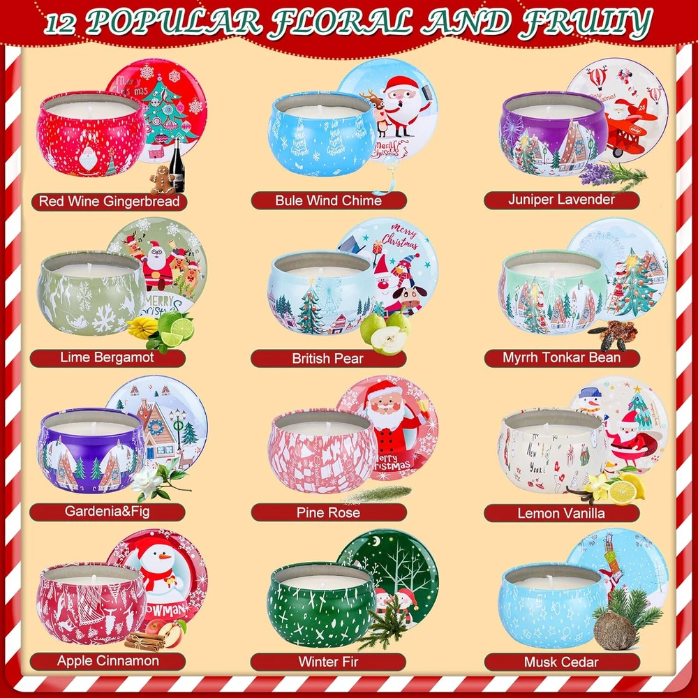 Store New Arrivals Add to Favorite View Feedback Contact Fast deliveries to the customer's home Quality customer service John Make the customers happy! 12PCS Christmas Scented Candles Gift for Women- Aromatherapy Candle for Home Scented-3.4Oz Soy Wax Birthday Gifts Christmas Presents for Mother Friend Wife Sister Xmas, Christmas Decorations Description 【12 CLASSIC POPULAR & COMFORTABLE FRAGRANCES】Our aromatherapy candle set come with 12 Fragrance Scents: Winter fir, Gardenia&Fig , Bule wind chime, Red wine gingerbread, Apple cinnamon, Lemon vanilla, Juniper lavender, lime bergamot, musk cedar,British Pear, pine rose, myrrh tonkar bean. Releasing your tension and promoting feelings of relaxation, preparing you for a better night's sleep. You can look at the bottom of the can to find out the scent of the candle. 【CUTE SIZE & LONG LASTING TIME】Each candle is about 3oz(Tin:0.5 oz, Soy Wax: 2.5oz) weight, 2.56"(6.5cm) diameter, 1.77"(4.5cm) height. The average lasting time is about 12 hours, nearly 144 hours total for 12 Packs. Tips: Trim the wicks to help increase lasting time. 【WIDE APPLICATIONS】Yoga candles, bath, dating, health care. portable cans with vintage plant-prints for travel, room decoration, accessories storing. It provides aromatherapy, creating mood enhancing atmospheres, relaxation for you and guests, effective in relaxing and relieving stress, suitable for people of all ages. 【PERFECT DEGIGN FOR CHRISTMAS GIFT】Our Beautiful scented candle set is designed for Christmas gift, packaged with a lovely red Christmas theme box. You can give it to your wife, friends, family, teacher or anyone you love in any festival suitable for all ages on Christmas holidays. 【Reusable Beautiful Tins】When the scented candles is completely burned, these tins can be reused to keep your small items, such as candies, stamps, plant, small decorations, toys or keys etc 12PCS Christmas Scented Candles, 2.5OZ Jar Candles, 12 Christmas Fragrances Candle Set for Women, Mom, Grandma, Godmother, Coworker, Teacher Item model number candle01 Wick Quantity 1 Number of Items 1 Pattern christmas Material Type Soy Wax Candle Type Container Candle Material Features Natural Theme christmas Scent Name Aromatherapy Item Dimensions W x H 0.1"W x 0.1"H Embellishment Feature christmas Are Batteries Included No Item Shape Round Unit Count 1.0 Count Subject Character christmas Product Dimensions 0.1"W x 0.1"H Container Type Can Model Name candle01 Seasons All Season Specific Uses For Product Aromatherapy, Decoration Indoor/Outdoor Usage Outdoor, Indoor Batteries are Included No Country of Origin China Item Weight 1.6 ounces Color Red Indoor Outdoor Usage Outdoor, Indoor Container Material Tin Shape Round Scent Aromatherapy Style Name christmas Numeric Theme Number 1 ABOUT US We offer the best prices around on high quality products. Our E-store includes media such as books, movies, music and games while offering electronics, toys, sporting apparel, clothing, tools, general home, garden items and more. SHIPPING We are always working hard to ensure your package arrives as soon as possible. Please understand that some factors like weather, high postal traffic, and the performance of shipping companies are outside of our control. We offer free shipping to the lower 48 states and ship within 2 business days of payment, usually sooner. We do not accept P.O. Boxes. Please provide a physical address. For shipping outside of the continental USA, we only use eBay's Global Shipping Program. The item is shipped to KY and then sent to the rest of the world. International customers are responsible for all duties and taxes. Continue to 'check out' to calculate costs for shipping the item to your country. Messages regarding eBay's Global Shipping Program MUST be directed at eBay EXCLUSIVELY. RETURNS We offer a 30-Day Return Policy on items in which you are not completely satisfied with. You have the option of a full-refund or an exchange of the item. No returns are available on items shipped outside of the USA PAYMENT We accept PayPal. CONTACT US This page content is yet to come Please ad us to your favorite seller and visit again later Thank You CUSTOMER SATISFACTION We try our very best to make sure every customer is completely satisfied. If there's a problem, message us! We're happy to help. WE ACCEPT