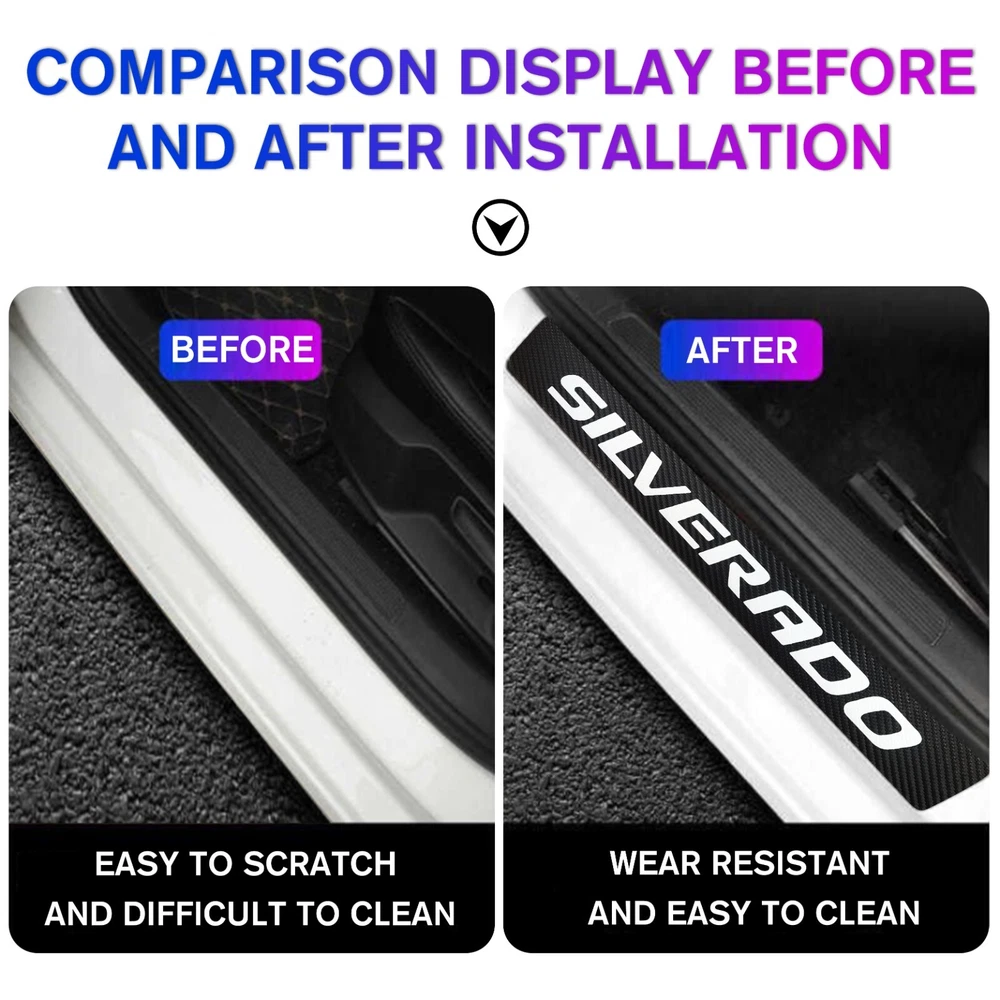 Door Sill Scuff Cover Stickers Made of high quality Carbon Fiber Textured Faux Leather, Anti Scratch and abrasion resistant, durable and effective in protecting car door sills. Easy Installation: P lease wipe the car door sill clean before installing, to ensure that there is no oil and dust first, then remove the protective paper on the back of the sticker, gently stick on the door sill above to ensure that no air bubbles are generated. Simple Maintenance: When the car door sill protector reflective sticker is stained with dirt or oil, simply wipe it with a damp rag and it will look like new with a gentle wipe. Door Cup Stickers & Door Handle Stickers Material: Carbon Fiber Texture Vinyl Stickers + Epoxy Resin Self adhesive , won’t fall of easily, will keep your door cups looking like new, without changing the appearance in any weather. No more scratches to the door handle cups Easy to Install: Clean car door handle cup and let it dry, then tear off the protector film from adhesive backing, stick film onto the cup and adjust the perfect position. Package Included : 4PCS Door Sill Scuff Cover Stickers (2 Front + 2 Rear) 4PCS Door Cup Stickers 4PCS Door Handle Stickers
