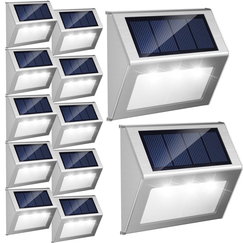 Upgraded Solar Panel - Charge Faster: Solar step lights come with upgraded 2V larger solar panel, the 18% solar conversion rate is higher than other solar lights, ensuring high charging efficiency and saving charging time. The deck light can illuminate for up to 8 hours when fully charged, which is longer and brighter than other solar lights on the market. Waterproof & High Quality Metal: Outdoor solar step lights With waterproof rating and high-impact resistance, long lasting construction. our Stainless Steel light body which avoid long-term outdoor exposure under extreme weather and causing cracking or deformation and provide fine illumination on a rainy or cloudy day. Unlike plastic lampshades, remains free from yellowing and corrosion, ensuring long-lasting performance. Enjoy hassle-free landscape lighting once installed. Wireless & Easy Installation Fence Lights: Just screws or double-sided tape can fasten the solar deck lights to any flat surface like fence, wall, step edge, stair handrail, railing, etc. The solar fence lights have no messy wires and can be installed without professional workers. Wide Application - Perfect Outdoor Lighting: The small size solar deck lights can be installed anywhere outdoor. Moderate size, no need to worry about tripping. Perfect for lighting garden, patio, yard, backyard, courtyard, terrace, balcony, frond door, porch, pathway, walkway, sidewalk, stairway, entrance, deck, fence, stair, step, wall, also use decorating your outside house, it is a good choice for Easter, Halloween, Thanksgiving Day, Christmas. Tips: please make sure nothing shades your solar lights and expose them to full sun for 8 hours before starting installation.
