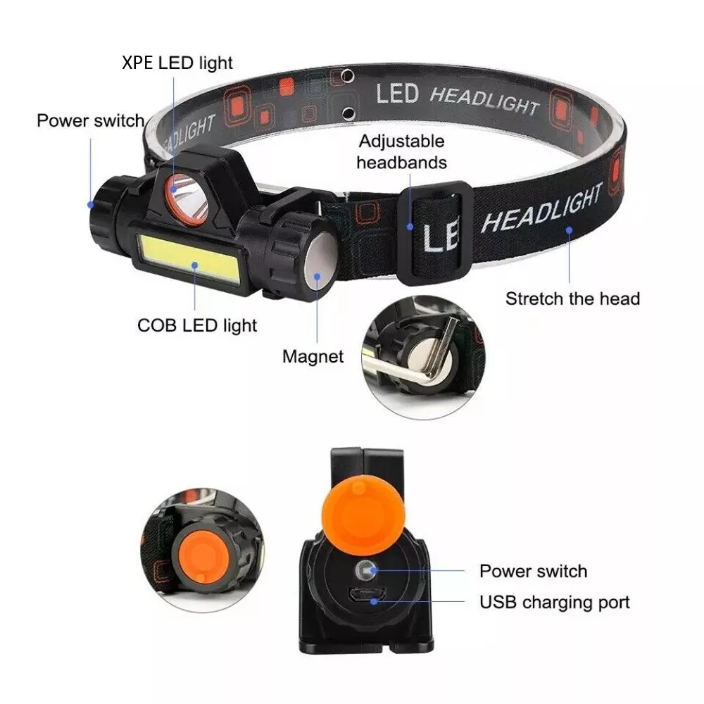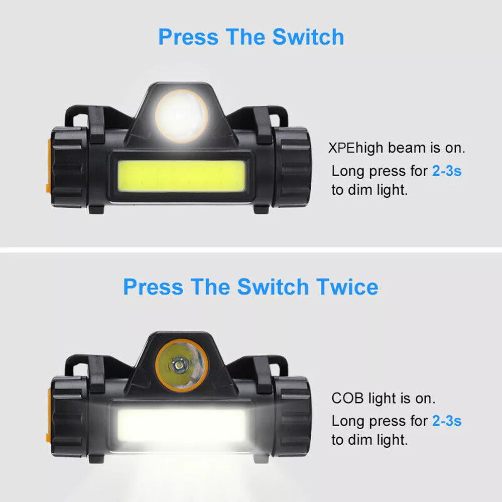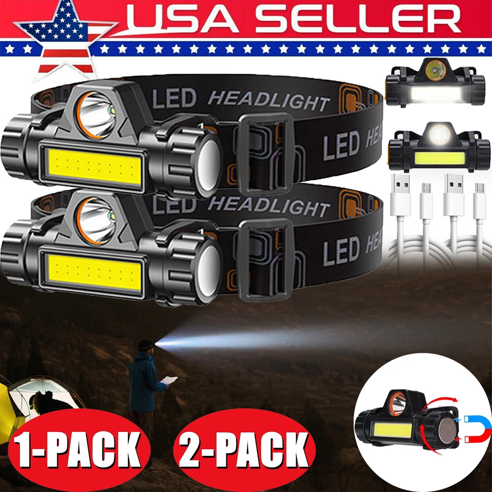 1-2Pack USB Rechargeable Waterproof LED Headlamp Headlight Head Light Flashlight Features: ✅【EASY TO USE】Single-button design with two light resources: Spotlight and Floodlight. In any mode, if you hold the power button for 3 seconds, you can easily adjust the brightness of this led rechargeable headlamp to meet your different lighting needs. ✅【SUPER BRIGHT & RECHARGEABLE】The headlamp flashlight has the maximum brightness of 1000 lumens, easily light up an entire tent, room and road. The rechargeable head light can last for 4-6 hours after full charge and allow you to charge and turn on the light at the same time. ✅【LIGHTWEIGHT & WATERPROOF】Weighing only 2.5oz and IPX5 waterproof rate, the headlamp is perfect for anyone who needs a led headlamp whether it is raining or snowing, indoors or outdoors. It is also a great rechargeable headlight for running, hiking, camping, climbing, fishing, hunting, etc. ✅【ADJUSTABLE ANGLE & STRAP】The head lamp can be adjusted downward by 90 ° and tightly fixed to avoid shaking and sliding when running. The led head flashlight uses comfortable elastic headband, which can easily adjust the length to perfectly fit your head size. It is a perfect headlamp for adults and kids. ✅【MAGNETIC & DETACHABLE】Designed to solve lighting challenges from any angle, the usb rechargeable headlamp body also easily detaches from the head strap and mounting bracket to become a versatile handheld flashlight with a built-in magnetic base for attachment to metallic surfaces. Specification: Type:Head Light Flashlight Material: ABS Color: Black Lamp bead model: XPE+COB Luminous lumen: XPE150LM+COB200LM Waterproof grade: life waterproof Range: approximately 300m Gear: 2 gears Angle adjustment: 90 ° Number of LED beads: 1 XPE+16 COB Input voltage: MICRO USB 5V power supply Charging time: 6.5h Power: 5W Battery Capacity:800 mAh Mode: Main light XPE always on+Side light COB always on Package includes: 1-2 X COB flashlight Headlight 1-2 X micro USB Charging cable 1-2 X Packaging box Shipping Payment Return & Refund policy Feedback Customer Support - Contact Shipping FREE SAME BUSINESS DAY MONDAY- FRIDAY SHIPPING FROM USA. All orders and payments received before 4PM EST (1PM PST) will be shipped the same business day. All other orders within 1 business day. No shipping on Weekends or US Public Holidays. No responsibility for any custom duty Shipping information will be updated when available. Payment We accept payment via PayPal. Use PayPal at checkout to pay with credit or debit. Immediate payment is required. Shipping will be arranged within 1 business day once payment is cleared. Return & Refund policy 1.We stand behind our items and offer 60 days warranty. All items are in new and working condition unless specified otherwise elsewhere in the description. 2.All Returns - defective or otherwise - MUST BE PREAUTHORIZED to guarantee refund or exchange. Please contact us to get an authorization and return address. 3.Buyer agrees to pay for the cost of re-shipment for undeliverable or wrong addresses. 4.Buyer is responsible for Return Postage as well as a 20% restocking fee if return/replacement is not a result of our mistake such as wrong item. 5.Replacement or Refund will be made upon receipt of the returned item. Please include tracking number so we can process ASAP. If you do not wish to wait for a replacement, please repurchase the item. 6.ALL REFUNDS will be processed via PayPal. Please double check via PayPal history and transaction for confirmation. PayPal will send it back to whatever you used to pay within 3-5 days. Feedback We strive to provide the best products and services. If anything about your transaction did not meet expectations, please CONTACT US and give us the opportunity to make things right. We are always here to help. Customer Support - Contact Please do not hesitate to CONTACT US. You can message 24/7 on eBay for all questions and inquiries. We will get back to you within 1-2 business days at the latest.