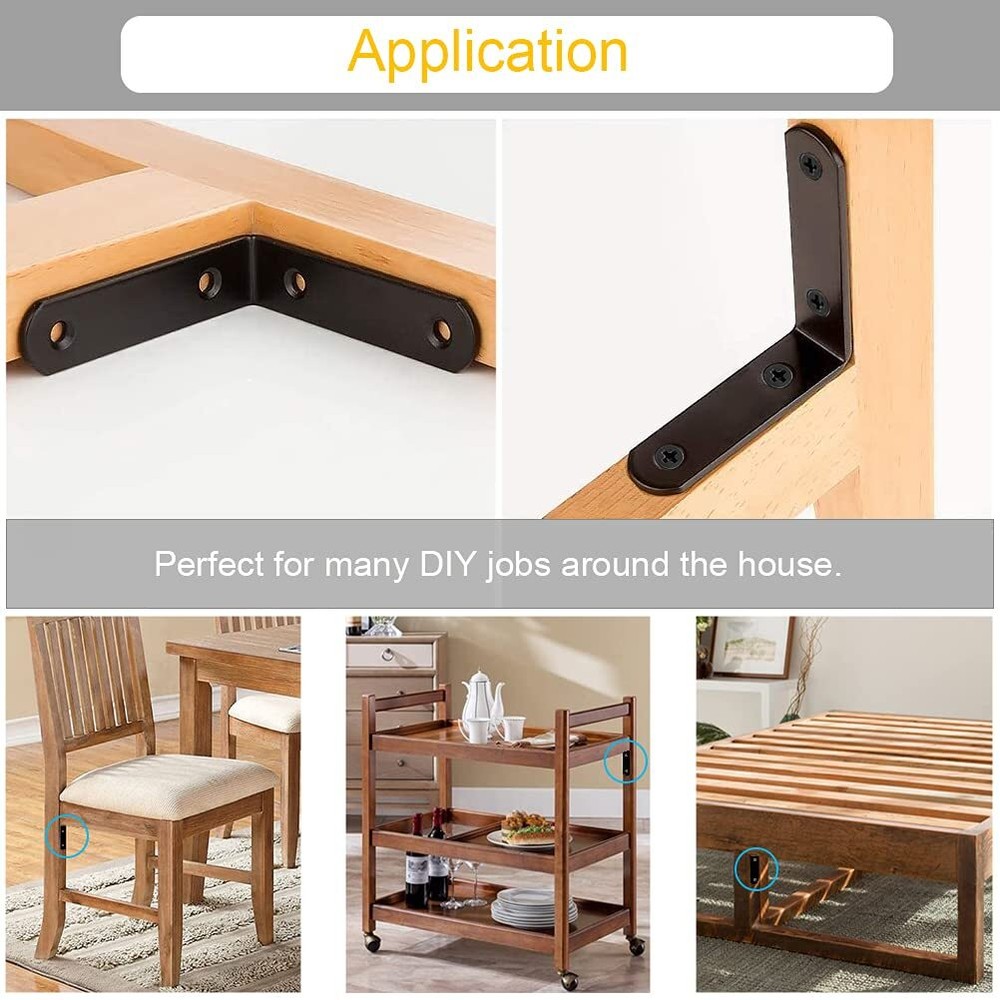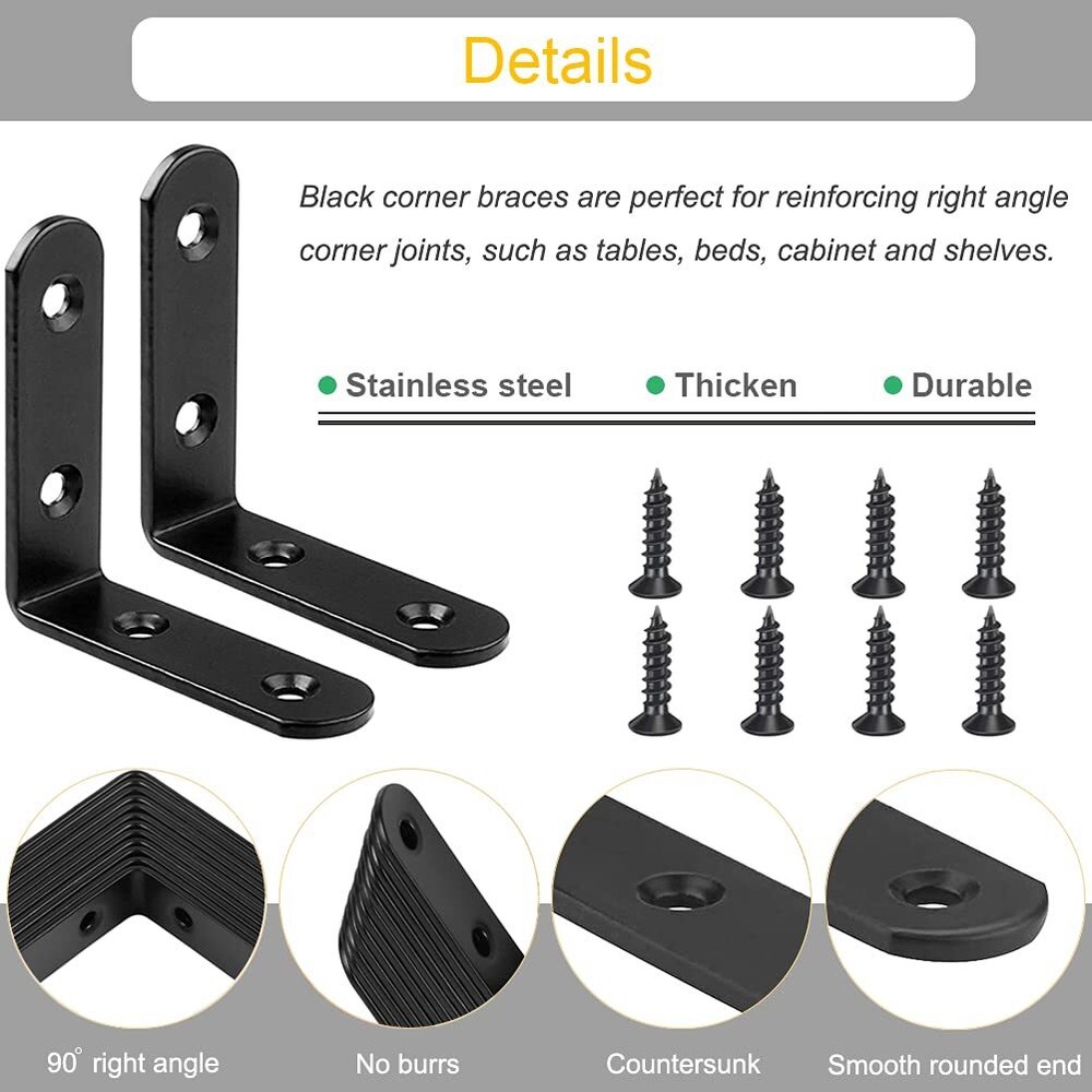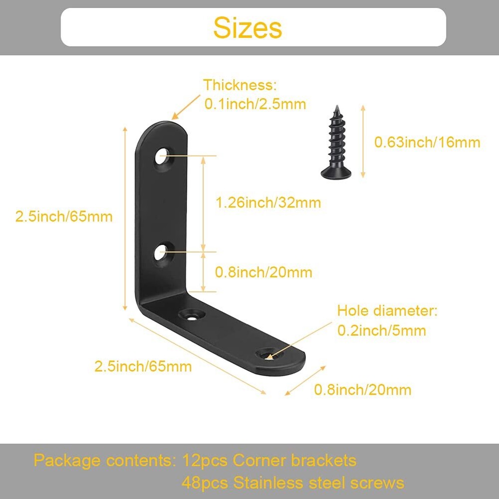 L BRACKET FEATURES: Ours black corner braces and screws are made of high-quality 304 stainless steel with high temperature baking coating, Rust-resistant, Round end, No burrs, Counterbore designed, Safer and more strong. METAL BRACKET SIZE: 2.5" x 2.5" x 0.8"/ 65*65*20MM, Thickness: 0.1"/ 2.5MM, Hole Dia: 0.2"/ 5MM. Max. load support: 50lbs / A pair shelf brackets. WIDE APPLICATIONS: 90 degree joint brackets can fasten wooden bed, table, chair, cabinet, shelf, wardrobe, bookshelf. EASY TO INSTALL: The package includes the mounting screws. You just need to make sure that the right angle brackets are perpendicular to the furniture and use screwdriver or electric drill to fix the hardware bracket in a breeze. PACKAGE CONTENTS: 12 x Black corner brackets, 48 x Stainless steel screws. Meet your daily requirements to make furniture parts stay firm.