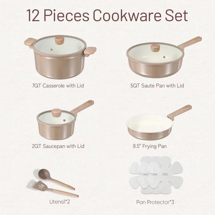 Crafted with a non-ceramic coating, our cookware brings high level non stick performance and elevate your cooking experience. The smooth ceramic coating doesn’t trap any food or sauce, and clean with just a quick swipe or rinse, keeping your cookware looking brand new. Our cookware is free from harmful chemicals such as PFOA, PFAS, PTFE, lead and cadmium. With its robust design and high-quality ceramic coating, our cookware is built to withstand everyday cooking. While it's designed for durability, its non-stick surface ensures easy cleaning and consistent performance, meal after meal. provides 12 months from the date of purchase. Please don't hesitate to reach out if any quality problem. You will be guaranteed to get satisfying solution. Set includes: 8.5"fry pan, 2-qt saucepan with lid, 5-qt sauté pan with lid, 7-qt casserole with lid, soup ladle, slotted spatula, 3*pan protectors.