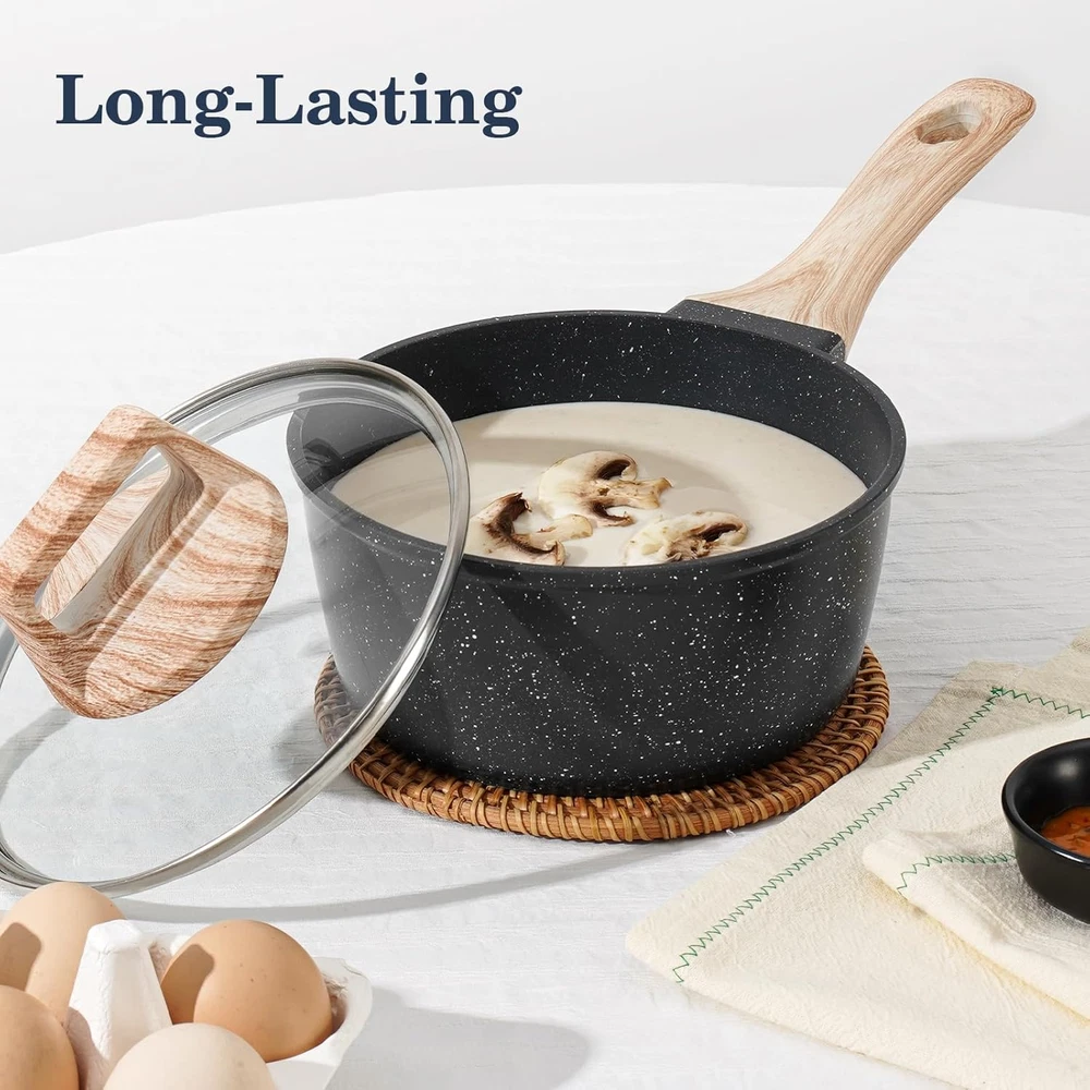All-in-One Cookware Set – From frying and boiling to simmering and sautéing, this nonstick pots set includes frying pan, saute pan, casserole, milk pots and pan protectors. Simplify your kitchen with this complete pots and pans set—thoughtfully curated to cover all your daily cooking needs. Safe, Non-Toxic Cookware You Can Trust - Designed for healthier, worry-free cooking. Crafted with a durable granite non-stick coating free from harmful chemicals like PFOS, PFOA, lead, and cadmium, this pots and pans set ensures your meals are as clean and wholesome as the ingredients you use. Nonstick Performance for Effortless Cooking – Featuring a high-quality nonstick coating, food slides off effortlessly without sticking or burning, so you can cook with less oil and enjoy healthier meals every day. Easy to Clean – Spend Less Time Scrubbing, More Time Cooking. Simply wipe with a sponge or rinse under water to clean these pans sets—no soaking, no scrubbing, no stress. Die-Cast Aluminum Construction –Engineered for even heat distribution and long-lasting durability, each piece is crafted from premium die-cast aluminum that heats up quickly and cooks food evenly—eliminating hot spots and ensuring consistent results. Compatible with All Stovetops – This pots and pans set non stick is designed to perform flawlessly on all stovetops—including gas, electric, ceramic, glass, and induction. Stay-Cool Handles & Secure Lids – Ergonomic, heat-resistant handles provide a comfortable grip, while tempered glass lids lock in moisture and flavors. Product Description