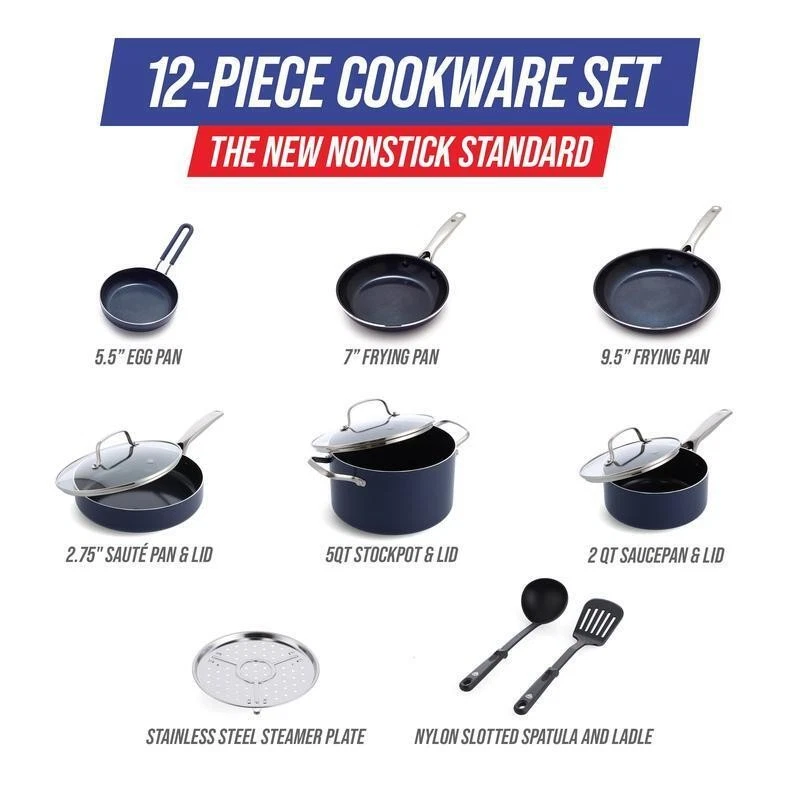 You may also like Non-Stick Granite 12-Piece Cookware Set Multi-Cooktop Essential Kitchen Tools US 49.92 USD Free shipping 12-Piece Non-Stick Cookware Set Induction Safe Ergonomic Handles Protectors New 142.44 USD Free shipping Lightweight 7 Piece Non-Stick Cookware Set Dishwasher Safe Easy Clean Aluminum 26.42 USD 27.81 USD Free shipping 5% off 15-Piece Non Stick Cookware Set Colorful Heat Resistant Lacquer Dishwasher Safe 145.58 USD Free shipping 24 Piece Nonstick Aluminum Cookware Set Kitchen Essentials Includes Utensils New 108.75 USD Free shipping Lightweight 7 Piece Non-Stick Aluminum Cookware Set Green Sage Dishwasher Safe 26.42 USD 27.81 USD Free shipping 5% off 20 Pcs Cookware Set Fry Pan Griddle Cooker Dishwasher Safe Nonstick Easy Care US 124.8 USD Free shipping Ceramic Non-Stick Frypan Set Eco-Friendly Cookware 8 10.5 Inch Thermo-Spot New 39.02 USD 41.07 USD Free shipping 5% off 12 Piece Non-Stick Cookware Set Ceramic Fry Pans Stock Pot Induction Safe New 69.31 USD 72.96 USD Free shipping 5% off Stainless Steel Durable Stock Pot Lid Tempered Glass Oven Safe Dishwasher Safe 41.3 USD 43.47 USD Free shipping 5% off Nonstick Granite Cookware Set 12PC Aluminum Pots Pans Kitchen Essentials New 116.62 USD 122.76 USD Free shipping 5% off Nonstick Aluminum Cookware Set 22 Pieces Easy Clean Dishwasher Safe Durable New 69.5 USD 73.16 USD Free shipping 5% off The new standard in non-stick cookware, every Blue Diamond 12-Piece Toxin-Free Ceramic Nonstick Pots and Pans Cookware Set features an ultra-durable diamond-infused coating that is 5x harder, lasts 10x longer, and transfers heat 4x faster than traditional non-stick coatings. It's even metal utensil safe. This 12-piece cookware set is dishwasher, oven and broiler safe. Lightweight and ultra-durable, this set includes 5. 5-inch mini frypan, 7-inch and 9. 5-inch open frying pans, 2-quart covered saucepan, 2. 5-quart covered sauté pan, a 5-quart covered stockpot (3 glass lids included), stainless steel steamer plate and 2 black nylon multipurpose cooking utensils that won’t warp or scratch. Blue Diamond Set, 12-Piece: 12-Piece Cookware Set: Includes 7-inch and 9-inch open frying pans, 2-quart covered saucepan, 2. 5-quart covered skillet, a 5-quart covered stockpot (3 glass lids included), mini egg pan, metal steamer and 2 black nylon multipurpose cooking utensils that won't warp or scratch. Toxin-free ceramic non-stick cookware set Diamond-infused non-stick coating creates an ultra-durable layer that's 5x harder and 10x longer lasting than traditional coatings Toxin-free: manufactured without PFAS, PFOA, lead or cadmium, so you don't have to worry about them ending up in your food 12-piece cookware set is metal utensil safe Heats 4x faster than traditional coatings for more even cooking, effortless food release and easy cleanup Suitable for gas, electric, halogen and ceramic stove tops Kitchen cookware set is oven and broiler safe Please note: metal handles may become hot; use caution while cooking Dishwasher safe You may also like 16" Indoor Oscillating Pedestal Fan Adjustable Portable Cooling Tilt-back Office 33.31 USD 35.06 USD Free shipping 5% off Unscented Cat Litter Low Dust Clumping Odor Control Activated Charcoal 35lb Pail 27.03 USD 28.45 USD Free shipping 5% off Electric Kettle 1L Fast Boil Auto Shutoff 360 Degree Swivel Base LED Indicator 27.93 USD 29.4 USD Free shipping 5% off Large Storage Bin 90 Quart Stackable Clear Plastic Container W/ Lid 2 Pack New 28.82 USD 30.34 USD Free shipping 5% off 3 Gal Poly Wet Dry Vac Workshop Vacuum Cleaner Carpet Car Shop Cleaning Portable 52.76 USD 55.54 USD Free shipping 5% off Lightweight Bagless Vacuum Powerful Suction Multi Surface Cleaner W/ Tools New 58.62 USD 61.7 USD Free shipping 5% off Folding Step Stool 2-Step Lightweight Portable Non-Slip Secure Easy Storage New 50.76 USD 53.43 USD Free shipping 5% off Mini Fridge One Door Energy Efficient Reversible Shelves Office Dorm Adjustable 173.64 USD 182.78 USD Free shipping 5% off 62 Qt Airtight Plastic Bin Storage Containers Stackable Tote w/Sealed Blue Lid 42.73 USD 44.98 USD Free shipping 5% off 12 Piece Combination Wrench Set Metric Chrome Vanadium Steel Mirror Polished New 18.23 USD 19.19 USD Free shipping 5% off Full Strength Carpet Cleaning Solution 128 oz. Pure Essentials AH31965 38.28 USD 40.29 USD Free shipping 5% off Suction Cup Coat Hooks White Aluminum No Drilling Movable for Key Shower Kitchen 29.43 USD 30.98 USD Free shipping 5% off