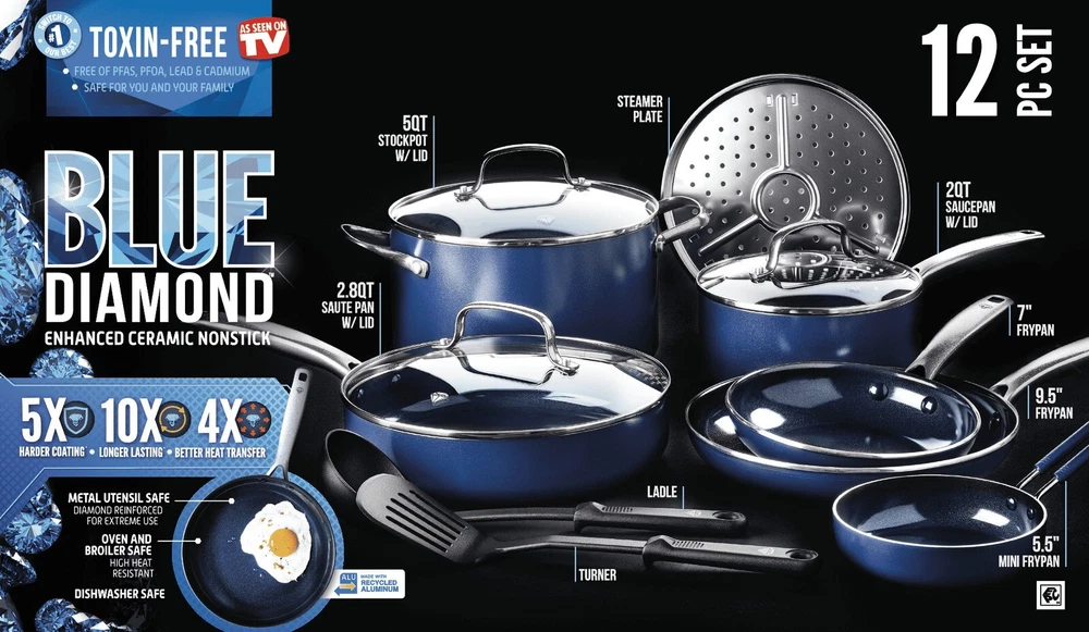 You may also like 12-Piece Non-Stick Cookware Set Induction Safe Ergonomic Handles Protectors New 142.4375 USD Free shipping 24 Piece Nonstick Aluminum Cookware Set Kitchen Essentials Includes Utensils New 108.75 USD Free shipping 20 Pcs Cookware Set Fry Pan Griddle Cooker Dishwasher Safe Nonstick Easy Care US 124.8 USD Free shipping Non-Stick Granite 12-Piece Cookware Set Multi-Cooktop Essential Kitchen Tools US 49.925 USD Free shipping Nonstick Granite Cookware Set 12PC Aluminum Pots Pans Kitchen Essentials New 116.62 USD 122.76 USD Free shipping 5% off Nonstick Aluminum Cookware Set 22 Pieces Easy Clean Dishwasher Safe Durable New 69.5 USD 73.16 USD Free shipping 5% off 12 Piece Non-Stick Cookware Set Ceramic Fry Pans Stock Pot Induction Safe New 69.31 USD 72.96 USD Free shipping 5% off Stainless Steel Durable Stock Pot Lid Tempered Glass Oven Safe Dishwasher Safe 41.3 USD 43.47 USD Free shipping 5% off Ceramic Non-Stick Frypan Set Eco-Friendly Cookware 8 10.5 Inch Thermo-Spot New 39.02 USD 41.07 USD Free shipping 5% off 15-Piece Non Stick Cookware Set Colorful Heat Resistant Lacquer Dishwasher Safe 145.58 USD Free shipping Lightweight 7 Piece Non-Stick Aluminum Cookware Set Green Sage Dishwasher Safe 26.42 USD 27.81 USD Free shipping 5% off Lightweight 7 Piece Non-Stick Cookware Set Dishwasher Safe Easy Clean Aluminum 26.42 USD 27.81 USD Free shipping 5% off The new standard in non-stick cookware, every Blue Diamond 12-Piece Toxin-Free Ceramic Nonstick Pots and Pans Cookware Set features an ultra-durable diamond-infused coating that is 5x harder, lasts 10x longer, and transfers heat 4x faster than traditional non-stick coatings. It's even metal utensil safe. This 12-piece cookware set is dishwasher, oven and broiler safe. Lightweight and ultra-durable, this set includes 5.5-inch mini frypan, 7-inch and 9.5-inch open frying pans, 2-quart covered saucepan, 2.5-quart covered sauté pan, a 5-quart covered stockpot (3 glass lids included), stainless steel steamer plate and 2 black nylon multipurpose cooking utensils that won’t warp or scratch. Blue Diamond Set, 12-Piece: 12-Piece Cookware Set: Includes 7-inch and 9-inch open frying pans, 2-quart covered saucepan, 2.5-quart covered skillet, a 5-quart covered stockpot (3 glass lids included), mini egg pan, metal steamer and 2 black nylon multipurpose cooking utensils that won't warp or scratch. Toxin-free ceramic non-stick cookware set Diamond-infused non-stick coating creates an ultra-durable layer that's 5x harder and 10x longer lasting than traditional coatings Toxin-free: manufactured without PFAS, PFOA, lead or cadmium, so you don't have to worry about them ending up in your food 12-piece cookware set is metal utensil safe Heats 4x faster than traditional coatings for more even cooking, effortless food release and easy cleanup Su itable for gas, electric, halogen and ceramic stove tops Kitchen cookware set is oven and broiler safe Please note: metal handles may become hot; use caution while cooking Dishwasher safe You may also like Cucumber Eye Pads 24 Count Hydrating Under Eye Treatment Puffiness Relief New 14.61 USD 15.38 USD Free shipping 5% off Indoor Weight Hairball Care Dry Cat Food Chicken Brown Rice 7lb Kibble Natural 23.36 USD 24.59 USD Free shipping 5% off 12 Inch Kids Bike W/ Training Wheels EVA Tires Easy Assembly Durable Safe New 83.64 USD 88.04 USD Free shipping 5% off Electric Digital FM Alarm Clock Radio W/ Dual USB Charging Ports Battery Backup 25.7 USD 27.05 USD Free shipping 5% off 20 Piece Stainless Steel Flatware Set Service 4 Durable Elegant Design New 43.41 USD 45.7 USD Free shipping 5% off 14pc Shower Curtain Set W/ Hooks Liner Embossed Dot Design Machine Washable New 24.82 USD 26.13 USD Free shipping 5% off Square Coffee Table Ottoman Stain Resistant Indoor Seating Natural Wood Legs New 164.9 USD 173.58 USD Free shipping 5% off Lawn Garden Tire 11X4.00-5 Straight Rib Non-Radial Load Range B Turf Use 39.95 USD 42.05 USD Free shipping 5% off Dog Baby Gate Doorway Safety Metal Pressure Mount Self-Closing Swing Gate New 70.66 USD 74.38 USD Free shipping 5% off Solid Wood Folding Luggage Rack Heavy Duty Straps Storage Shelf Easy Transport 54.98 USD 57.87 USD Free shipping 5% off Set of 3 Indoor Outdoor Metal Plant Stands Rustic Nesting Flower Holders New 80.09 USD 84.3 USD Free shipping 5% off Industrial Metal Wall Mirror Rustic Home Décor Square Frame W/ Keyhole Hanging 81.28 USD 85.56 USD Free shipping 5% off