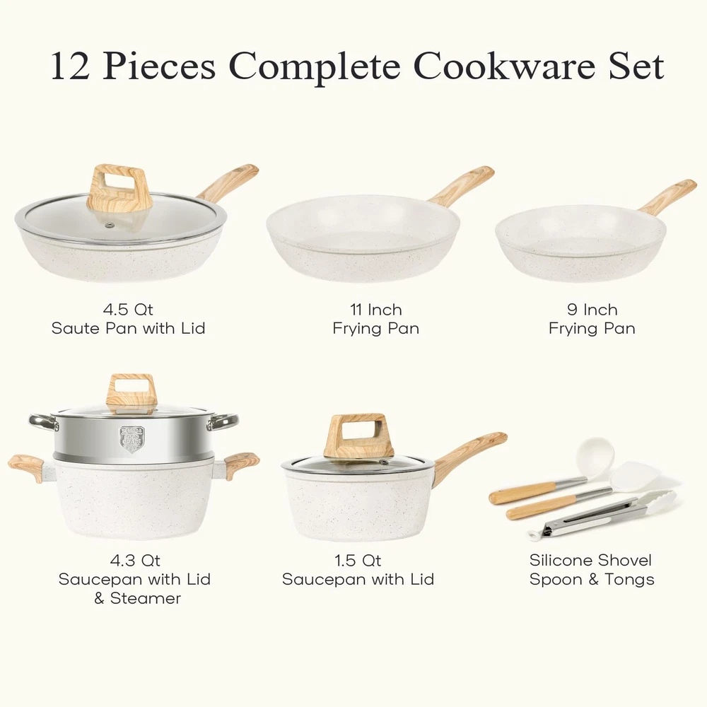 Cooking Made Extraordinary: Unlock Your Kitchen's Potential with Pots and Pans Set. Versatile Cooking Essentials: This kitchen cookware set includes a wide range of pots and pans, ideal for sautéing, frying, simmering, and more. Superior Non-Stick Coating: Effortlessly release food with minimal oil, making cooking and cleanup a breeze. Durable Construction: Made with heavy-duty materials for long-lasting performance and even heat distribution. Versatile Cooking: Whether you have gas, electric, or induction cooktops, these pots and pans are designed to work seamlessly on any surface. Heat Distribution: The even heat distribution ensures consistent cooking results, eliminating hot spots and promoting efficient cooking. Healthy Granite Cookware Sets - SGS approved. Non-toxic, free of PFAS, PFOA, PFOS, lead, cadmium and other toxic substances that can leach into food, ensures effortless food release and healthier meals. Naturall Nonstick Coating - Granite non-stick of pots and pans set is healthier and scratch-resistant with excellent food release. Cooking requires less oil for a healthy, low-fat diet. Even Heating & Superior Performance – Crafted with durable materials for quick and even heat distribution, preventing hot spots for perfect cooking results. Suitable for all stovetops, including gas, electric, and induction for added convenience. Easy to Clean – Spend less time scrubbing. Simply wipe with a paper towel or rinse with water, hand washing is recommended as it cleans effortlessly after every meal. Stay-Cool Handles & Secure Lids – Ergonomic, heat-resistant handles provide a comfortable grip, while tempered glass lids lock in moisture and flavors. It is not recommended to put a pan with a handledirectly into the oven or dishwasher. Stainless Steel Steamer – Pots and pan set nonstick comes with a high-quality steamer, ideal for steaming vegetables for prepare baby food, seafood, and dumplings while preserving nutrients. 12-Piece Induction Cookware Set - includes 9 inch/11 inch frying pans, 11 inch/4.5QT saute pan with lid,4.3 QT saucepan with lid and steamer,1.5 QT saucepan with lid and silicone shovel spoon & tongs ideal for your daily cooking.