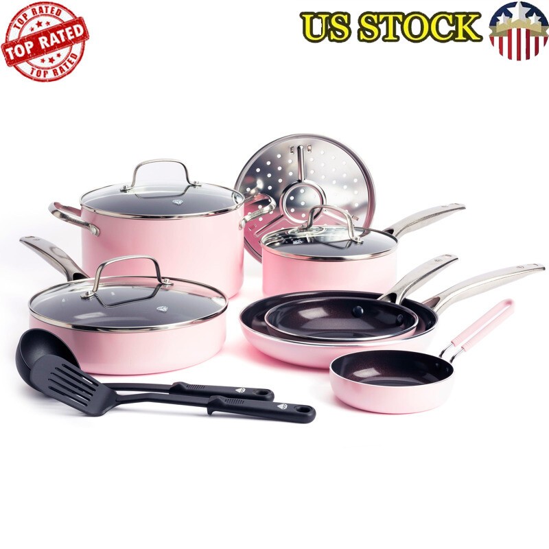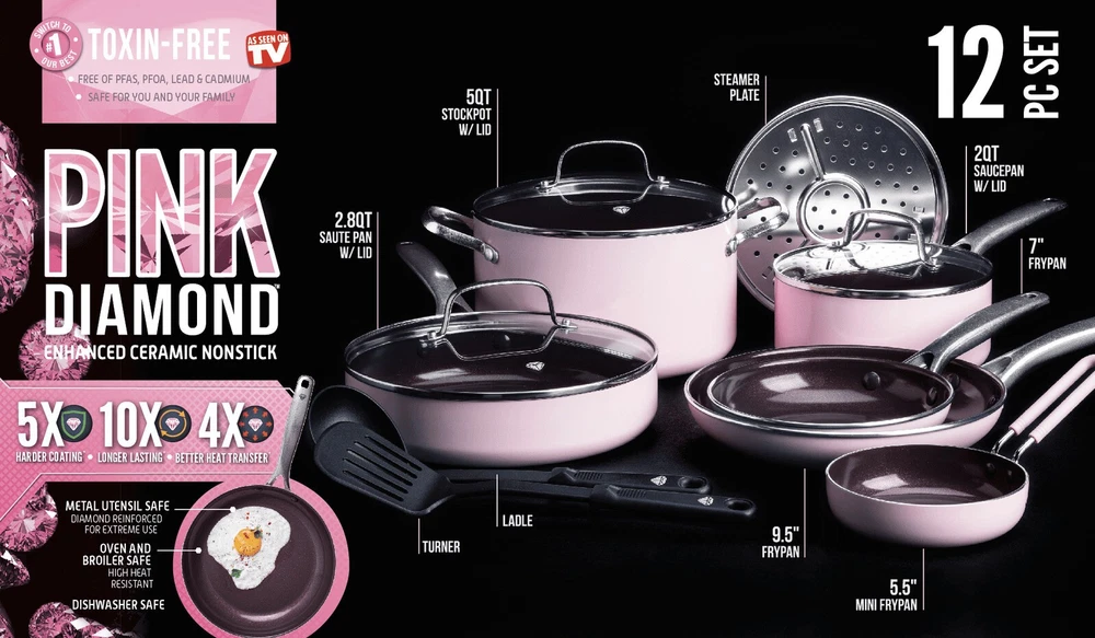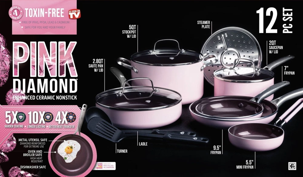 You may also like 10 Pcs Cookware Set Saute Pan Deep Saute Dutch Oven W/ Lid Non-Stick Cooking New 62.03 USD 65.3 USD 19.99 USD 5% off 11pcs Nonstick Cookware Set Ceramic Coated Induction Gas Safe Easy Clean New 66.59 USD 70.09 USD 19.99 USD 5% off 12pc Nonstick Aluminum Cookware Set W/ Fry Pan Saucepan Dutch Oven Bakeware New 93.72 USD 98.65 USD 19.99 USD 5% off 10 Piece Nonstick Cookware Set Induction Kitchen Utensils Durable Heat Cookware 60.54 USD 63.73 USD Free shipping 5% off Nonstick Aluminum Cookware Set 8pcs Bakelite Handle Kitchen Cooking Essentials 86.33 USD 90.87 USD Free shipping 5% off 12 Piece Non-Stick Cookware Set Aluminum Ceramic Kitchen Cooking Essentials New 143.34 USD 150.88 USD Free shipping 5% off 18-Piece Nonstick Ceramic Cookware Set Soft Grip Dishwasher Safe Healthy Cooking 58.09 USD 61.15 USD Free shipping 5% off 7 Piece Nonstick Cookware Set Carbon Steel W/ Glass Lids & Bakelite Handles New 47.5 USD 50.0 USD Free shipping 5% off 10 Piece Nonstick Cookware Set Dishwasher Safe Riveted Cool Handles Glass Lids 61.94 USD 65.2 USD Free shipping 5% off 12-Piece Toxin-Free Nonstick Cookware Set Dishwasher Safe Durable Easy Cleanup 109.82 USD 115.6 USD Free shipping 5% off 12pcs Nonstick Aluminum Cookware Set Fry Pan Saucepan Dutch Oven Bakeware Green 93.72 USD 98.65 USD Free shipping 5% off 12 Pc Non Stick Cookware Set Pots Pans W/ Lids Handles Cooking Tools Kitchen New 94.92 USD 99.92 USD Free shipping 5% off Whether you’re setting up a new kitchen or expanding your collection, the Pink Diamond nonstick 12-piece cookware set includes everything you need to create amazing meals—morning, noon, and night. Set includes: 7” and 9.5” frypans, 5.5” egg pan, 2-quart saucepan with lid, 2.75-quart sauté pan with lid, 5-quart stockpot with lid, Stainless steel steamer plate, Nylon slotted spatula, and ladle. Discover nonstick that can take the heat (up to 600°F) with a scratch-resistant surface that stands up to metal utensils! Crafted from aluminum, Pink Diamond cookware heats quickly and evenly for exceptional results every time. You’ll love how the signature diamond-infused ceramic nonstick releases effortlessly, so you can cook without all the excess oil. Clear glass lids let you keep an eye on food without releasing heat and moisture. Plus, the toxin-free nonstick coating contains no PFAS, PFOA, lead, or cadmium, so it’s safe for you and the environment. Breeze through clean up with a little soap and water or simply it in the dishwasher. Oven and broiler safe to 600°F, glass lids up to 425°F. Compatible with all cooktops, except induction. Set includes 7? and 9? frypans, 2-quart saucepan with lid, 2.75-quart saut? pan with lid, 5-quart stock pot with lid, and two black nylon multipurpose cooking utensils Signature diamond-infused ceramic nonstick is 5x harder, lasts 10x longer, and transfers heat 4x faster than traditional nonstick ? You may also like Natural Rubber Doormat Non-Slip Durable 18"X30" Indoor Outdoor Eco-Friendly Mats 57.0 USD 60.0 USD Free shipping 5% off 3/8" X 50' Weatherproof Air Hose Workshop Garden Flexible Heavy-duty Industrial 34.96 USD 36.8 USD Free shipping 5% off Truck Cart Folding Steel Frame Shifter Multi Position Handle Durable 300 lbs New 86.35 USD 90.89 USD Free shipping 5% off Locking File Cabinet W/ 2 Drawers Rolling Wheels Office Storage Organizer MDF US 106.82 USD 112.44 USD Free shipping 5% off 6ft Rod Reel Combo Fast Retrieve All-Metal Gears Bite Alert Fishing Outdoor US 37.67 USD 39.65 USD Free shipping 5% off 4-Shelf Plastic Garage Shelving Rack Organizer Storage Shelves Standard Duty US 31.93 USD 33.61 USD Free shipping 5% off 12 Inch Oscillating Tabletop Fan 2 Speed Adjustable Airflow Portable Indoor Use 26.12 USD 27.49 USD Free shipping 5% off Tools 5-Piece Ratcheting Wrench Set SAE Precision Steel Alloy Resist Corrosion 24.33 USD 25.61 USD Free shipping 5% off C Shape Metal End Table C Table Side Table Space Saving Home Office Use Black US 40.99 USD 43.15 USD Free shipping 5% off Snow Blower 24" Scraper Bar Replacement Shave Plate Fits Multiple Models New 33.65 USD 35.42 USD Free shipping 5% off 3 Qt Enameled Dutch Oven Induction Cooktops Broil Bake Kitchen Cast Iron Red New 94.89 USD 99.88 USD Free shipping 5% off Ingenuity Keep Cozy 3-in-1 Vibrating Baby Bouncer and Rocker 71.15 USD 74.89 USD Free shipping 5% off