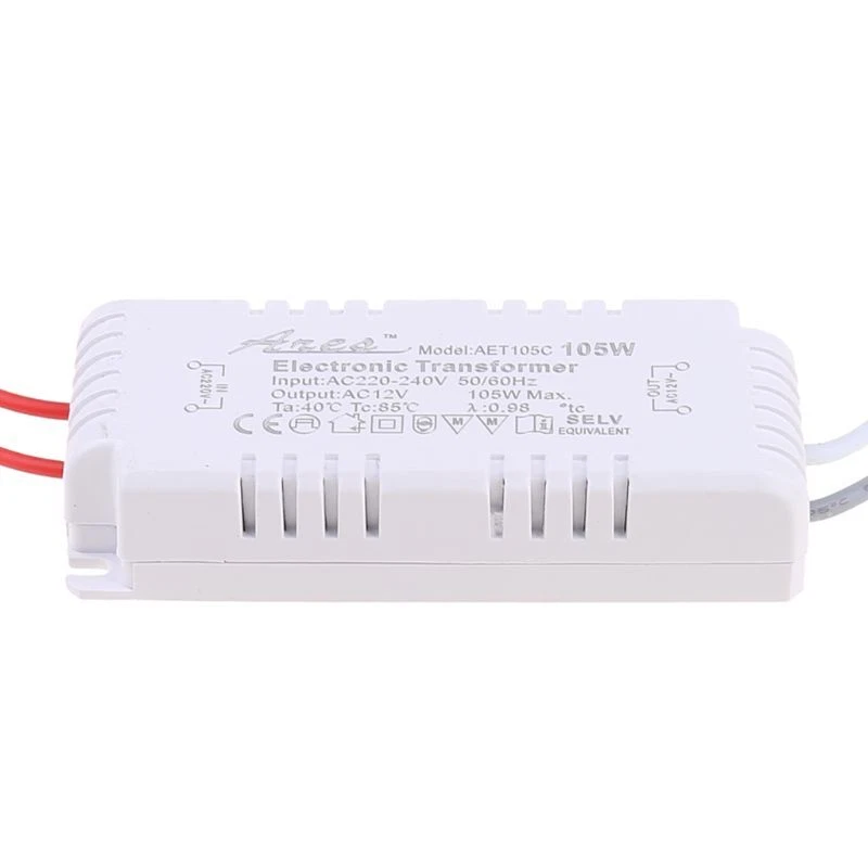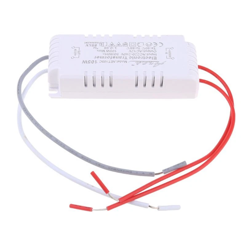 brand new and high quality 105 Watts Power 12V Output Use for low lighting , Change from 220V/240V to 12V lamps for low 12V (Halogen) Decoration lighting for malls, family room lighting, can also be used for bar lights. Note: The input line IN :220-240V 50/60 HZ output lines (gray lines and white lines) OUT: 12V Ta:40℃ 85℃ Size: 9.5cm x 4cm x 2cm (L x for x (approx)
