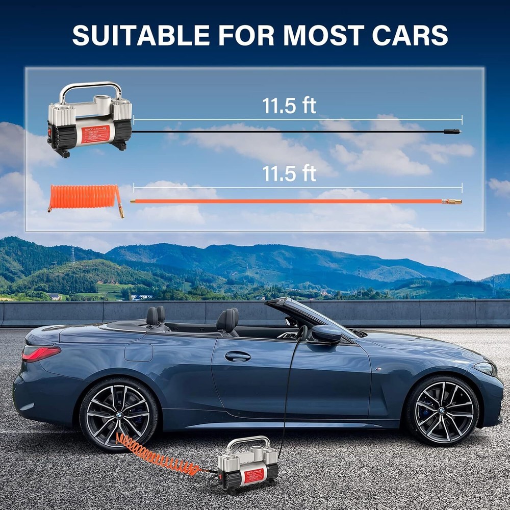 Product Description Silver Tire Inflator Heavy Duty Double Cylinders with Portable Bag- Car Accessories,Metal 12V Air Compressor Pump 150PSI with Adapter for Car, Truck, SUV Tires, Dinghy, Air Bed etc 【FAST INFLATION】: Heavy Duty Double cylinder design,maximum pressure 150PSI, air flow 70L/min, inflates standard vehicle tire in 1.5 minutes (200/70/R18, 0-40psi) 【STABILITY TECHNOLOGY】: Rubber feet to make sure the 12V air pump stays where it is placed and does not move around during operation ,make the air compressor more powerful,effectively reduce the vibration and noise 【DOUBLE CYLINDERS DIRECT DRIVE INFLATION PUMP】: In the direct drive of the motor, the two cylinders at the same time compressed air, powerful and fast inflatable, direct drive motor makes the drive low rotating speed, high efficiency, compact, quiet,stability, and easy to control 【WORKS】: particularly suitable for SUVs, trucks, vans, RVs, crossovers, MPVs, campers,Auto, trailers, minivans, also can use for cars, motorcycles, golf carts, bicycles, and more 【TRAVEL GIFT 】: During your car trip, carry our little air compressor, which is easy to use and keep your tires in good condition.You can buy a little tire inflator as a gift to your friends or family. About Us We are a reputable seller with many years of experience selling on eBay. Our goal is to provide high-quality products and excellent customer service. Shipping Items will be shipped within 1-3 business days when we received payment. (Orders are not processed on weekends & holidays) Tracking information will be sent once item is shipped. Delivery time depends on destination and other factors Item is shipped to ebay address. Leaving correct address can minimize delay. For international shipping and shipping to Guam, Hawaii and Alaska, Please contact us before placing the order. International buyers please note: Import duties, taxes and charges are not included in the item price or shipping charges. These charges are buyer’s responsibility. We will try our best to reduce the risk of the custom duties. Local pick-up is unavailable at the moment. Contact Us We reply any email messages within 1 business / working days(off-duty at weekend). If you do not get a response from us, then please check your junk or spam mailbox. Our Business hours: Mon-Fri 9:00-18:00, UTC/GMT +8 hours. Please contact us either by clicking "contact seller" in the "purchase history" section or simply click "ask a question" at the bottom of this page. If you are unsatisfied with our item or service, please contact us before leaving any feedback. We are committed to resolve all issues in a friendly and satisfactory manner.