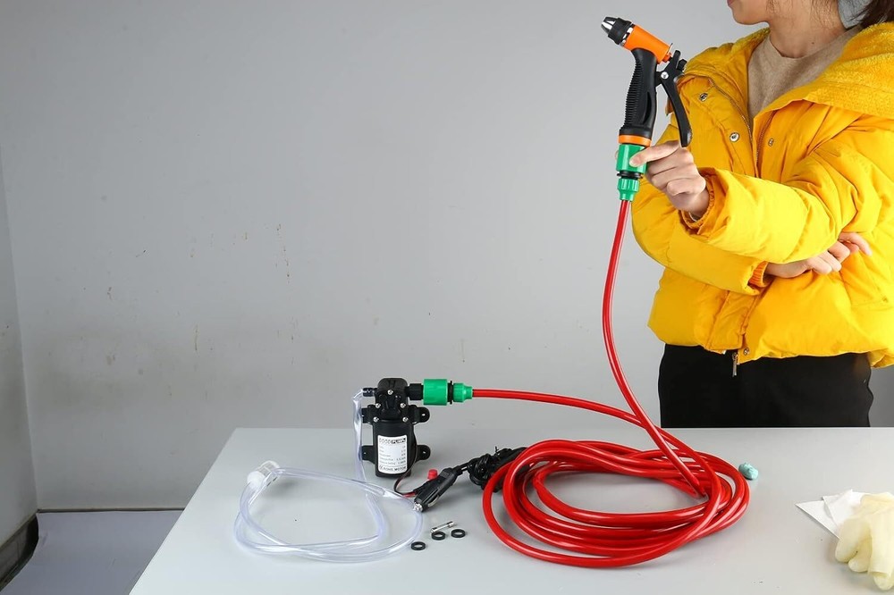 Amarine Made Electric Washer Pump Kit,12V Portable High Pressure Water Pump with 23.6" PVC Pressure Hose and Independent Power Switch,Wash Device for Auto RV Marine,Home,Garden,Vehicles Specifications For 100W,160PSI Washer Pump Kit Voltage: DC 12V Pump Amps: 8.4A Rated power: 100W The Largest Flow: 7.5L/MIN Pressure Setting(max): 160PSI / 1.1MPA Car cigarette charger line length: 3M PVC Pipe with Connector length:6M Transparent water inlet pipe length: 1.2M * Safe and reliable:12V low voltage power source,protect the auto circuit;Wide applications:vehicles, doors and widows,air-conditon clearance and so on. * Car cleaning machine with automatic pressure switch, as long as the gun is not out of water, the motor does not work, save water and to avoid the loss of the machine. * Ideal for car washer, car cigarette charger with over-current protection function with a spare cigarette lighter fuse. What's in the box 1 X Water Pump 1 X High Pressure Water Gun 1 X 1.2m Pipe with Water inFilter 1 X 3m Power line(independent power switch) 1 X 6m PVC Pipe with Connector (Water Out) 1 X Spare Connector 1 x Backup Fuse 1 X User Manual Attention Please * Pay attention to the water pump, water direction.The car washer should be placed in the dry place * The New Pump have some water inside due to factory test, every pump will undergo a rigorous test before put on the market * Please choose different rated power washer kit according to your need