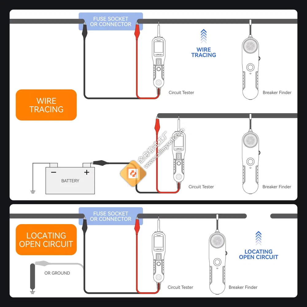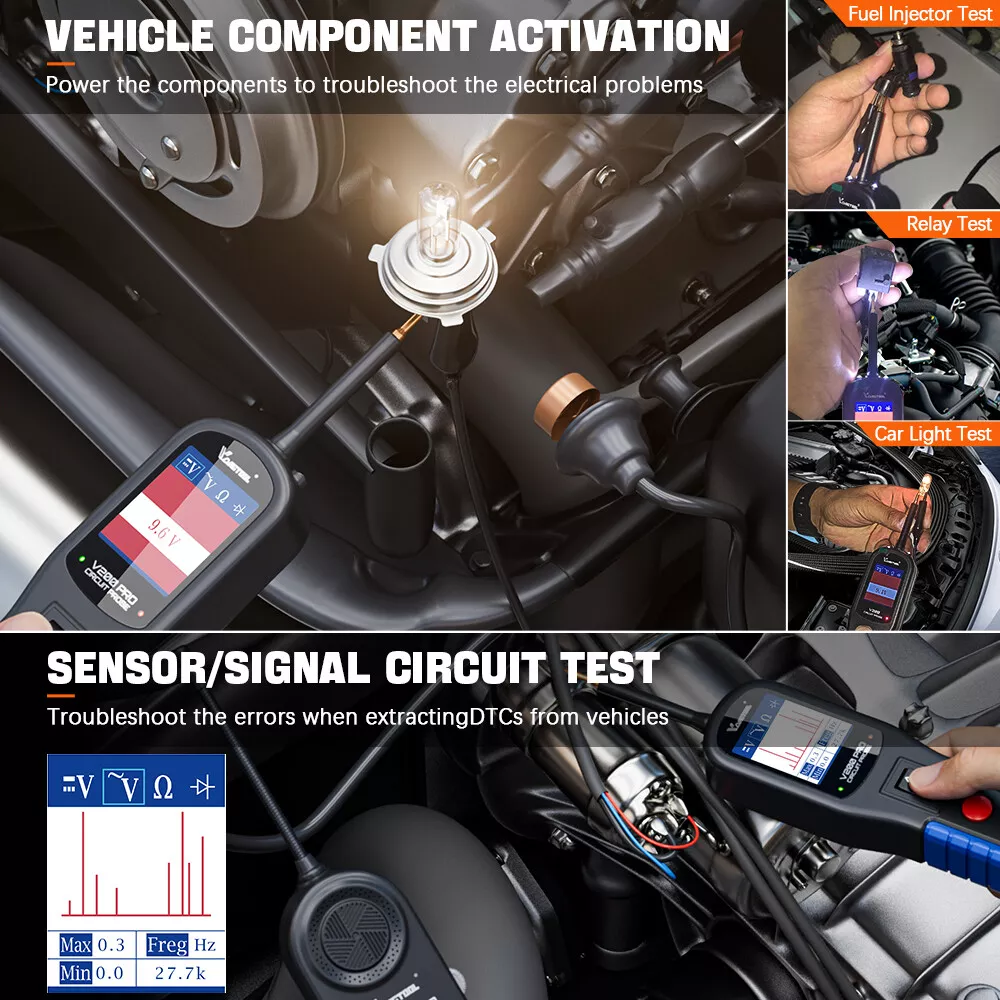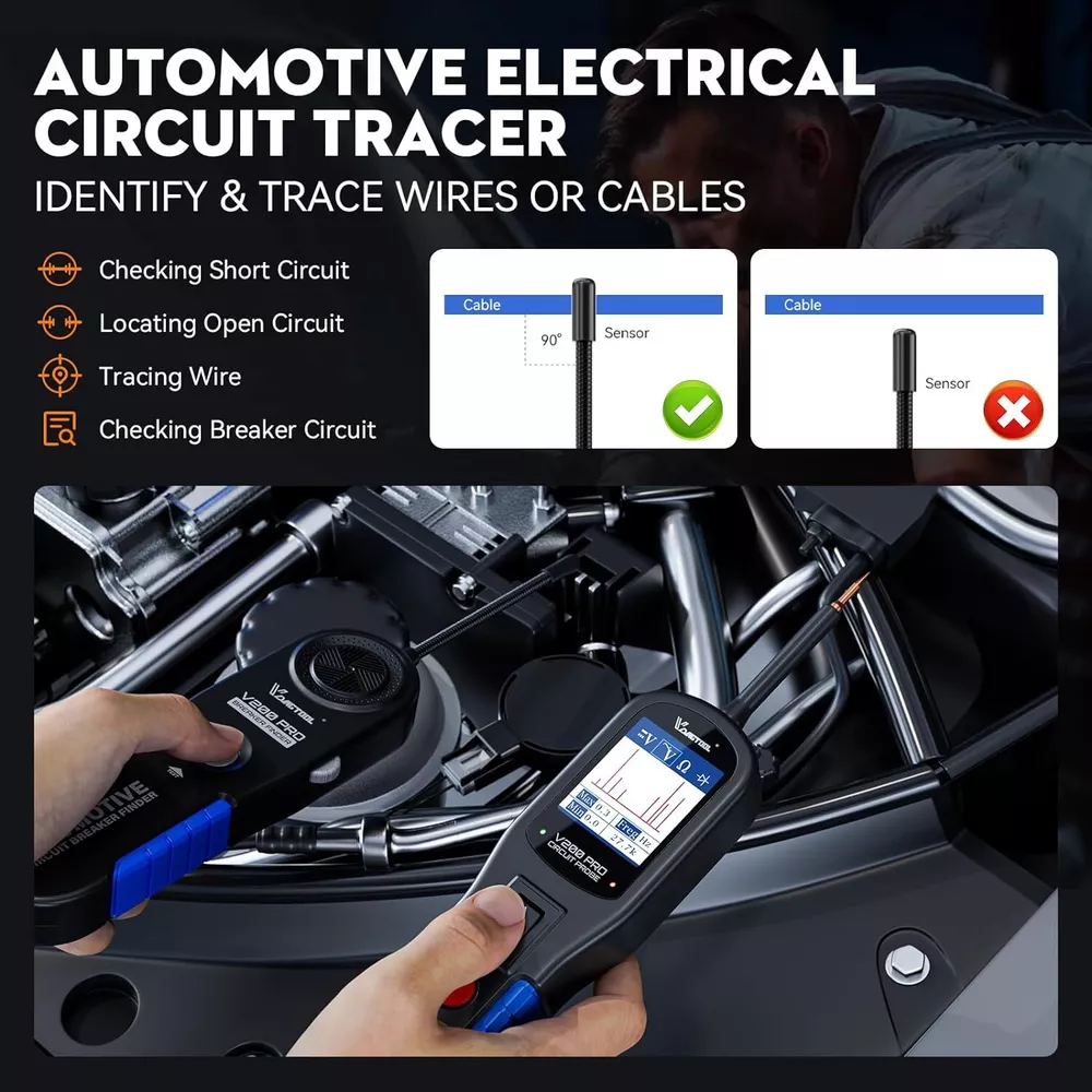 VDIAGTOOL V200 Pro Automotive Power Circuit Probe Tester Breaker Finder Tool Set 👋Dual combination mode helps you to check complex automotive circuits faster. Mode1️⃣: Monitoring of circuit data values. Normal component measurements do not exceed a reasonable range. Mode2️⃣: Circuit problem localization. Accurate indication of fault points through audible alarms to assist in repairs. 12V 24V Car Electrical Circuit Tester Power Probe 6 Meter AVO Diagnostic Tools V200Pro Automotive Circuit Tester : All-in-One Solution for Circuit Troubles 💯 (🥳🥳 🥳 2024 NEW Upgraded Set 🥳 🥳 🥳 ) 💯 >>> Product Overview - “V200 Pro” The V200Pro Automotive Circuit Tester is a testament to innovation, combining advanced detection techniques with user-friendly design. It's the ultimate solution for identifying and resolving issues such as wiring degradation, component failures, and poor connections. With the V200Pro, you'll have a clear and comprehensive understanding of your vehicle's electrical health. II. Core Features 🔥 Component Activation for Precise Testing The V200Pro power circuit tester generates activation signals by directly contacting components through the power supply current. With its probes, you can effortlessly determine the condition of various components like lamps, motors, windshield wipers, radiator fans, and relays. Plus, it tests sensors and signal circuits, pinpointing the root cause of electrical issues extracted from vehicle ECUs. 💡 Dual-Head Lighting & Clear LCD Display Equipped with a lighting function, this electrical test pen supports testing in low-light environments. The V200 circuit tester also features a high-resolution LCD digital backlight display, ensuring clear and visible readings, day or night. 🛡️ Overload Protection for Safety This automotive electrical tool boasts short circuit protection. In case of an overload, it automatically shuts down and restarts, safeguarding both the device and your car's electronics. Tip: Utilize the overload protection feature for convenient short circuit testing. Note: For any defective or malfunctioning units, reach us at ebay message for a hassle-free replacement. 🌐 Extended Reach with 20FT Cord The V200Pro circuit tester comes with a 20-foot cord and an additional 20-foot extension cord. Coupled with its cigarette lighter power source and a convenient alligator clip for grounding, you can test electrical systems anywhere around the vehicle, without worrying about cord length. 🌟 Comprehensive Solution for Auto Electrical Testing The V200Pro offers a two-in-one solution. Switch effortlessly between the power circuit probe tester mode and the circuit breaker finder mode with just one click. No need for extra tools to check cable/wire continuity or diagnose break points. This versatile and efficient circuit instrument is ideal for DIYers, electricians, and technicians alike. III. Product Highlights: Dual Modes for Comprehensive Circuit Diagnostics 🔧 Mode 1: Circuit Data Monitoring Ensure your components are performing within optimal ranges. Mode 1 offers four cyclic operating modes for comprehensive monitoring: ➊ DC Voltage Measurement: Precisely read DC voltage with a resolution of 0.1 volts. ➋ AC Voltage Measurement: Capture maximum and minimum voltage readings, along with frequency and duty cycle data. ➌ Resistance Measurement: Determine the resistance between the tester's tip and the auxiliary ground lead. ➍ Diode Measurement: Assess diode health by reading its resistance value. Any readings outside the acceptable range indicate diode damage, signaling for a timely replacement. 🔎 Mode 2: Fault Localization Pinpoint circuit issues with ease. Mode 2 utilizes audible alarms to accurately guide you to fault points, simplifying the repair process. ❗ Important Note: Mode 2 (Circuit Breaker Tester) is powered by a 9V battery. If persistent fuse blowing indicates a short-circuit in your vehicle's wiring, combine the V200Pro with DTC reports and our V210-Wire Finder. This powerful combination quickly identifies fault locations, revealing the underlying causes of electrical problems. The breaker finder function effortlessly locates open connections, broken wires, and current leaks, indicated by tone changes. It even traces wires/cables without damaging insulation. This versatile tool is suitable for all types of vehicles, including cars, SUVs, mini-vans, trucks, tractors, boats, and RVs, operating within a voltage range of 6 to 42 volts DC. With the V200Pro, circuit diagnostics and repairs are faster, easier, and more accurate. How to Start Using the V200Pro Automotive Circuit Tester ? 💐 Step 1: Connecting the Device Take out the adapter cable. One end of the cable has a double round connector that attaches to the probe device. The other end of the adapter cable has two large clips: one red and one black. Connect the adapter cable to the vehicle to provide electricity and initiate the preparation work. 💐 Step 2: Operating Modes Mode 1: Circuit Monitoring Attach the small clip on the probe device to the area you want to detect. Once the clip is in place, start using the probe to examine the internals. You can freely switch between the four detection modes: DC Voltage, AC Voltage, Resistance, and Diode Measurement. If the screen suddenly turns black or the device restarts during use, it indicates an overload phenomenon at the current location, commonly known as a short circuit. The device features overload protection and will restart shortly, allowing you to resume testing. Mode 2: Fault Localization Toggle the switch to turn off the screen of the probe device, activating the patrol equipment (requires batteries). Press and hold the start button while moving the probe end along the line you're detecting. When the rover emits a loud sound, it indicates the presence of a circuit breaker in that region. The device will emit a self-test sound when started. You can adjust the volu