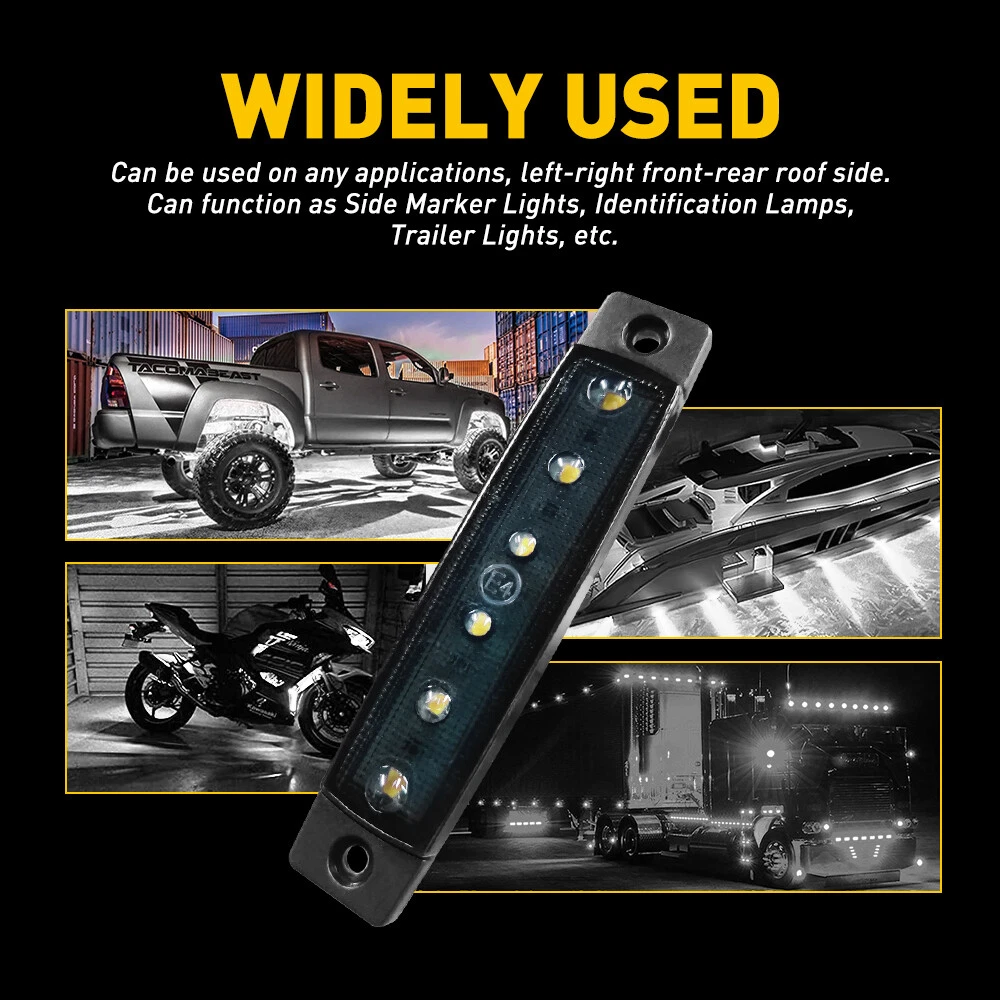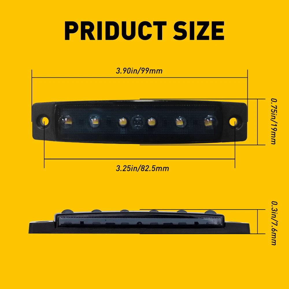 Excellent Brightness: Each light comes with 6PCS high intensity 2835 SMD LED, outputs excellent bright 120LM light for perfect marker light. Awesome Seal: Decently sealed at both front lens and back wire lead. Compared with other brands, our back wire lead is added proper glue to make it completely seal without affecting the surface mount. Widely Used: Ideal for most 12V trailer, buses, trucks, trailers, lorries, RV, boat as led marker light clearance light indicator Light. 12V 3.8" Smoked White Side Marker Clearance Lights 6LED for Truck Trailer 10x Excellent Brightness: Each light comes with 6PCS high intensity 2835 SMD LED, outputs excellent bright 120LM light for perfect marker light. Awesome Seal: Decently sealed at both front lens and back wire lead. Compared with other brands, our back wire lead is added proper glue to make it completely seal without affecting the surface mount. Widely Used: Ideal for most 12V trailer, buses, trucks, trailers, lorries, RV, boat as led marker light clearance light indicator Light. Simple Installation: 2 wire connection, yellow/red for positive, black for negative. 3 steps of light mounting: Mark and drill holes according to the foam tape base provided; Peel and stick the foam tape to the light; Run through the wire lead to the center hole and use bolts and nuts to fix 2 sides. Center hole might not be necessary if use some washer under the foam tape base when fixing the two sides. Package Include: 10 pack of white side marker light, include a hardware pack and foam tape base. Description: Item Type: Tail Light Assembly Special Features: Side marker &clearance lamp Material: ABS Light Source: LED LED quantity: 6 x light emitting diodes Lights Color: White Size: 3.74 x0.79 x 0.32 in/ 95 x 20 x 8 mm Holes spacer: 3.26 in/83 mm Lead cable length: 7.60 in /193mm Voltage: DC 12V Suitable for most of buses, trucks, trailers, and lorries etc. Package Included: 10x Side Marker Lights(White) 20 x Screws 10 x Gasket Item Specifics Brand AUXITO To Fit Side Indicator Light Color Smoke/Tinted Type LED Side Marker Clearance Lights Manufacturer Part Number CBD-CTX-W-10YX Item Type Tail Light Assembly Material ABS Light Source LED LED quantity 6 x light emitting diodes Placement on Vehicle Front Rear Left Right Brand AUXITO Fitment Type Direct Replacement Lights Color White Size 3.74 x0.79 x 0.32 in/ 95 x 20 x 8 mm Holes spacer 3.26 in/83 mm Lead cable length 7.60 in /193mm Suitable For most of buses, trucks, trailers, and lorries etc Fitment For Pickup,truck trailer,boat,Lorry,Van,caravan Waterproof IP67 Number of Bulbs 10 Manufacturer Warranty 2 Years Voltage DC 12V Lighting Technology LED Features CANbus Compatible Universal Fitment Yes Bulb Life Hours Up to 5,000 Hours Universal Fitment Yes Bulb Life Hours Up to 5,000 Hours Payment We can accept payment by credit, debit, and gift cards; Apple Pay, Google Pay, PayPal, and PayPal Credit. Shipping 1. All items will be shipped in 24 hours after receiving your payment . 2. We ship this item to US only via USPS first class mail. It usually takes 3-5 working days to deliver. Returns 1. We offer 60 days return policy. 2. Please contact us within 60 days from the date you receive your package if you have any questions with the products . 3. Refund will be sent after we got your returned package. 4. All returned items should be in the original packaging with tracking number. Contact Us We work from Monday - Saturday 9:00AM - 6:00PM PST, but we will reply you once we get your message .There will be some delay on response if you send message or E-Mail on Sunday. DESCRIPTION PAYMENT SHIPPING RETURN POLICY CONTACT US Hot item AUXITO 3157 3156 LED Flashing Brake Stop Stobe Tail Light Bulb Blinker Bulb 2F23 USD 12.91 AUXITO 3157 4157 Amber LED Turn Signal Side Marker Indicator Corner Light 2F23 USD 12.91 Help & Info Payment Policy Shipping Policy Return Policy FAQ About Us 12V 3.8" Smoked White Side Marker Clearance Lights 6LED for Truck Trailer 10x Excellent Brightness: Each light comes with 6PCS high intensity 2835 SMD LED, outputs excellent bright 120LM light for perfect marker light. Awesome Seal: Decently sealed at both front lens and back wire lead. Compared with other brands, our back wire lead is added proper glue to make it completely seal without affecting the surface mount. Widely Used: Ideal for most 12V trailer, buses, trucks, trailers, lorries, RV, boat as led marker light clearance light indicator Light. Simple Installation: 2 wire connection, yellow/red for positive, black for negative. 3 steps of light mounting: Mark and drill holes according to the foam tape base provided; Peel and stick the foam tape to the light; Run through the wire lead to the center hole and use bolts and nuts to fix 2 sides. Center hole might not be necessary if use some washer under the foam tape base when fixing the two sides. Package Include: 10 pack of white side marker light, include a hardware pack and foam tape base. Description: Item Type: Tail Light Assembly Special Features: Side marker &clearance lamp Material: ABS Light Source: LED LED quantity: 6 x light emitting diodes Lights Color: White Size: 3.74 x0.79 x 0.32 in/ 95 x 20 x 8 mm Holes spacer: 3.26 in/83 mm Lead cable length: 7.60 in /193mm Voltage: DC 12V Suitable for most of buses, trucks, trailers, and lorries etc. Package Included: 10x Side Marker Lights(White) 20 x Screws 10 x Gasket Payment Shipping Returns Contact Us We can accept payment by credit, debit, and gift cards; Apple Pay, Google Pay, PayPal, and PayPal Credit. 1. All items will be shipped in 24 hours after receiving your payment . 2. We ship this item to US only via USPS first class mail. It usually takes 3-5 working days to deliver. 1. We offer 60 days return policy. 2. Please contact us within 60 days from the date you receive your package if you have any questions with the products . 3. Refund will be sent after we got your returned package. 4. All returned items should be in the original packaging wi