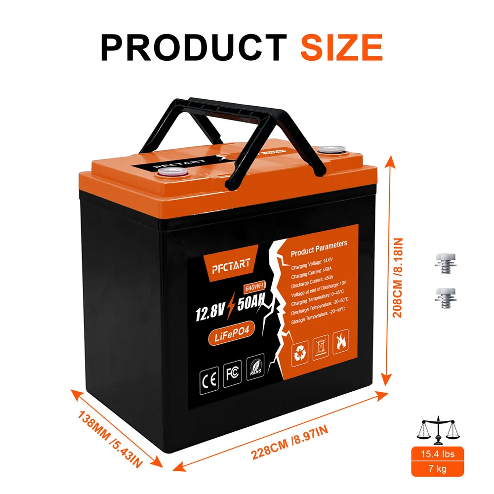 Specifications: Nominal Capacity: 50Ah Usable Capacity: 50Ah Terminal Size: M6 Nominal Voltage: 12.8V Energy: 640Wh Charge Method: CC / CV Charge Voltage: 14.4V±0.2V Current: 10A (0.2C Cycle Life≥4000 times Internal Impedance≤40mΩ Battery Management System (BMS) Board: 50A Max. Continuous Charge / Discharge Current: 50A Max. Discharge Current 5 Seconds: 100A Max. Continuous Load Power: 640W Battery Pack Case: Acrylonitrile Butadiene Styrene (ABS) PlasticProtection Class: IP65 Temperature Range: Charge: 0°C to 50°C / 32°F to 122°F Discharge: -20°C to 60°C / -4°F to 140°F Storage: -10°C to 50°C / 14°F to 122°F Dimension (L/W/H/TH): 198 * 166 * 170 mm / 9.02 x 5.43 x 8.19 inches Weight: Approx. 8.5kg / 18.07 lbs Note: 1.Please read the product manual before using the LiFePo4 Battery 2.Check the specifications (Voltage, capacity, dimension, weight etc) and make sure it would fit and replace your old battery with no problem before purchase 3. Please remove the caps on terminals before using Package Included: 1* 12V 50Ah Lithium Battery 2 Pairs* Terminal Screws 1* Warranty Card 1*Product Manual Please be noted: battery charger is not included.
