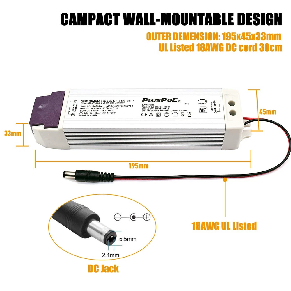 This Dimmable LED transformer is Compact, Quiet, great operating efficency, Well Compatibility, This is an 12V50W Triac dimmable power supply. with most AC wall dimmer like Lutron, Leviton and most other household dimmers. Can be used for many 12v constant voltage LED lights and other applications. Warning: Do not overload. Overload will cause the AC adapter to fail. We are not responsible for misuse of power supply. It is recommended not to exceed the AC power supply's capacity. Please calculate your load before connecting the power. Specification: Output Current: 4.15A ; Output Voltage: 12V Input Voltage: 100V-130V 50/60HZ Size dimension: 195x45x33mm NON-waterproof use for indoor dry location only. Quiet, Smooth, Full range flicker-free dimming for 12 volt LED Lighting such as LED strips, modules, light bars, puck and other LED accent lights with most wall dimmers like Lutron, Leviton, ABB and higher end Lighting control systems, also with 12 volt, low-voltage LED dimmers and Color controllers No minimum Lighting load required for wide range dimming, no de-rating is required; load up to 100% of the model’s 50 watt capacity Easy to Install, Mount, and Wire. Comes with10inch DC cord ( 2.1x5.5mm DC Jack included) can be removed for use in hard wire installations. Short-Circuit / Over Current / Over Voltage/ Low-Voltage and Auto-recovery Mode.
