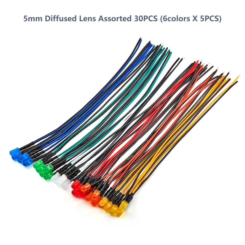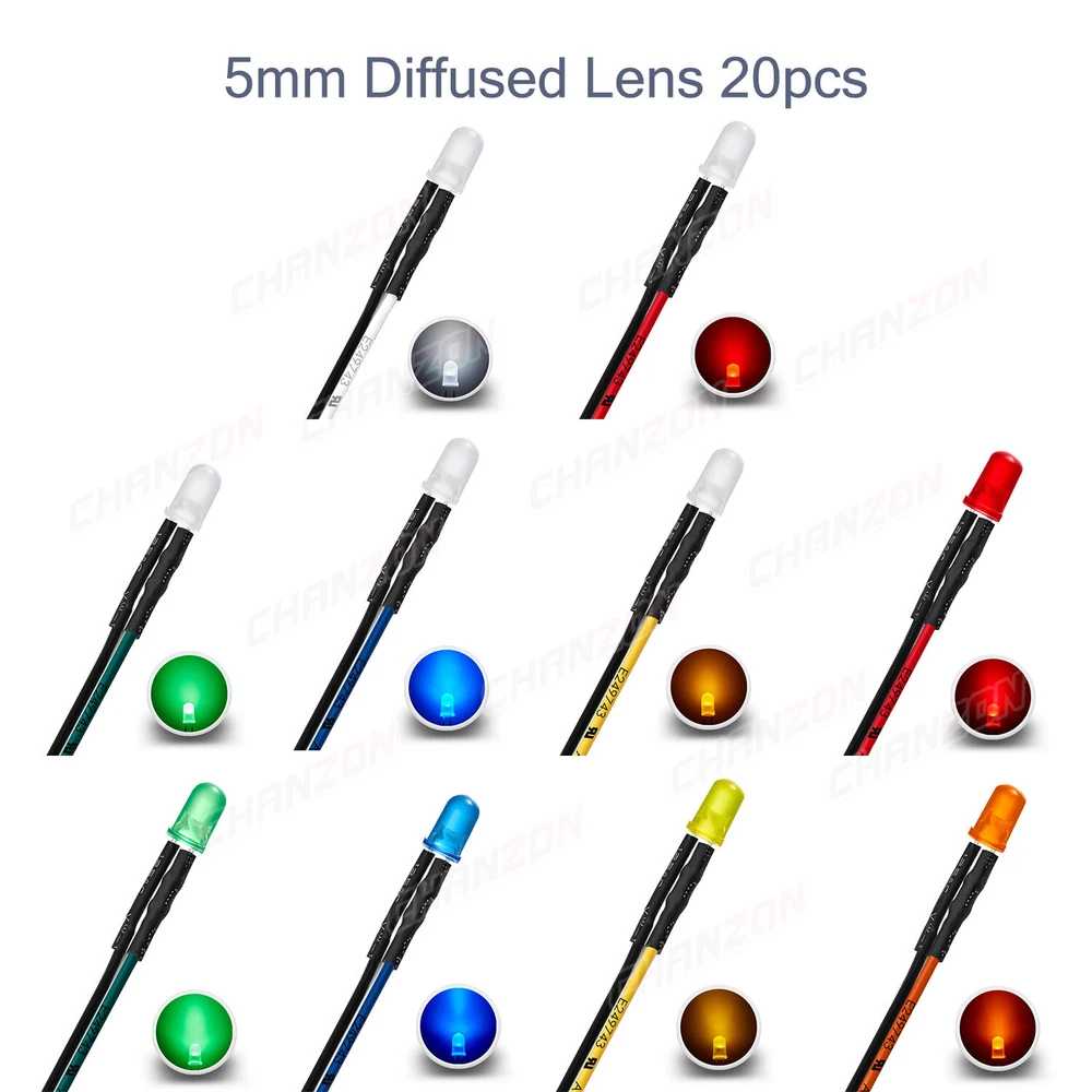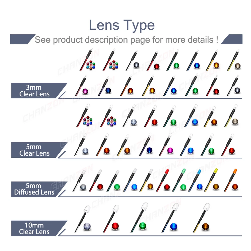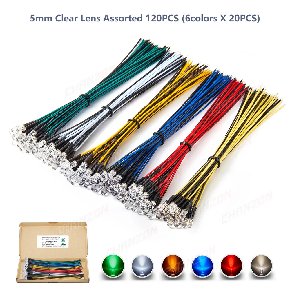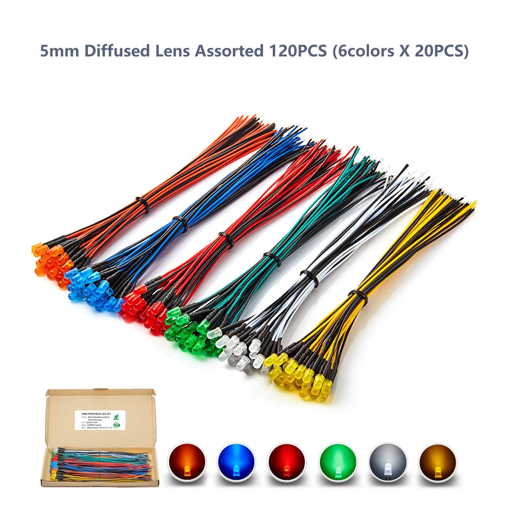 PRODUCT SPECIFICATIONS: Voltage : 12 volts Current: 20mA Resistor: 560 680 Ω ohms ,0.25W 1/4W(discrepancy: ±1%) Wattage: 0.24W ( 0.25W ) Wire Length : 20cm Wire Gauge: 24awg Wave Length: 395nm-625nm Wire Detail: Tin-Coated Pigtail , UL Listed Viewing Angle :20° 30° Luminous Intensity : 200-20000mcd Wave Length : 395nm , 400nm , 450nm , 520nm , 590nm , 591nm , 600nm Len Size : 3mm 5mm 10mm Emitting Color : White , Red , Green , Blue , Yellow , Orange , Purple , Pink , RGB , Warm White PACKAGE INCLUDED : 3mm Clear Lens 20pcs 5mm Clear Lens 20pcs 5mm Diffused Lens 20pcs 10mm Clear Lens 10pcs 10mm Diffused Lens 10pcs 5mm Clear Lens Assorted 30pcs (6colors X 5pcs) 5mm Diffused Lens Assorted 30pcs (6colors X 5pcs) 5mm Clear Lens Assorted 120pcs (6colors X 20pcs) 5mm Diffused Lens Assorted 120pcs (6colors X 20pcs)