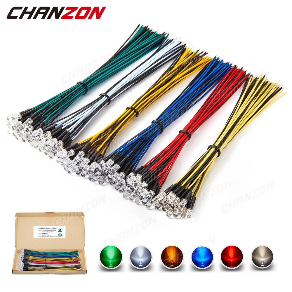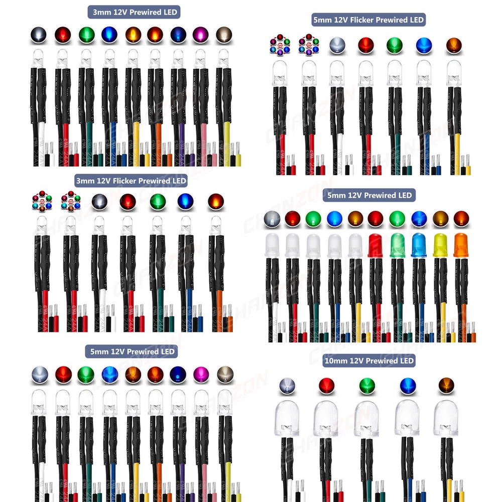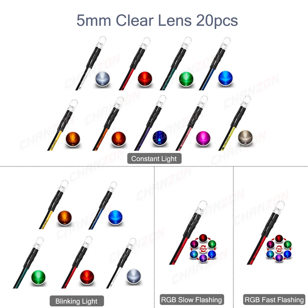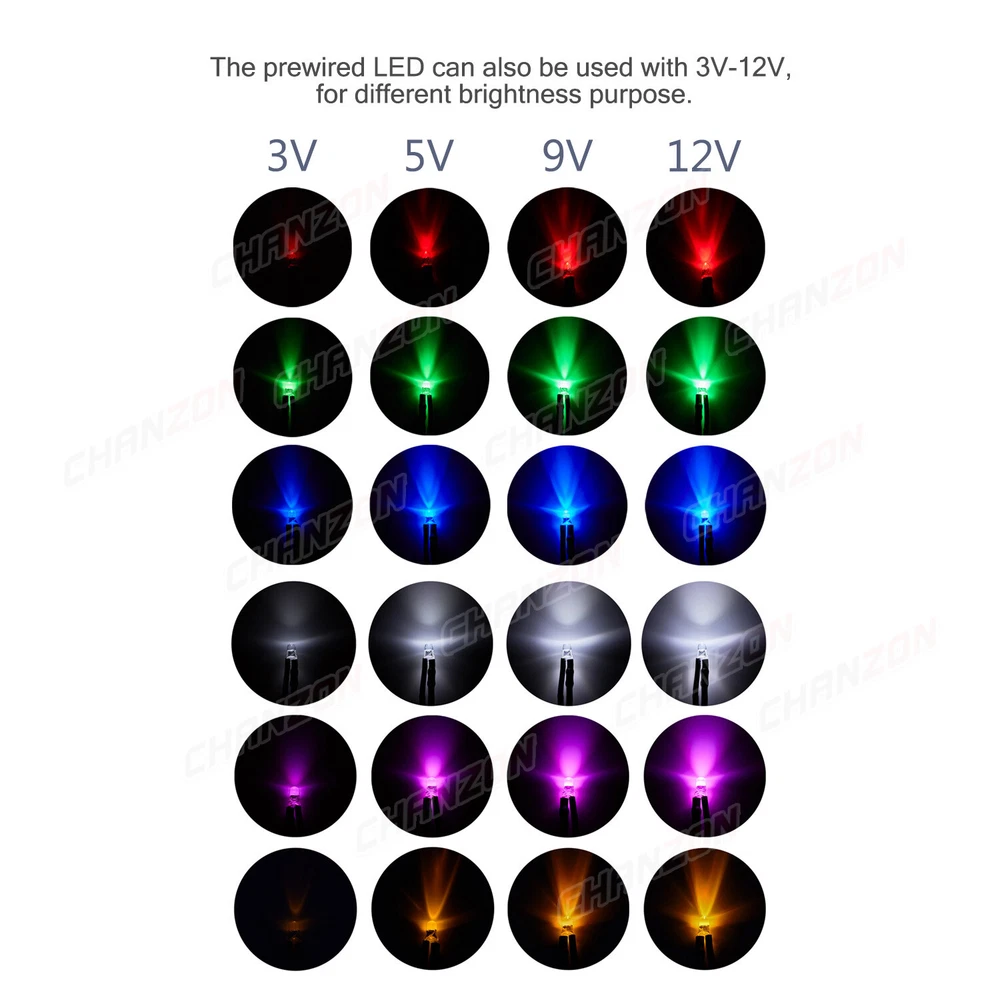 PRODUCT SPECIFICATIONS: Voltage : 12 volts Current: 20mA Resistor: 560 680 Ω ohms ,0.25W 1/4W(discrepancy: ±1%) Wattage: 0.24W ( 0.25W ) Wire Length : 20cm Wire Gauge: 24awg Wave Length: 395nm-625nm Wire Detail: Tin-Coated Pigtail , UL Listed Viewing Angle :20° 30° Luminous Intensity : 200-20000mcd Wave Length : 395nm , 400nm , 450nm , 520nm , 590nm , 591nm , 600nm Len Size : 3mm 5mm 10mm Emitting Color : White , Red , Green , Blue , Yellow , Orange , Purple , Pink , RGB , Warm White PACKAGE INCLUDED : 3mm Clear Lens 20pcs 5mm Clear Lens 20pcs 5mm Diffused Lens 20pcs 10mm Clear Lens 10pcs 10mm Diffused Lens 10pcs 5mm Clear Lens Assorted 30pcs (6colors X 5pcs) 5mm Diffused Lens Assorted 30pcs (6colors X 5pcs) 5mm Clear Lens Assorted 120pcs (6colors X 20pcs) 5mm Diffused Lens Assorted 120pcs (6colors X 20pcs)