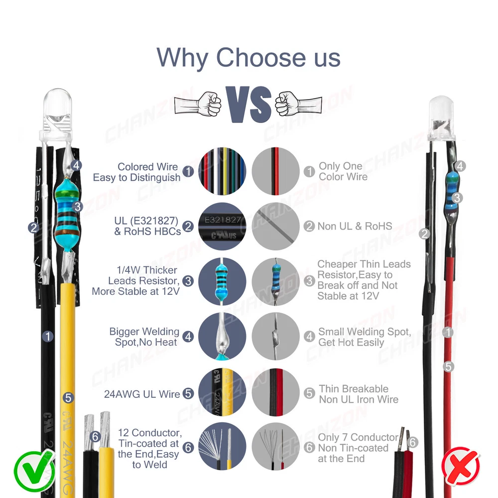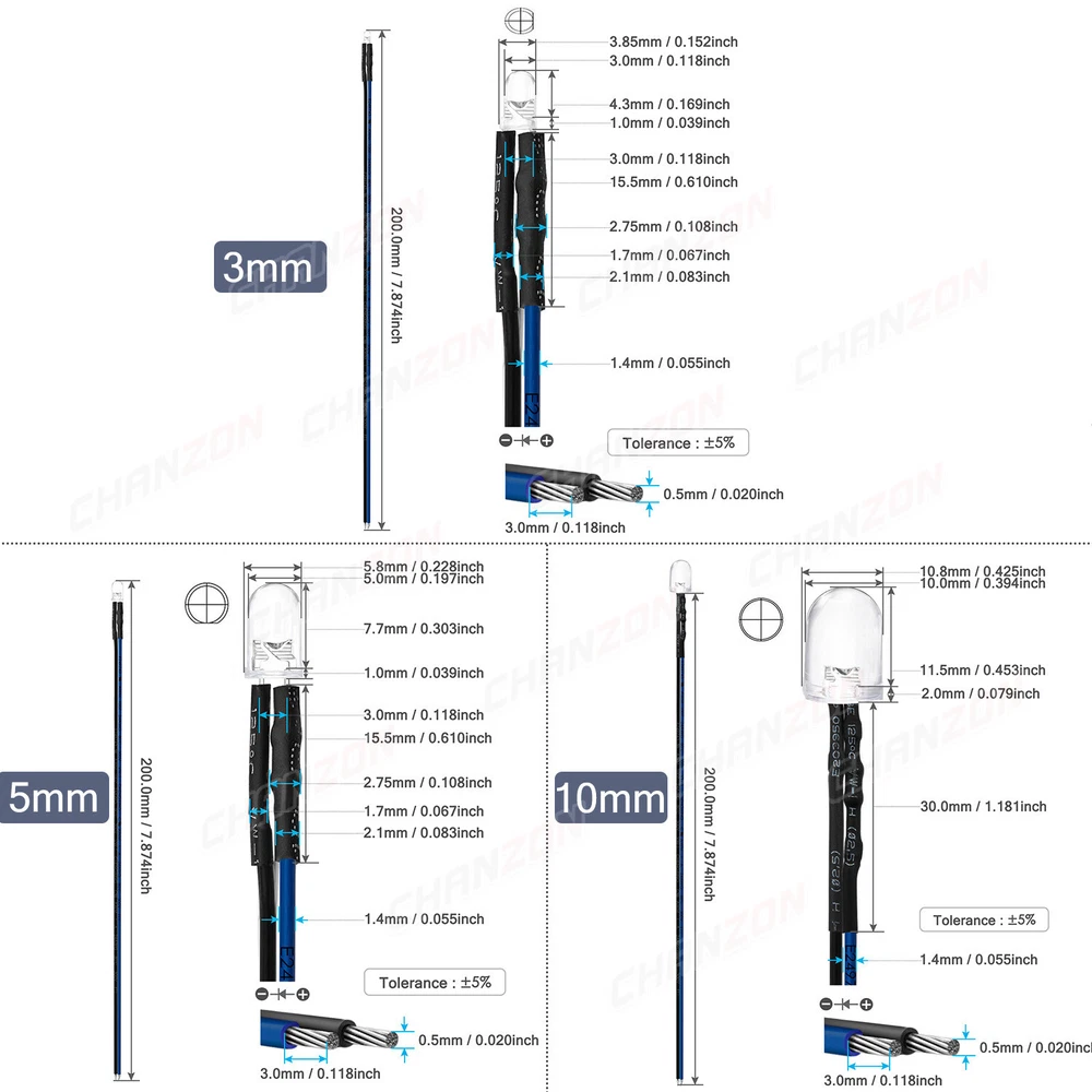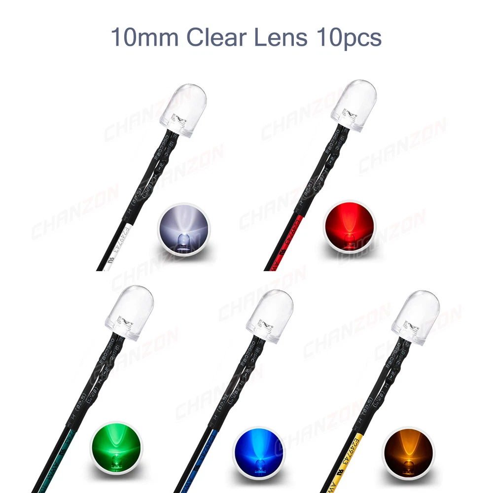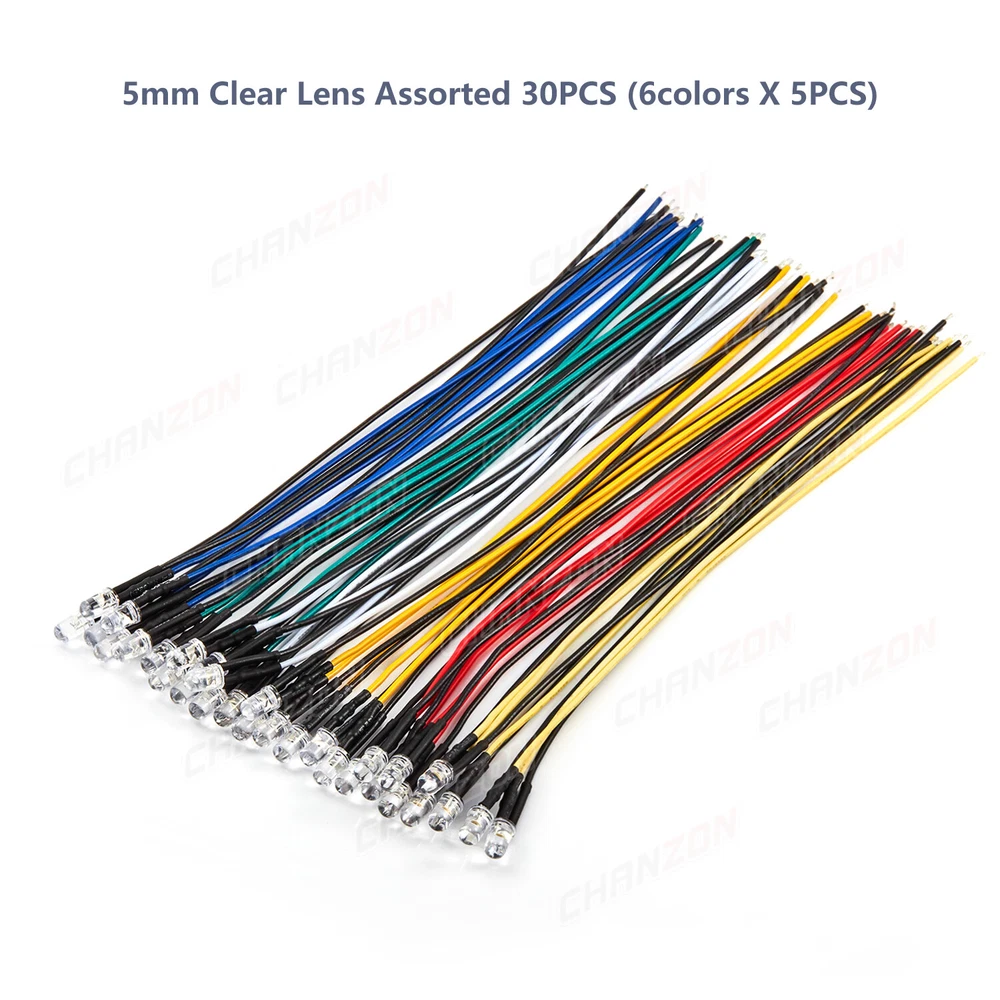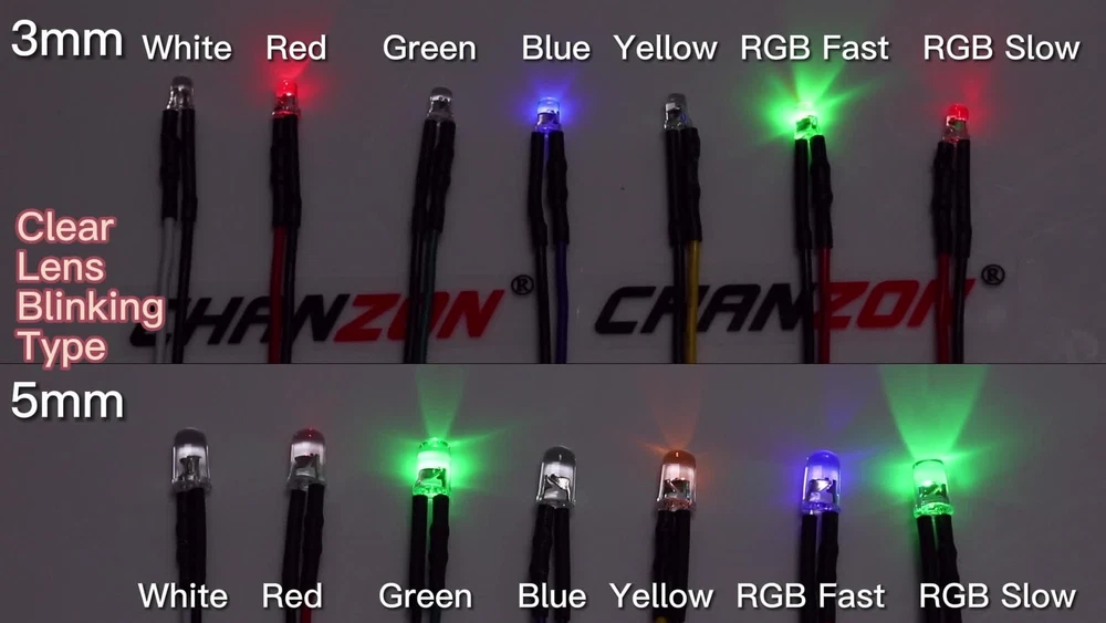 PRODUCT SPECIFICATIONS: Voltage : 12 volts Current: 20mA Resistor: 560 680 Ω ohms ,0.25W 1/4W(discrepancy: ±1%) Wattage: 0.24W ( 0.25W ) Wire Length : 20cm Wire Gauge: 24awg Wave Length: 395nm-625nm Wire Detail: Tin-Coated Pigtail , UL Listed Viewing Angle :20° 30° Luminous Intensity : 200-20000mcd Wave Length : 395nm , 400nm , 450nm , 520nm , 590nm , 591nm , 600nm Len Size : 3mm 5mm 10mm Emitting Color : White , Red , Green , Blue , Yellow , Orange , Purple , Pink , RGB , Warm White PACKAGE INCLUDED : 3mm Clear Lens 20pcs 5mm Clear Lens 20pcs 5mm Diffused Lens 20pcs 10mm Clear Lens 10pcs 10mm Diffused Lens 10pcs 5mm Clear Lens Assorted 30pcs (6colors X 5pcs) 5mm Diffused Lens Assorted 30pcs (6colors X 5pcs) 5mm Clear Lens Assorted 120pcs (6colors X 20pcs) 5mm Diffused Lens Assorted 120pcs (6colors X 20pcs)