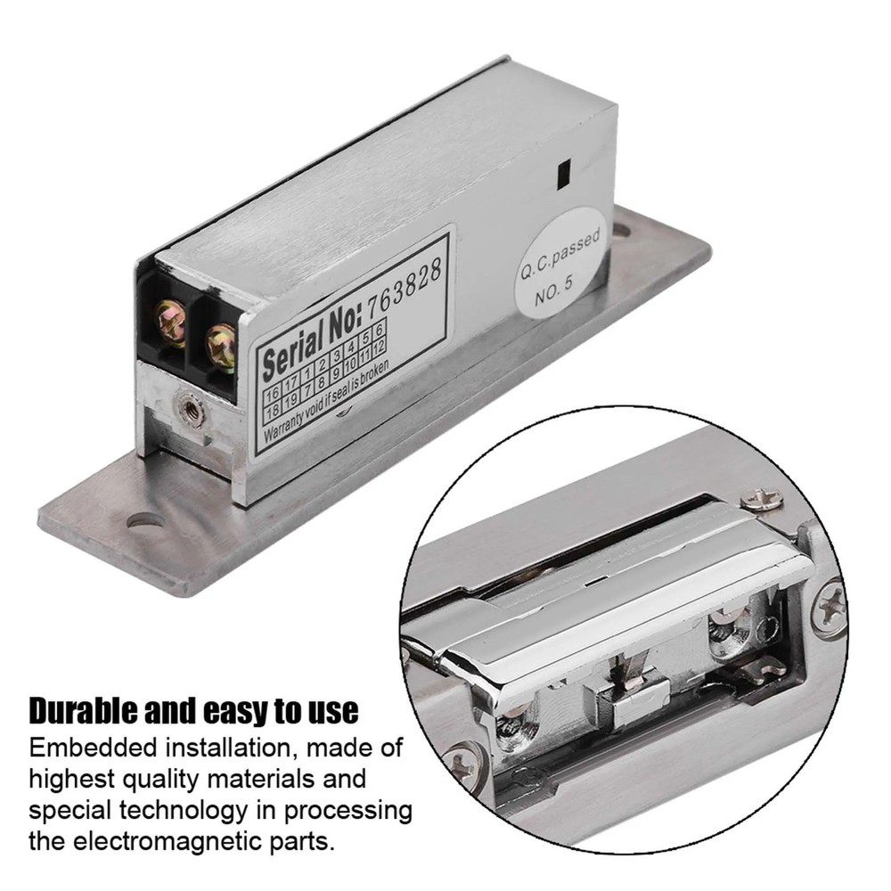 Features: Suitable for office building, stainless steel doors, steel doors, wooden doors, fireproof exit doors, main access doors of community. Mortise mounted, beautiful outlook, large lock , and wide range of application. Embedded installation,made of highest quality materials and special technology in processing the electromagnetic parts. Can customize special lock according to your demand. Without residual magnetism for long time working, ensure durable operation. The lock time is determined by the power-on time. Easy to install. Durable and easy to use. Double unlock mode: switch up, power off/ NC, switch down, power on/ NO High strenh and high hardness.,made of thick stainless steel with built-in copper coils. Special design,easy to adjust the distance of the Lock-tongue. Specification: Item Type: Electric Strike Door Lock Material: Plastic Color: Silver Lock Size: 11 * 2.5 * 3cm/4.33 * 0.98 * 1.18inch Lock-tongue Structure: Zinc alloy die casting Holding Strenh: 300kg thrust Voltage: DC12V Current: 12V/280mA ; 24V/160mA Special design: Adjustable Lock-tongue Suitable For: Wooden door, Metal door Temperature: Lower than room temperature +20 Suitable Temperature: -10~+55C(14-131F) Suitable Humidity: 0~95% Lock body treatment: High temperature Security Type:power off to lock Package Weight: 233g/8.21oz Package List: 1 x Cathode Lock 2 x Screws 1 x Resistor