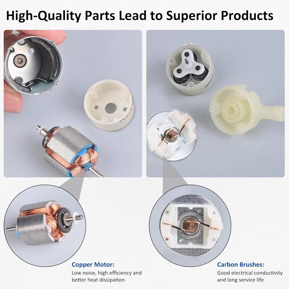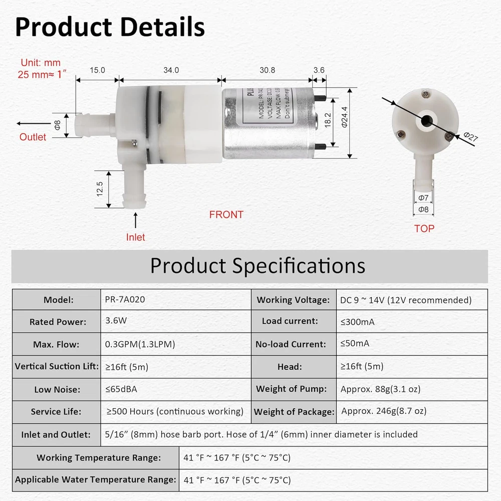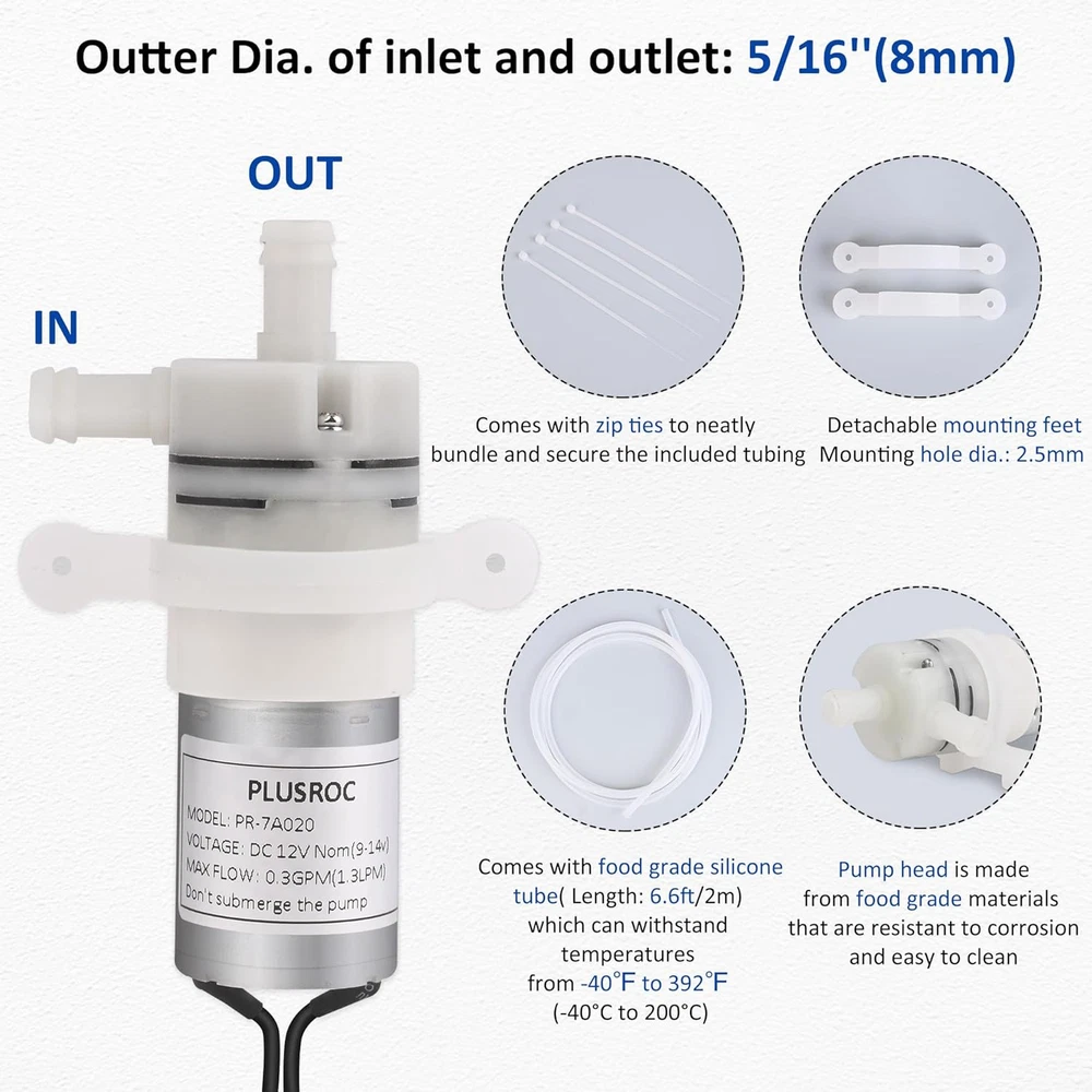 SELF-PRIMING FEATURE: Max. Vertical Suction Lift: 16ft(5m). Max. Flow: 0.3GPM(1.3LPM), Head(High Lift):≥16ft (5m).Inlet and Outlet: 5/16”(8mm) hose barb port. Hose of 1/4” (6mm) inner diameter is included. Working Voltage: DC 9 ~ 14v (12V is recommended). DO NOT USE AC POWER SOURCE! Load current: ≤300mA, No-load current: ≤50mA FOOD GRADE MATERIALS:The pump head and silicone hose are made of Food Grade materials. Commonly used as a Replacement Pump for Ice Maker,Coffee Machine, Hot & Cold Water Dispenser, Refrigerator, fish tank, tea machine, etc. HIGH QUALITY: Motor uses high-quality copper wires for stable and efficient operation, long service life with low noise. PACKAGE CONTENTS:1. Pump unit with wires (2.6ft/80cm) 2. UL Listed AC to DC Power adapter (with switch, cable length: 2.6ft/80cm) 3. Silicone Tubing (6.6ft/2m) 4. Zip ties (4) 5. User manual NOTES: 1. Motor is not waterproof, don't submerge the pump in water! 2. There is no built-in pressure switch. If the pump is operational, ensure the outlet is not blocked! Product Description Good for DIY Projects Not only for water dispenser But also for your DIY projects Silicone Tubing Length: 6.6ft(2m) Withstand temperatures range: -40 ℉~ 392 ℉ Thickness: 1mm Mini Size Portable Powerful(1.3LPM) 12V DC Pump Power Adapter Included High Quality Parts Food Grade Pump Head Copper Motor Carbon Brush WIDE APPLICATIONS
