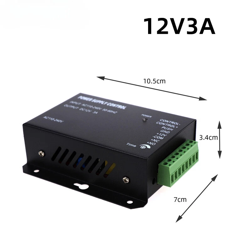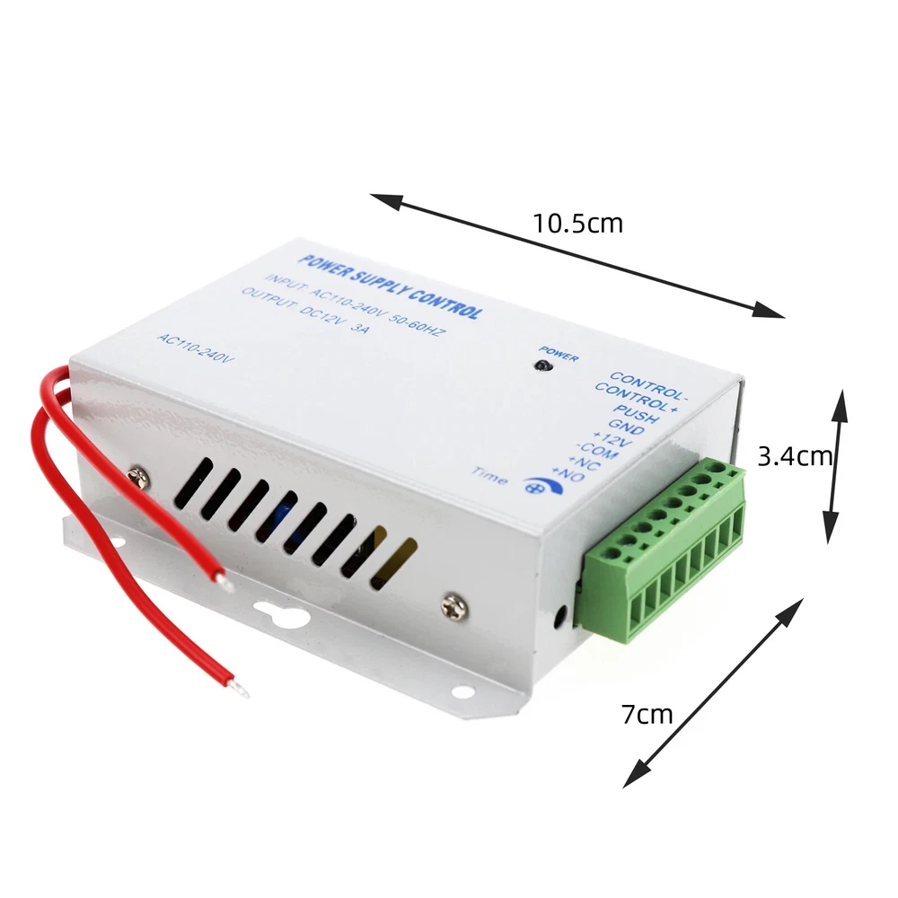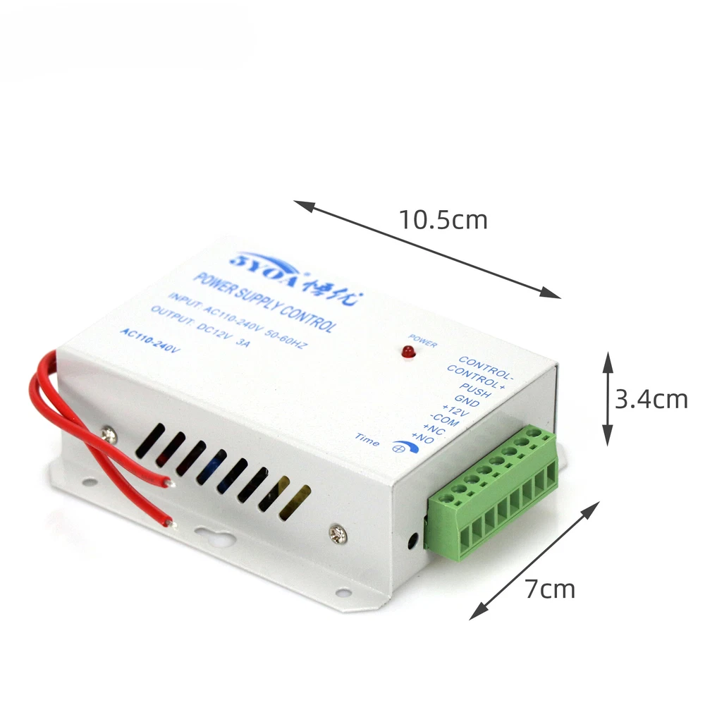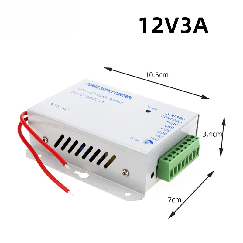 3A Access Control Power Supplier Description: This is a 110V--260V Access Control Power supply, it is made up of high quality electronic components and advanced international technology, it has anti-interference ability, provide very stable and reliable output in a various applications such as lock control/ controller control/ exit button/ RFID-IC Reader .etc. Key Functions: It controls electric lock directly. Can reduce the load of access controller, save wiring to reduc the hidden trouble Set NC / NO outputs, can control various types of electric locks Based delay control circuit, lock time can be in 0-15 seconds Automatic protection function, unexpected situations such as when the power supply short-circuit occurs, the power may be temporarily disconnected or the fuse auto insurance line off Operative device: E/M Lock, Access Controller, Exit Push Button Key Specification: AC input: Standard AC110V-260V(12V3A) DC output: Stabilivolt DC12V/ 3A Include: 1 x Access Control Power Supply