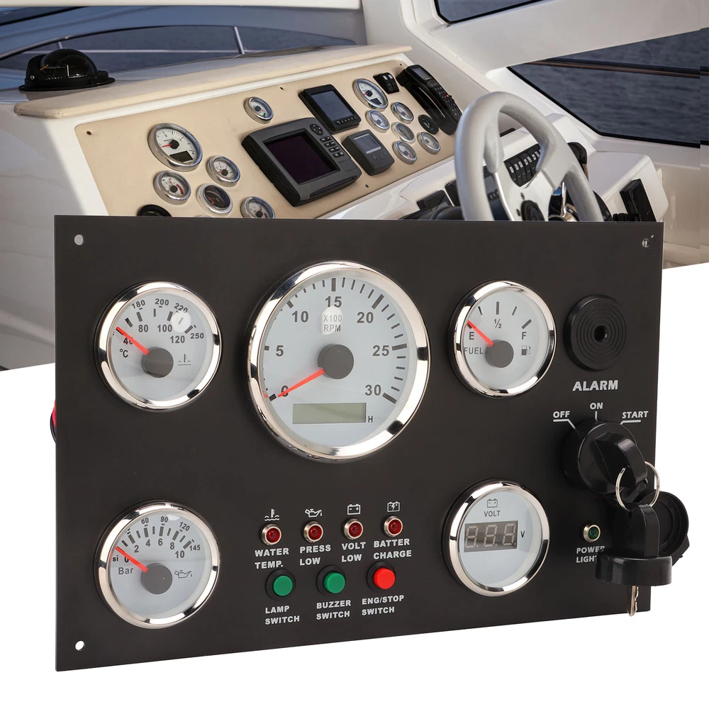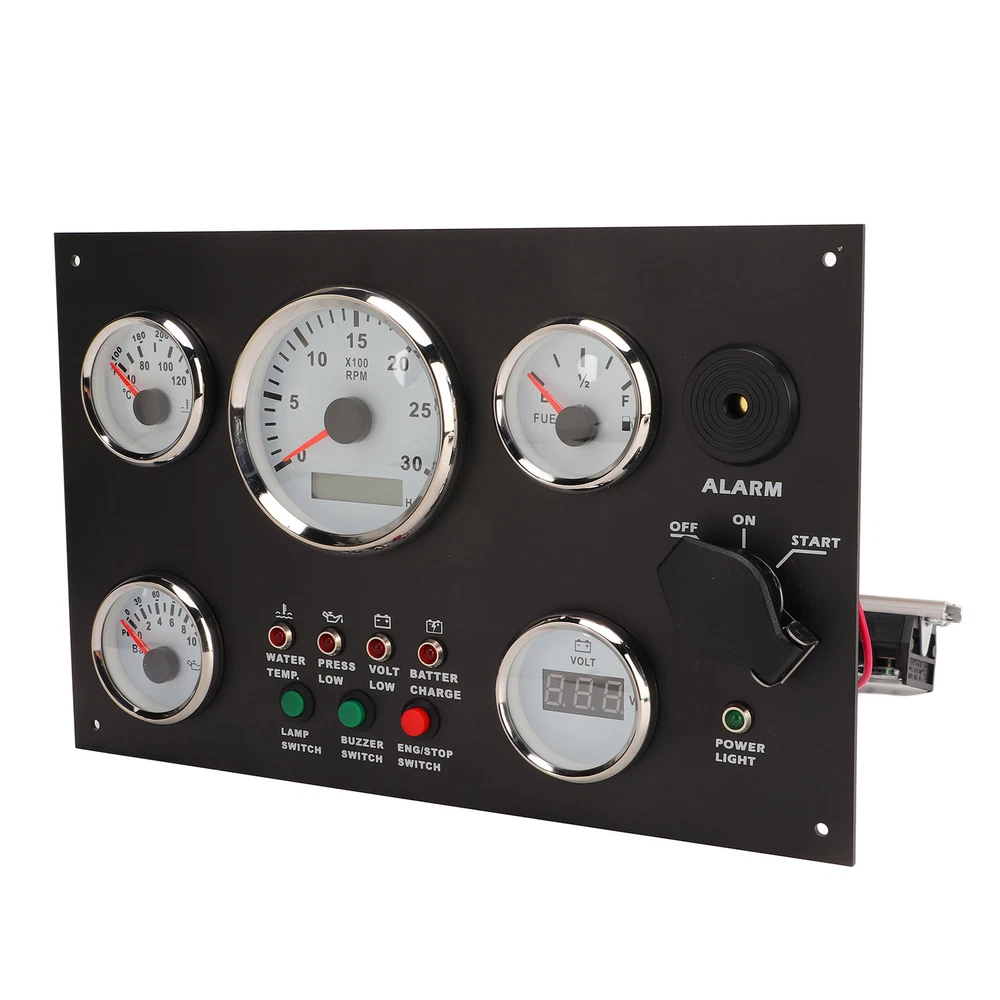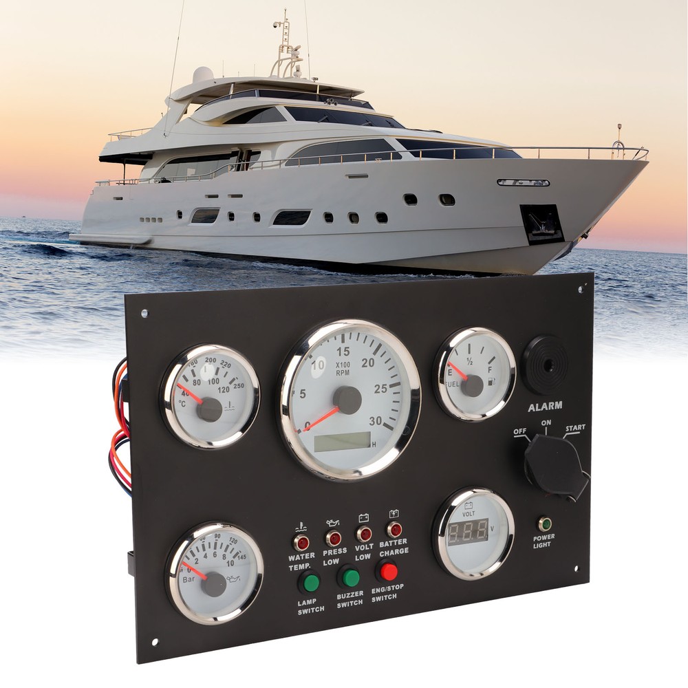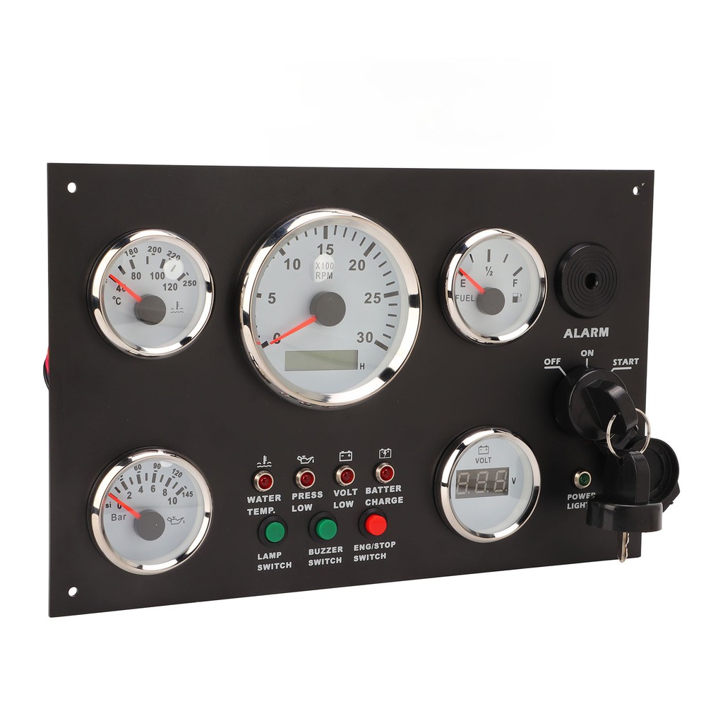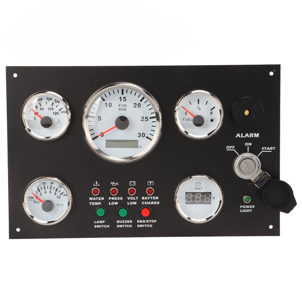 Feature: 1. Display: It can accurately indicate the engine speed from 0‑3000RPM, water temperature from 40‑120 ° C, remaining oil volume from E‑1/2‑F, fuel pressure from 0‑145 PSI, and specific voltage value from 8‑32V. 2. Practical: With post programming technology, the driver can be modified to match a variety of signals, and the pointer has high accuracy, and can be installed in an area of 190 x 300mm, greatly saves the space. 3. Material: Made of stainless steel front cover bezel, shock resistant, anti fog, IP67 waterproof and dustproof, function properly in sea and harsh environments, the working temperature can reach ‑30 ‑ +75 °C. 4. Fine Workmanship: Ultra wide working voltage design, low power consumption, wiring harness connector designed with snap, can ensure a strong connection between the instrument and the wiring harness. 5. Multifunction: Designed with ignition start indicator, light switch, engine stop switch, BUZZER switch, water temperature alarm, low oil pressure alarm, low voltage alarm, battery charge alarm, and all equipped with red backlights. 6. Application: Can be used for generator, RVs, yachts, fishing boats, ships, engineering machinery, agricultural machinery, modified vehicles, etc., through the data of the instrument know the status of the engine. Specification: Item Type: Engine Dash Instrument Panel Material: Stainless steel, ABS, PC Water Thermometer: 40-120 degrees Celsius Oil Pressure: 0-145psi Engine Speed: 0-3000RPM, timed 99999.9 per hour Oil Level: E-1/2-F Operating Current: ≤100 MA Operating Temperature: -30 °C - + 75 °C Storage Temperature: -40 °C - + 85 °C Mode: Liquid crystal display, stepper motor Protection Class: IP67, can work in an underwater 1m position, excellent anti fog function; Technical Support: Post programming technology, the driver can be modified as needed to match a variety of analog input signals Installation Size: Approx. 190 x 300mm/7.48 x 11.81in Applicable: Used for engines, generator sets, motorhomes, yachts, fishing boats, ships, construction machinery, agricultural machinery, modified vehicles. Package List: 1 x Engine Dash Instrument Panel 2 x Key 1 x Manual Note: Equipped with a detailed product manual, the installation wiring and use functions of the product are clearly described 1. Our listing price includes the value of goods,packaging cost,and export taxes,not including international duties. 2. duties,taxes,and charges are not included in the item price or shipping fee. 3. The duties are buyers' responsibility.Please check with your country's customs office determine what these additional costs will be prior to your purchase. 4. All disputes arising from the duties will be submitted to ebay for solution. 1. Any questions, pls. contact us via ebay message or email us.We will reply your message within 48 hours. If you do not receive our reply within 48 hours, pls. post a message again because sometimes our message system may block some emails. 2. If you are satisfied with our service, pls. kindly leave us a positive feedback and give us the Detailed Seller Rating with all "5 " in very area 3. Our aim is to provide Level Customer Service, your recognition will encourage us greatly and serve you better. We strive to keep all our customers satisfy. We will do our up most to exceed your expectations in customer service, communication and dispatching of your orders.