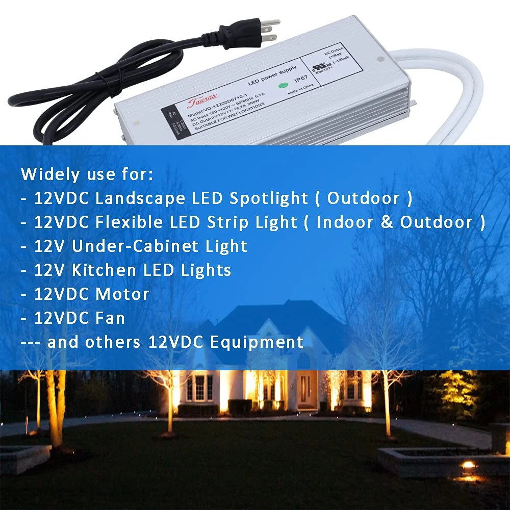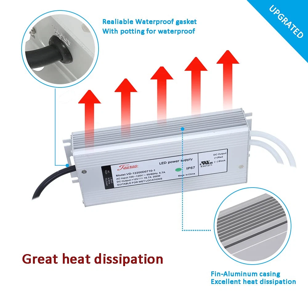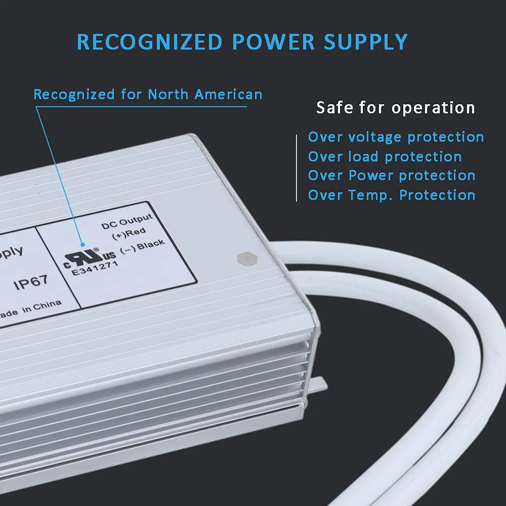 Real 200 Watt LED Driver, just use 100% loading, Non-Dimmable LED Driver 120V to 12V DC for LED Landscape strip Light or others 12V product Recognized for North American, marked with Backward RU, this means the power supply was passed safety testing and recorded on database IP67 Waterproof, suitable for wet or dry location, long lifetime Included wiring connector, easy for wiring, no need soldering