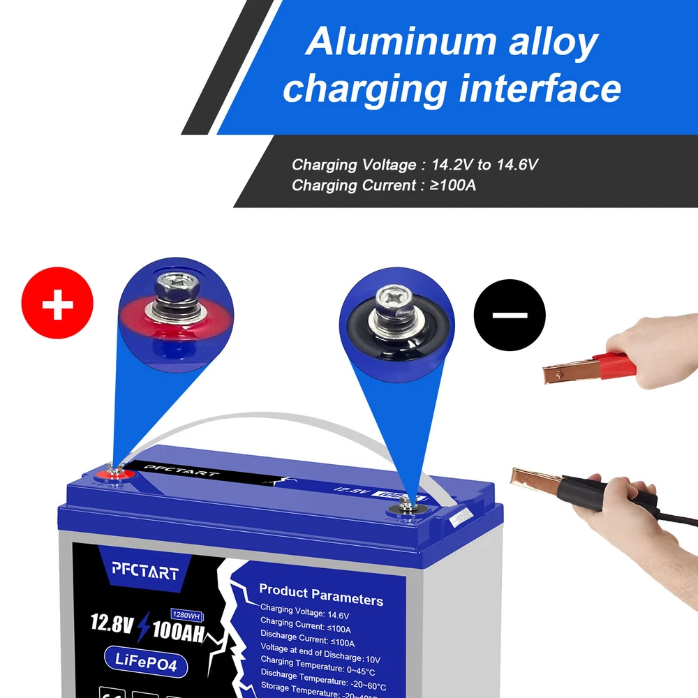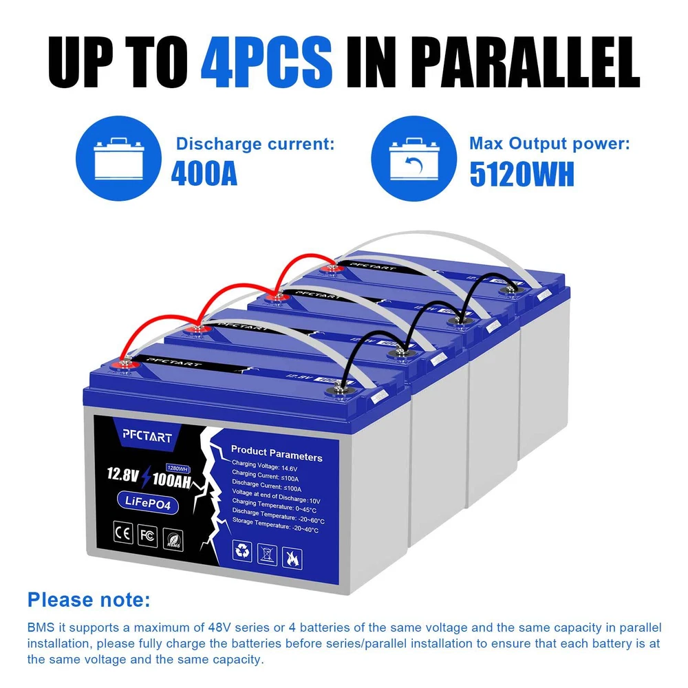 Features: BORN FOR RV LIFE An Affordable 12V 100Ah Deep Cycle LiFePO4 Battery.Your optimal & adequate LiFePO4 Battery for Camper Van, Travel Trailer, Caravan, Hauler, Motor Home, etc. 1/2 LIGHT WEIGHT IN 14.2KG Easily Pick up and go! Weighs 11.6kg, 1/2 lighter than 12V 100Ah lead-acid battery in 25kg.Effortlessly Install the 12V 100Ah LiFePO4 battery in your RVs, no any burden to you and your RVs. 1280Wh ENERGY STORAGE Provides100% 1.28kWh energy, a 2X increase in power output efficiency over lead-acid batteries (approx. 50% usable capacity in a 12V100Ah AGM SLA Lead-acid battery at 1C discharging rate).Timeusb LiFePO4 battery delivers the ideal result on stronger energy storage that users of RVs expected. 100% SAFE WITH SUPERIOR BMS 100A Battery Management System (BMS), protects the battery from safety hazards by providing five types of protection: overcharging, overdischarging, overcurrent, short circuit, and high-temperature environment above 60°C/140°F. It’s a 100% green energy that is free of heavy metals and rare metals, non-toxic, and non-polluting. EFFICIENT DELIEVERY & 24Hrs SERVICE PFCTART provides customers with a responsive and professional customer service team that provides targeted battery solutions within 24 hours of question receipt.Given Timeusbahighly effective after-sales and delivery team, our customers in the United States can receive PFCTART products within 2-7 working days. ATTENTION It is an energy storage battery rather than a start-up battery, and it CAN NOT be used for any kind of golf carts, trolling motor or starting. Package Included : 1 * 12V 100Ah LiFePO4 Battery Pack Please be noted : battery charger is not included. Specifications: Battery type: LIFEPO4 MODEL: 100Ah 12.8V(4S1P) Rated capacity: 100Ah(1280WH) Normal voltage: 12.8V Discharge termination voltage: 10.0V Charging voltage: 14.6V Internal resistance: ≤180mΩ Single cell: IFR 3.2V 100Ah Standard charging. Continuous current: 0.2C5A Continuous voltage: 14.6V Cut-off current: 0.01 C Standard discharge: Constant current 0.2C5A end voltage 10.0V Max. charging continuous current: 100A Maximum discharge continuous current: 100A Operating temperature range. Charge: 0~45℃ Discharge: -20~70℃ Product size: 329*171*235mm Weight : 11.6kg BMS protection: Cell overcharge detection voltage:3.90V±50mV Cell overcharge recovery voltage:3.80V±100mV Cell over-discharge detection voltage:2.00V±100mV Cell over-discharge recovery voltage:2.30V±100mV Rated operational charge current:100A Over current detection:150±30A PCM impedance:≤50mΩ Please note : BMS it supports a maximum of 48V series or 4 batteries of the same voltage and the same capacity in parallel installation, please fully charge the batteries before series/parallel installation to ensure that each battery is at the same voltage and the same capacity.