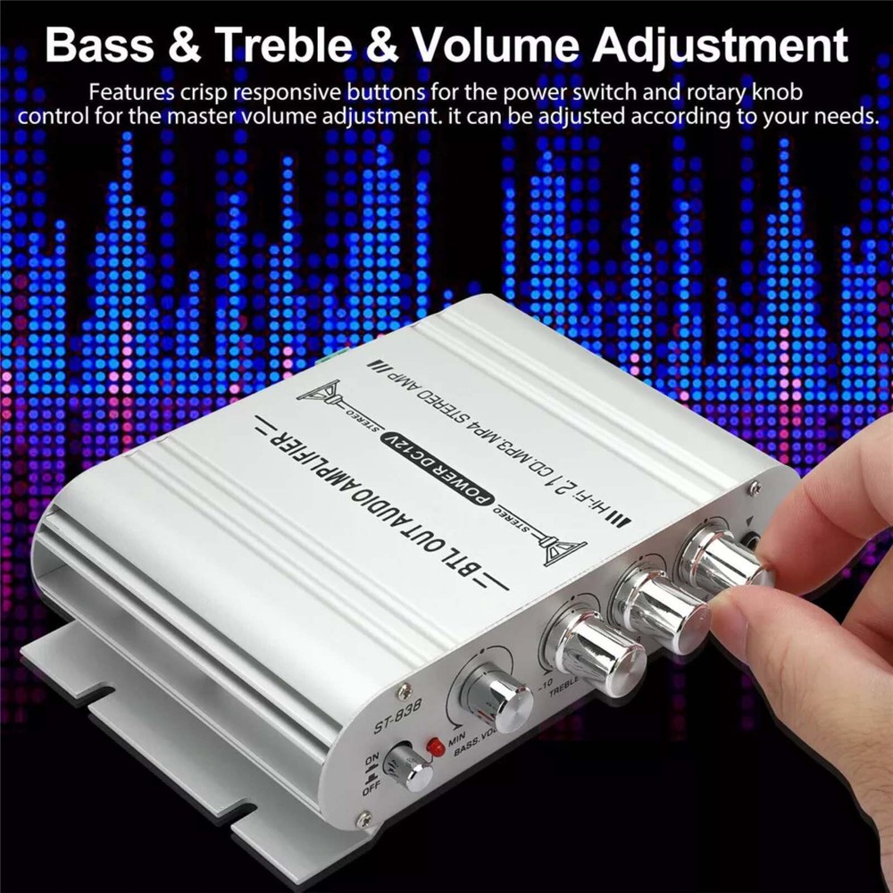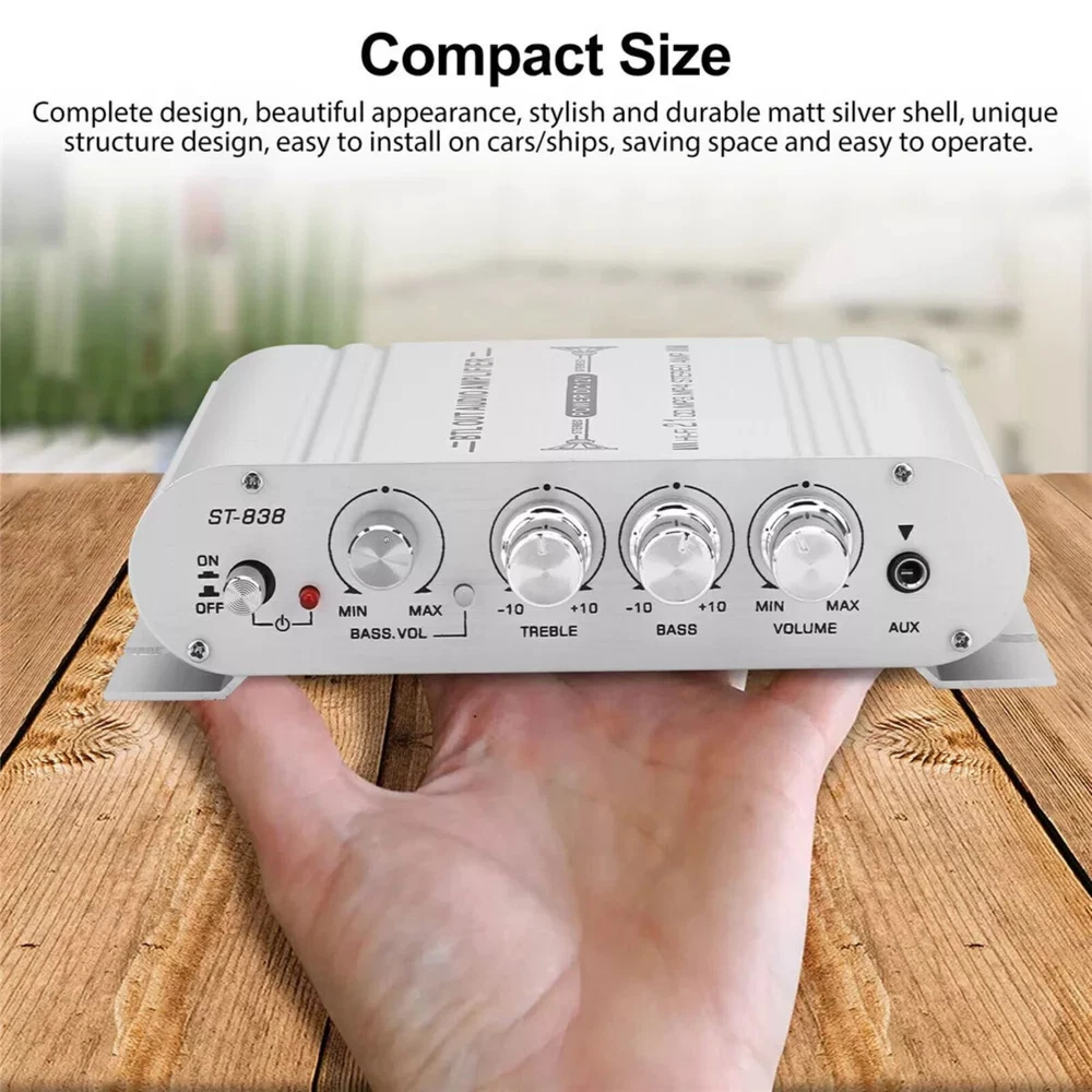 You may also like Round 8 Pin To RJ45 Microphone Adapter Cable for Yaesu FT450D FT897D FT991 FT891 13.88 USD Wireless Charging Receiver Smart Module For Logitech G403/G502/G703/903 G pro 20.39 USD 40db 800MHz-2500MHz RF Coaxial Directional Coupler Power Handling 200W 16.99 USD 10/100/1000M Ethernet to Fiber Optic Media Converter 4 RJ45 & 1 SC fiber Port 39.99 USD New 250Pcs 7 Size Non Insulated Wire Ferrules Kit Red Copper Crimp Connector 13.69 USD 4 in 1 Mobile Phone Repair Opening Tools Kit Screwdriver for iPhone Smart Phone; 12.69 USD Product Description Features: Outstanding 2.1 Channel Audio Output: Boasting a powerful 2.1 channel configuration with 20W×2 (left/right) for the main channels and 40W for the subwoofer, it effortlessly drives a wide range of home, car, marine, and outdoor passive speakers and subwoofers, delivering unparalleled sound quality. The low distortion design ensures a clearer, stronger, and more powerful audio experience. Universal Compatibility with Elegant Design: Equipped with standard stereo RCA and 3.5mm AUX inputs, it seamlessly connects to devices like iPads, mobile phones, MP3 players, CD players, TVs, and computers. In addition to the main volume control, it features dedicated treble, bass, and subwoofer volume adjustments, allowing you to easily enjoy high-quality music tailored to your preferences. Flexible Audio Adjustment: Featuring crisp and responsive buttons for power control and a rotary knob for master volume adjustment, it offers effortless customization to suit your listening needs. Whether it's rocking tunes or soothing melodies, it delivers perfect sound every time. Compact and Stylish: With its compact design and exquisite matte silver casing, it not only looks fashionable and durable but also boasts a unique structure that makes it easy to install in cars, boats, or other tight spaces. It saves valuable space while remaining convenient to operate. Versatile Applications: Suitable for DC 12V input, it's ideal for various scenarios, including cars, boats, RVs, golf carts, and even homes. Wherever you need a great amplifier with low distortion and acoustically accurate music reproduction, this is the perfect choice. Specifications: Model: ST-838 Color: Silver Number of Channels: 2.1 Power Amplifier Type: HIFI Power Amplifier Audio Input: Stereo L/R RCA / 3.5mm AUX Audio Output: Cable Speaker Jacks + Subwoofer Bluetooth: Not Supported Input Voltage: DC 12V/3A (Power supply not included) RMS Power: 20W x 2 + 40W Max Power: 200W + 200W Channel Configuration: 2.1 Power Amplifier, supports connection to 2 speakers and a subwoofer Speaker Impedance: 4-8Ω Frequency Response: 20Hz - 20KHz Distortion: 0.4% Signal-to-Noise Ratio (SNR): 80dB Resolution: 47K Working Voltage: DC 12V Package Included: 1 x Power Amplifier (Power supply not included) Shipping Returns Contact Us Payment 1. Items sent from US warehouse. 2. Receiving time = Processing time + Shipping time. 3. Processing Time: Around 1-2 business Days. 4. Shipping Time: 3-5 business day. It may have a little delay during some holiday (such as Christmas), any problem, please feel free to contact. Always believe we can figure things out with communication, if it comes to return, the pacakge must be intact and the same as you receive. If you have any questions, please feel free to email our service specialists 24 Hours a Day, 7 Days a Week. We will reply you ASAP. Return/refund is accepted within 30 days after the buyer receives the item. NO exchange will be accepted after 30 days from the date when the item is received. Please contact us first before returning your product!!! If you have any questions, our Customer Service staffs welcome you to email us. We strive to answer all questions and resolve any problems as quickly as possible. We care about our valued customers, and will always try to help you. So if you have any problems, You can contact us 7*24, we will reply at the first time. We accept all verified payments from ebay. Orders will be shipped after receiving cleared payment. Shipping 1. Items sent from US warehouse. 2. Receiving time = Processing time + Shipping time. 3. Processing Time: Around 1-2 business Days. 4. Shipping Time: 3-5 business day. It may have a little delay during some holiday (such as Christmas), any problem, please feel free to contact. Returns Always believe we can figure things out with communication, if it comes to return, the pacakge must be intact and the same as you receive. If you have any questions, please feel free to email our service specialists 24 Hours a Day, 7 Days a Week. We will reply you ASAP. Return/refund is accepted within 30 days after the buyer receives the item. NO exchange will be accepted after 30 days from the date when the item is received. Please contact us first before returning your product!!! Contact Us If you have any questions, our Customer Service staffs welcome you to email us. We strive to answer all questions and resolve any problems as quickly as possible. We care about our valued customers, and will always try to help you. So if you have any problems, You can contact us 7*24, we will reply at the first time. Payment We accept all verified payments from ebay. Orders will be shipped after receiving cleared payment. Black Nylon Rain Cover Rain Sleeve Protector Sheld For Canon Nikon DSLR Camera 14.99 USD 17 Min Sound Voice Music Recorder Board Voice Chip Module for Greeting Card DIY 14.39 USD SRH789 Telescopic Antenna SMA Female / Male Connector 95MHz-1100MHz Foldable 15.39 USD 19.99 USD 4 in 1 Mobile Phone Repair Opening Tools Kit Screwdriver for iPhone Smart Phone; 12.69 USD 3.2' USB Charger Cable For COROS PACE2/APEX/APEX Pro/APEX42/VERTIX/VERTIX2 Watch 14.99 USD 3.28ft USB Programming Program Cable+CD For Kenwood Radio TK-380 TK-385 NX-210 13.99 USD 4K 1080P 1x2 HDMI Splitter Screen Repeater Video Distributor Monitor Duplicator 8.99 USD 1* Bluetooth Remote Control Scrolling Ring Mobile Phone Scroller Remote Control 13.99 US