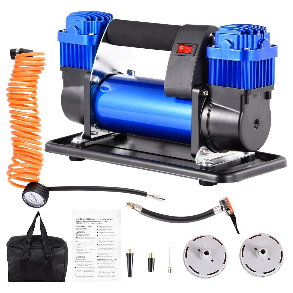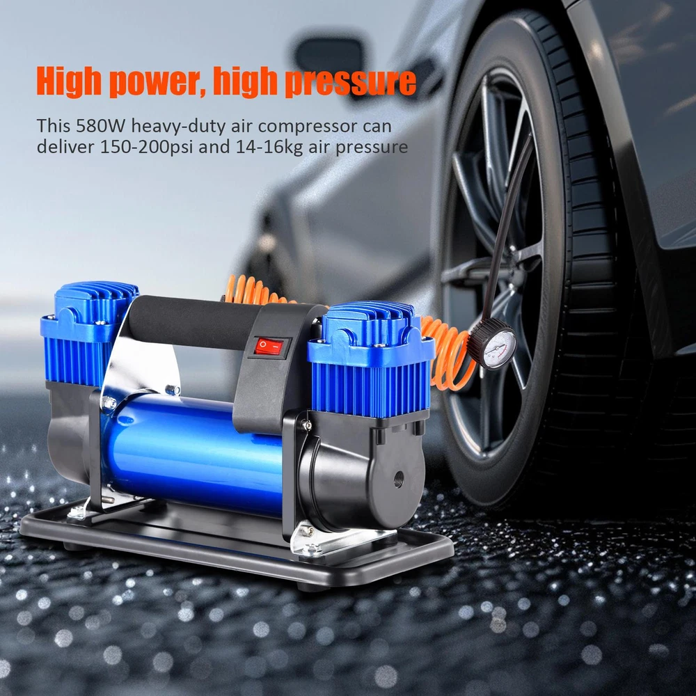 Store category Sign Up Now ! You may also like Product Description Ease of Use: Seamlessly inflate tires with our 580W air compressor; designed for 12V car voltages, it's ideal for large off-road vehicles and quickly defrosts, ensuring easy use and rapid inflation.\nHigh-Efficiency Inflation: Equipped with a 40 double-cylinder for high power, this air compressor delivers 150-200psi pressure, ensuring rapid inflation of 14-16kg with precision, thanks to its accurate pressure gauge.\nRich Accessories: Starting with a 2.5m wire for easy reach, this air compressor boasts a 7m inflation tube that folds to 3 meter, includes 3 nozzles, 2 filters, and a tool kit, ensuring a seamless experience.\n3 Types of Air Nozzles: Whether for SUVs, pickups, RVs, or off-road vehicles, this air compressor adapts seamlessly, also fitting MPVs, ATVs, and trailers, not to mention its perfect compatibility with electric bicycles and motorcycles. It's a necessary tool for inflating beds, swimming rings, and balls, enhanced by three additional nozzles for all your needs.\nDurability for Extreme Conditions: Engineered for the desert, this all-metal air pump withstands high temperatures and pressure, resists thermal expansion and contraction, and keeps unfazed by the cold—ideal for frequent off-road adventures.\n\nLook no further than our 12V compressor! With the ability to inflate 14-16kg, it comes with rich accessories and is perfect for use with inflatable beds, swimming rings, and balls. Plus, its cold resistance means you can use it in any weather.\n\n Specification: Product name: air compressor Material: metal, copper winding Color: blue Voltage: 12V Power: 580W Air pressure: 150-200psi Model: 40 double cylinder Features: metal air pump, high temperature and low temperature resistance Applicable scenarios: Our car air compressor is especially suitable for SUV, pickup truck, RV, 4x4 off-road vehicle, MPV, ATV, campers, trailer, motorcycle. Equipped with 3 additional air nozzles, it can also be used for inflatable beds, swimming rings and balls, bicycles, electric bicycles, motorcycles, etc. Atmosphere time: 1-3 minutes Product size: about 33.5x14x19cm/13.19x5.51x7.48 inches Packaging size: about 38x27x26cm/14.96x10.63x10.24 inches Product Weight: about 7kg\nPacking List: 1xHeavy duty compressor 1x7m air hose 1x2.5m electric wire 1xInstruction manual 1xTool kit 3xAir nozzles 2xFilters Note: 1. Due to the different display and lighting effects, the actual color of the product may be slightly different from the color shown in the picture. Thanks! 2. Due to manual measurement, a measurement deviation of 1-3cm is allowed. Payment Delivery details Terms of sales About us Feedback & DSRs Payment Before you palce an order, please kindly make sure that you have a paypal account. We accept PAYPAL payment only. Payment should be completed within 2 days after auction closed, or unpaid dispute will be filed for an closing auction. An unpaid case will be filled after 4 days. Delivery details We ship to your eBay address. Each package will be shipped to US by UPS Regular Parcel with tracking number. Please check your shipping address carefully before checkout, it can't be changed if order completed. All items will be shipped within 1-2 business day upon receipt of payment.Orders placed on weekend will be shipped within 3 days. If you do not receive your item in 7-10 business days.please contact us immediately for further assistance. We will be responsible for any damages or losses incurred in the shipping process. About us We maintain high standards of excellence FIVE STAR and strive for 100% customer satisfaction! Positive Feedback is very important to us. We hope that you contact us immediately Before you give us neutral or negative feedback, so that we can satisfactorily address your concerns. We promise to offer the lowest price and high quality produce. Our working time: From Monday to Friday(9:30 am to 18:00pm), we don't working on holidays ,hope you can understand and know that , thank you. Please always talk to us via ebay Message. We appreciate your business and look forward to growing our e-Bay sales with satisfied customers. Feedback Contact us If you have any questions, please feel free to contact with us by ebay Message during our business hours ( 9:30a.m. to 5:30 p.m.), or email us through eBay, we will try our best to help you to resolve it. For any presale or after-sale questions,please do feel free to email us! Due to the time difference, each email will be replied within 1 working day,and weekend will be delayed a bit. Feedback