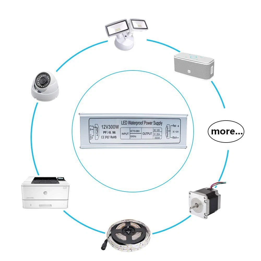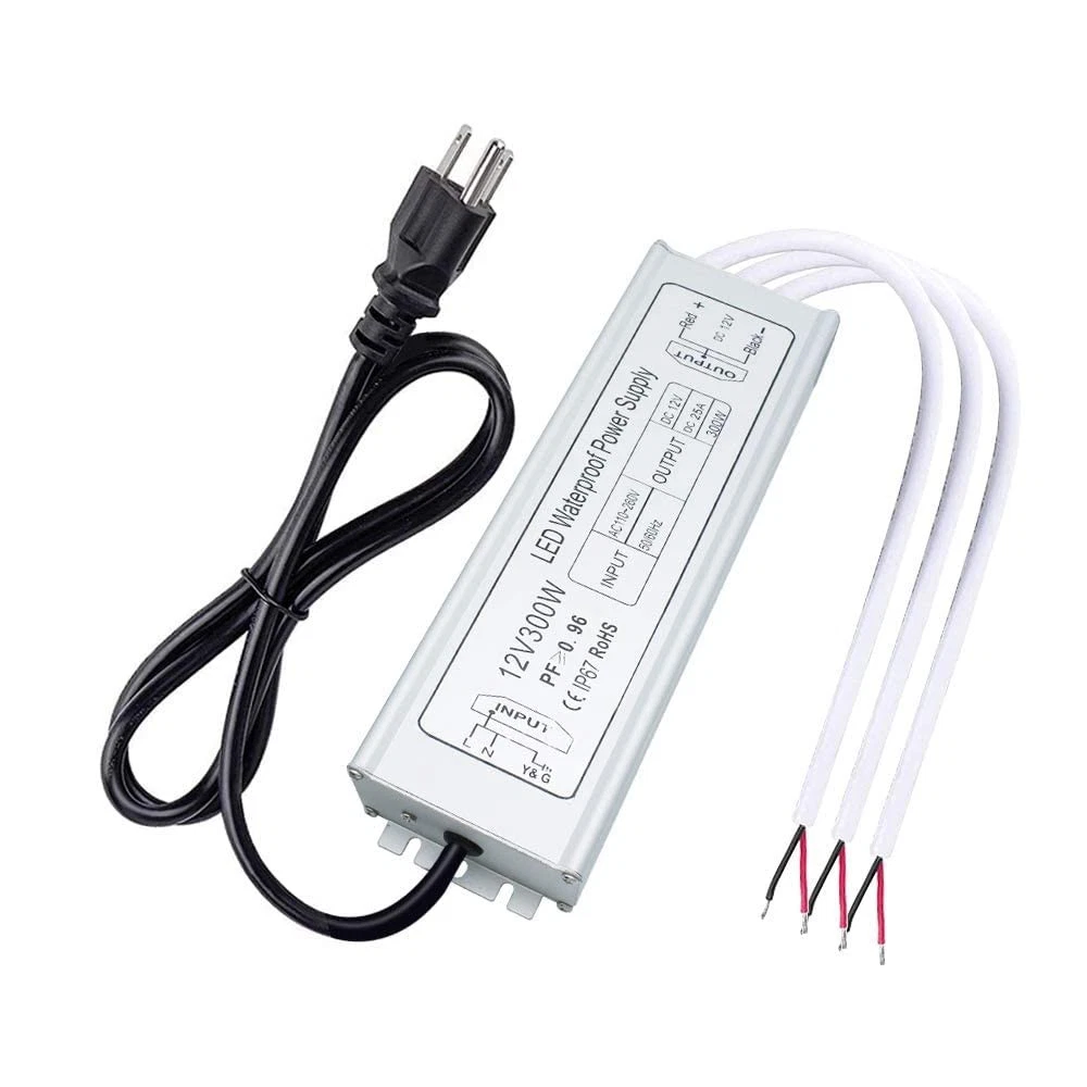 12V power supply features a sturdy aluminum alloy shell for heat dissipation and long-term stability. Sealed IP67 waterproof, it withstands harsh conditions, providing reliable power in environments with moisture, humidity, or water exposure Input: 110-260V AC 50/60HZ, Output: 12V DC 25A 300W. Suggestion:Use no more than 80% of the power supply's capacity; ensure good ventilation to avoid temporary shutdown due to overtemperature ; the driver will function again once it cools down Converts 110V AC to 12V DC with 3 outputs of 100W each, totaling 300W. Ideal for 12V DC LEDs (≤300W). Ideal for outdoor lighting, industrial settings, and events; ensures reliable and safe power for smooth operation in challenging conditions Automatic protection for: short circuit, overload, over voltage, over current, high temperature; type: Hiccup mode, auto-recovery after fault condition is removed. They can operate at temperatures of -20℃~+60℃, 20%~90%RH (non condensing) Our seller support team always stand behind our products in any way, so please find us for replacement if you have any quality problems