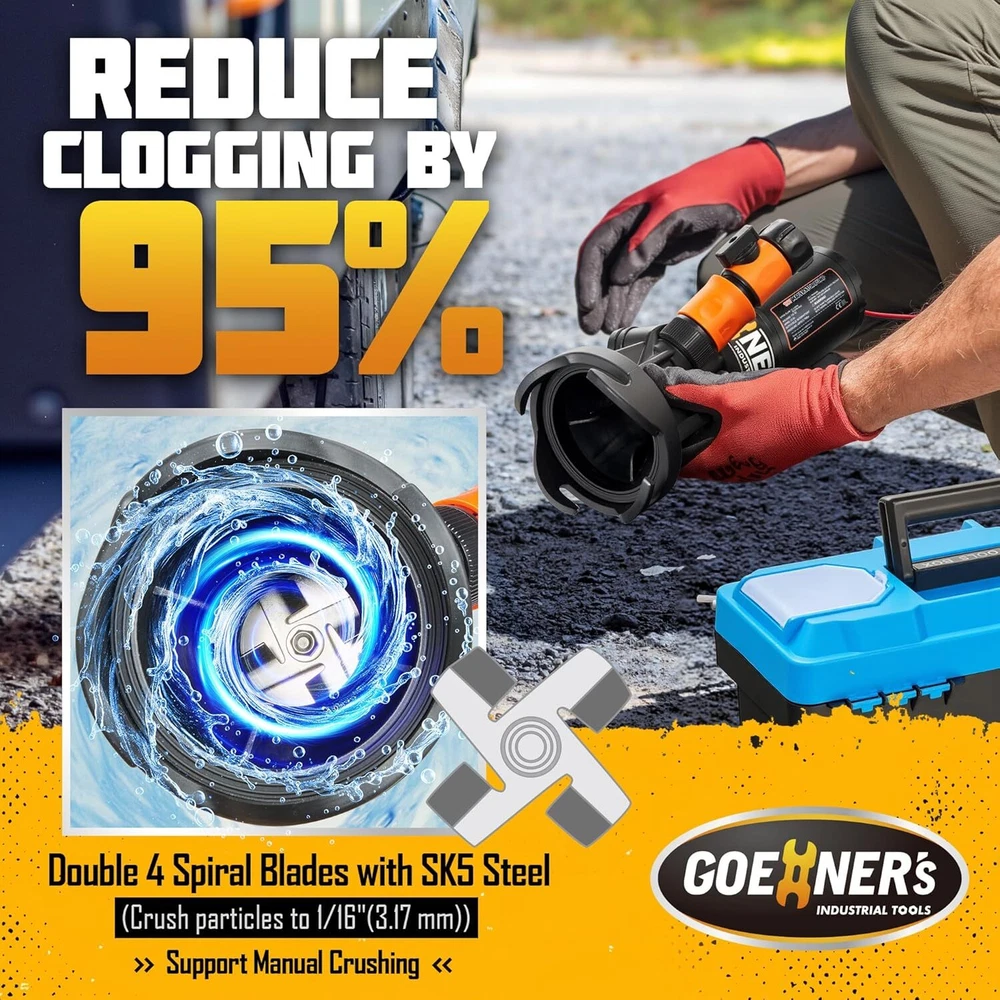 Brand GOEHNER'S Color Black Material Copper Style Submersible Product Dimensions 11.4"L x 3"W x 4"H Power Source Battery Powered Item Weight 6.9 Pounds Maximum Flow Rate 12 Gallons Per Minute Maximum Lifting Height 10 Feet Voltage 12 Volts About this item 【Self-Priming RV Macerator Pump】The RV macerator pump feature double 4 Spiral blades, which reduces particle size to 1/16 inch maximum, reduce clogging by 95%. 【Product Specification】Complete RV Macerator Pump Kit, don't need to buy any accessories, connects to standard 3" RV waste outlet. Water Inlet: 3 inch, Water Outlet: 1 inch, Voltage: 12V DC , Flow Capacity: 12 GPM, Self-priming Suction: 3.2 feet, Lift: 10 feet, Current: 12A. 【High Performance】This macerator pump is composed of an all-copper motor, which has the advantages of low power consumption, high performance, stable operation and low noise. A standard 150-liter sewage tank can be emptied within 5 minutes. 【Convenient and Safty】Comes with 2 power cables, 7ft Cigarette lighter adapter cable and 11-2/5" Alligator clip adapter cable, which can be easily connected to the power supply. Built-in thermal overload protection. When the motor is overheated, it will automatically stop the pump and restart automatically when the temperature drops to a tolerable range. 【Easy to Clean】Fresh water rinse and manual crushing function, Cleanly handles Waste water from holding tanks with a self priming, powerful macerator pump. This is a great solution for emptying holding tanks on recreational vehicles break camp. Product Description