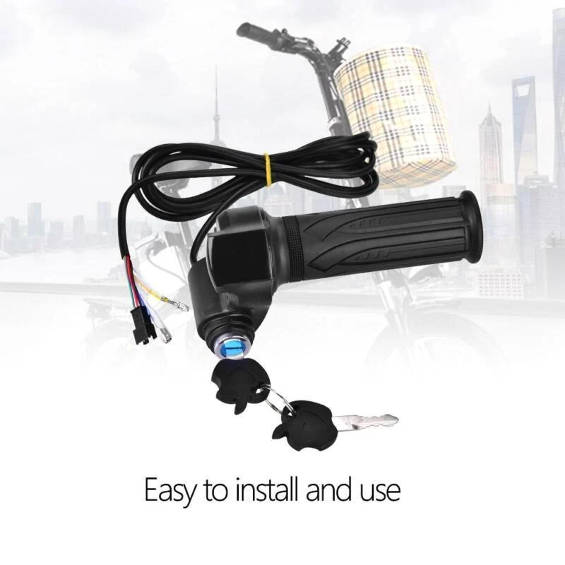 Features: This pair of handlebar grip adopts good quality materials, waterproof, sturdy and . The handlebar grip are design according to ergonomics, the on it are good for comfortable and anti skid holding. Easy to install and use, the cable length is about 2m, enough for most uses. With electric lock function, suitable for electric , cars, scooters. Specification: Material: Rubber + Color: Black Power Display: suitable for 12V, 24V, 36V, 48V, 60V, 72V Hall Input Voltage: 0.8-4.2V Waterproof Grade: Rainproof Quantity: 1pair Handlebar Size: Approx. 15 x 9cm / 5.9 x 3.5in Cable Length: Approx. 2m / 6.56ft Weight: Approx. 323g Package List: 1 x Pair of Grips 2 x Keys Note: Each cable is labeled with color for different uses. Blue: Electric Lock Yellow: Motor Positive Electrode Green: Hall Motor Black: Handlebar Negative Red: Handlebar Positive Please note that the new type and old type of this product will be sent randomly, and make sure you will not mind before ordering.