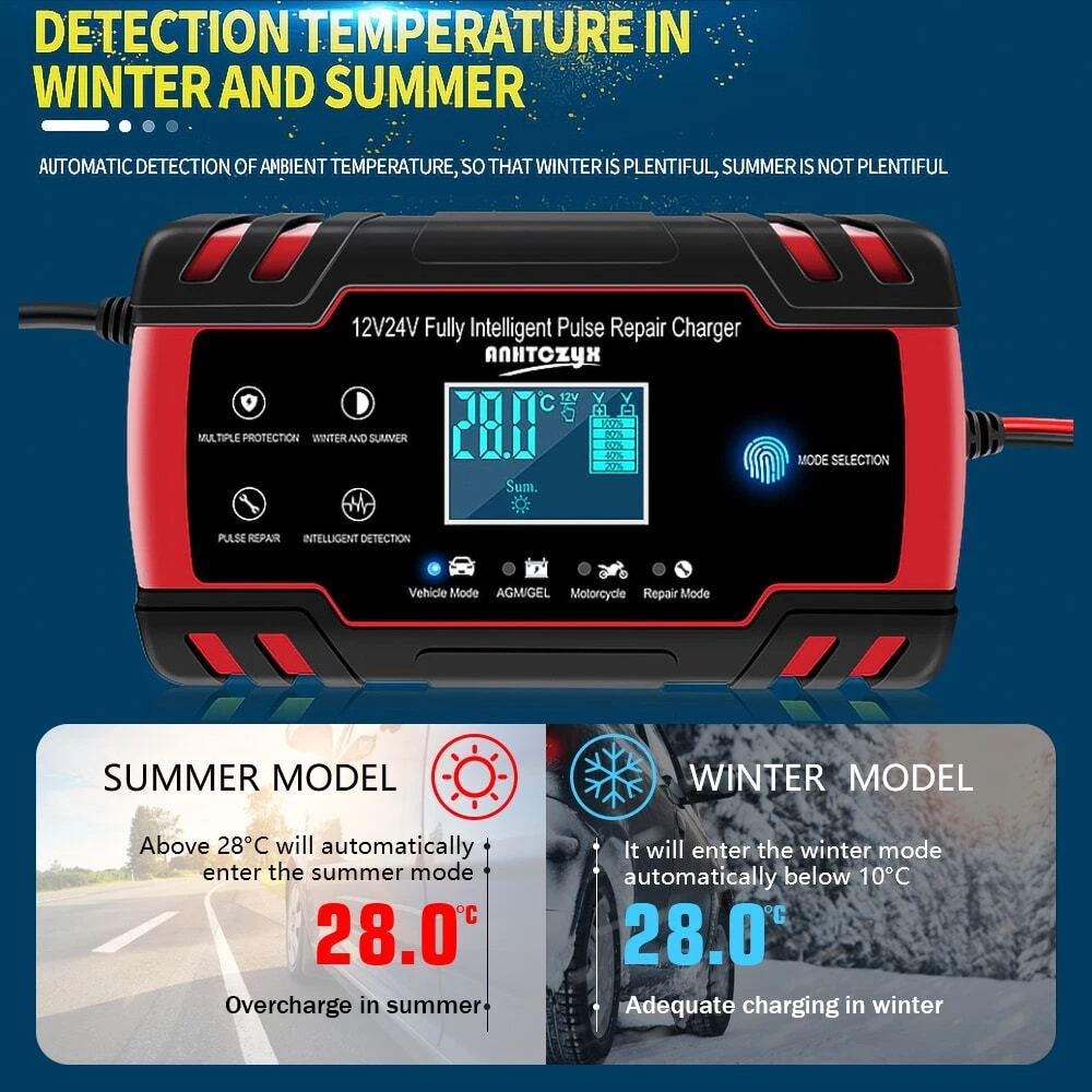 Specifications: Charging current: 8A (mA) Charging time: 10h Battery types: Most types of batteries include calcium, gel and AGM, wet, EFB, etc. Switch mode technology: Yes Polarity protection: Yes Output short-circuit protection: Yes Non-battery link protection: Yes Overvoltage protection: Yes Overtemperature protection: Yes Cold function: Fan Input voltage: 100-240V AC, 50-60Hz Rated output: 12V8A/24V4A Minimum starting voltage: 2.0V Battery range: 6-150Ah Thermal protection: 65'C+/-5'C Efficiency: App.85% Size: 162*100*55mm Features: 1. Microprocessor control (CPU); 2. Three-stage automatic charging, which is a fully automatic battery charger with 3 charging stages, automatic charging can prevent the battery from overcharging, so you can connect the charger to the battery indefinitely; 3. The three-level charger is suitable for most battery types, including calcium, gel and AGM, wet batteries. They may also help restore depleted batteries; 4. Use LED display to see the data more intuitively. Packing list: 1* car battery charger 1* Instruction manual