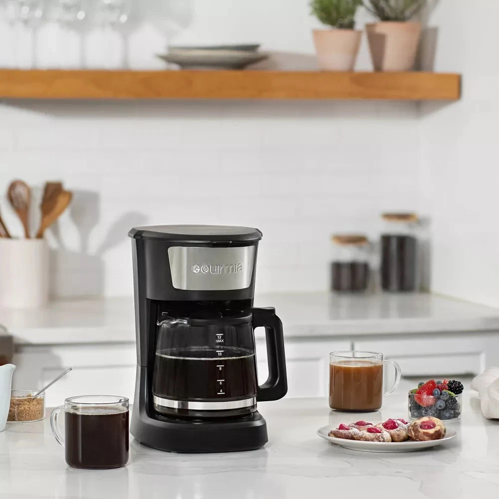 Highlights Making delicious coffee is as simple as 1, 2, 3: turn on the coffee maker, press brew, and enjoy Brew for one or a crowd with Gourmia’s 12-Cup Coffee Maker Pause the brew at any time and pour a quick cup before the rest is ready with Pause & Serve Brew in the morning and enjoy a cup anytime afterward with Automatic Keep Warm Always keep track of water levels with an EZ-View Water Window Modern design with stainless steel accents will enhance the décor of any kitchen Description Brewing coffee in your Gourmia One-Touch Coffee Maker is as simple as 1, 2, 3. Just turn it on, press brew, and enjoy. Whether you’re brewing for one or a crowd, the Gourmia Coffee Maker, which can serve 2-12 cups, is perfect for you. With Pause & Serve, you can pause a brew anytime to pour a quick cup before the rest is ready. The coffee maker was designed to save you time and accommodate even the busiest of schedules. Enjoy a cup anytime with Automatic Keep Warm, a feature which keeps brewed coffee piping hot for as long as the coffee maker is kept on. Always keep track of water levels with an EZ-View Water Window. Delicious coffee is not the only benefit you’ll receive from your Gourmia Coffee Maker. A strikingly modern design with stainless steel accents will enhance the décor of any kitchen. Get brewing with Gourmia! Specifications Dimensions (Overall): 12.12 Inches (H) x 7.71 Inches (W) x 9.84 Inches (D) Weight: 3 Pounds Capacity (Volume): 12 Cup Cup Capacity: 12 Coffee Filter Type: Basket Filter Coffee Type Used: Ground Coffee Wattage Output: 700 Watts Cup Capacity Size: 8 oz Material: Plastic, Glass Power Source: Electric Battery: No Battery Used Care & Cleaning: Care Instructions Not Provided Warranty: 1 Year Limited Warranty. To obtain a copy of the manufacturer's or supplier's warranty for this item prior to purchasing the item, please call Target Guest Services at 1-800-591-3869 TCIN : 89270806 UPC : 810002864797 Item Number (DPCI) : 072-08-6562 Origin : Imported