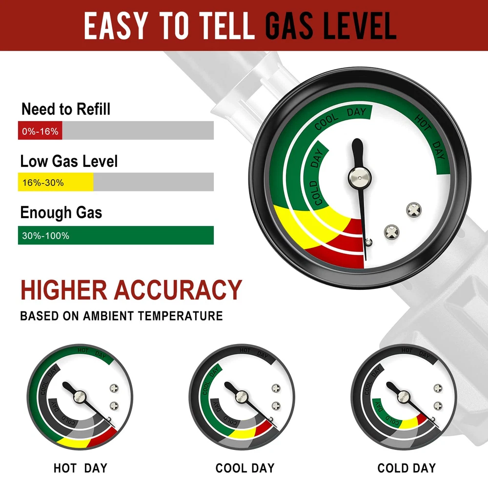 PERFECT COMPATIBILITY: Specially designed to gain better compatibility and to enable easier /connection, 12FT Propane Hose Adapter 1lb to 20lb are ideal for buddy heater, Coleman camp stove, Weber Q Grill, Blackstone 17” & 22” Griddles, and other tabletop travel grills. A good grill/heater hose to connect 1lb portable appliances to 20lb tanks. KNOW YOUR GAS LEVEL ACCURATELY: This propane gauge with hose accounts for ambient temperature, acclimating the dial to hot, cool or cold days to reflect variance in gas pressure. Also, designed for an easy readability at a glance, the color-coded dial features large dial graphics that can effortlessly tell sufficient, low and refill gas levels UNSURPASSED QUALITY & ENHANCED LIFESPAN: Accurately engineered from flame-retardant PVC and with 100% solid brass ends, the leakproof and weather-resistant propane tank hose of 3-layer construction enjoys longer lifespan and are trustworthy in seamless connection, safety, durability and sturdiness. CONSISTENT GAS FLOW & REASONABLE HOSE LENGTH: Taking customers’ needs into full consideration, propane adapter 20lb to 1lb converter supports a consistent gas flow to achieve a nice plate of grilled meat. Also, the propane hose length is designed at 12 feet, satisfying your demand for moving any 1lb appliances to any desired locations. INSTALLATION in a BLINK & SAVING $ on 1lb CYLINDERS: Simply hand tighten the black end to 20lb propane tanks and the brass to 1lb small appliances. You will find it a piece of cake to install the propane grill hose to tank with QCC1/type1 connectors. The propane hose 1 lb to 20 lb will save your time, energy and money on those expensive 1lb cylinders.