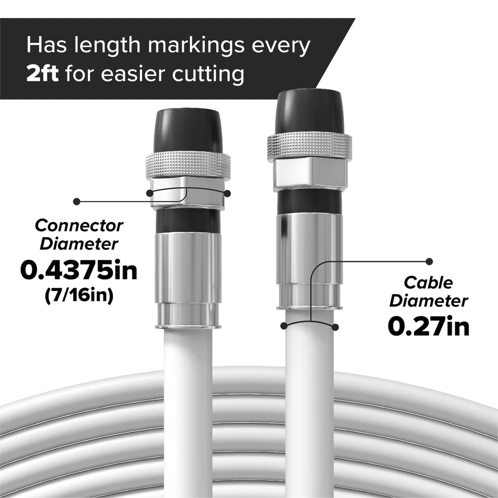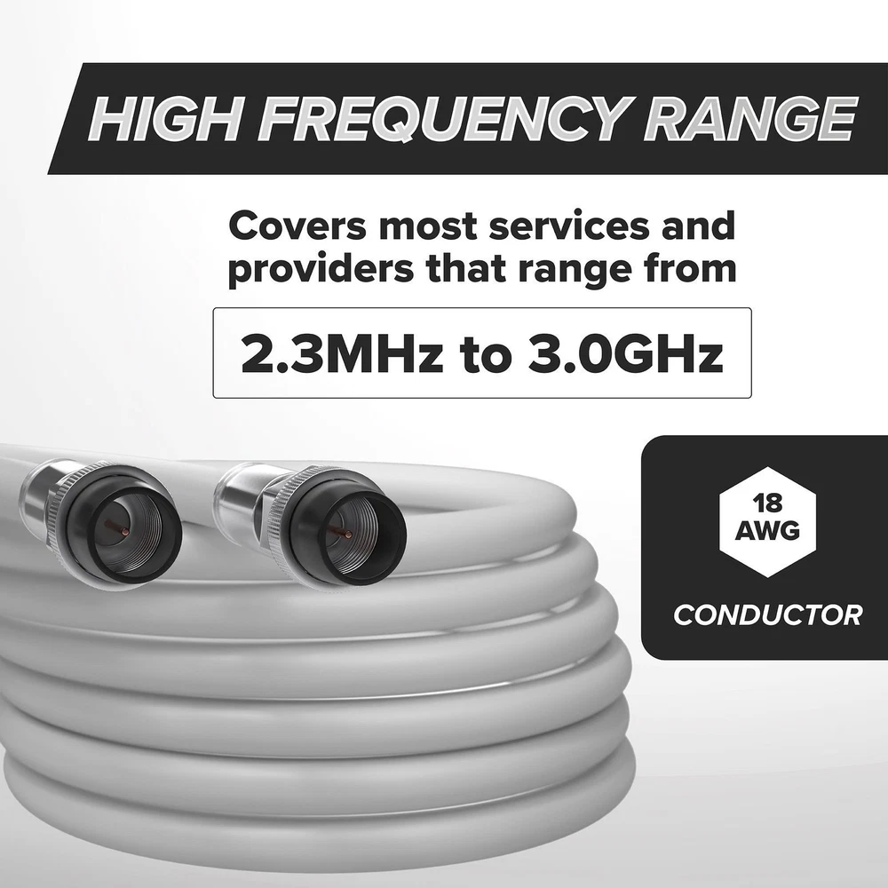 Includes: 1 one coaxial Cable with f-pin connectors & US manufacturers warranty for quality assurance Tested and approved for the use with Cable Modems, Televisions, Satellite Receivers, Off Air Antennas - including HD Antennas; Compatible with: DIRECTV, Dish Network, Comcast, Charter, Verizon FiOS, AT&T, U-Verse, FTA, OTA, HughesNet, Wild Blue, Excede, Cell phone wireless extenders, and many other services and providers. Low loss Cable for exceptional signal and picture quality, even over long runs. Works great indoors and outdoors, with a highly durable weather proof and UV resistant PVC outer jacket. High quality consistent 75 Ohms throughout the whole cable. High quality, weather proof, outdoor rated connectors will not pull off, break, lose signal, or come lose and are water proof using a redundant double seal at each end of the connector. Each Connector has an attached rubber weather boot to ensure there is never any moisture inside the connector. High frequency range with an 18 AWG center conductor to cover almost all services and providers that range from at least 2.3MHz to 3.0GHz, with exceptional shielding - using 80% braid and 100% shield. Technical Specifications: Cable End #1: Coaxial F Pin Male Cable End #2: Coaxial F Pin Male Cable Length: 12 Feet Cable Length: 144 Inches Cable Length: 3.6 Meters Cable Length: 4 Yards Cable Shape: Round Cable Capacitance: 16.2 Farad Center Conductor Gauge: 18 AWG Center Conductor: Copper-Clad Steel Coaxial Frequency Range: 2.3 MHz - 3.0 GHz Coaxial Size: 0.25 (1/4) Inch Coaxial Size: RG6 Color: White Connection Split/Duplication: One to One (1:1) DC Resistance: 6.54 Ohm Full Cable Length: 12 Feet (3.6 Meter) Impedance: 75 Ohms Jacket Material: PVC Maximum Frequency: 3.0 GHz Output Voltage: 60 V Shielding Material: Aluminum Magnesium Alloy Temperature Range (C): -40 to 75 C Temperature Range (F): -40 to 167 F Type: Coaxial F Male-Male UV Protected: Yes THE CIMPLE CO, A Family Company located in the USA, is proud to manufacture this high quality and durable coaxial cable. This cable is available in Black and White, and comes in lengths from 1 foot to 200 feet (including our most popular lengths of 10 feet, 25 feet, 50 feet, 75 feet, and 100 feet). The center conductor is made of high grade copper coated steel that has been swept to 3.0GHz, making this a great application for Satellite, Cable, Wireless (including cell services), and Communication uses. With very low signal attenuation (2.75dB at 750MHz for our 50ft cable) it can be used on long runs without the loss of signal or picture. We use high grade 360 degree weather proof compression connectors to ensure that this cable remains water and weather proof, without the loss of any signal. This ensures that the ends can withstand pulling, weather, extreme hot and cold (rated up to 167 degrees F). The coaxial shielding is 80% aluminum magnesium alloy braid and 100% solid aluminum foil (including an 18% overlap) to ensure that there is no interference from neighboring or rouge signals. The outer jacket is a flexible UV resistant PVC and has been tested to be used in many extreme conditions for use both inside and outside. The dielectric center is made from gas injected foam PE and has an almost perfect consistency of 75 Ohms +/-3 throughout the entire length of the coax cable. The outside diameter of the cable is 0.27 inches, about 6.85 mm, with the connectors being slightly larger at .4375 (7/16) of an inch (11.11 mm). The cable also has length markings every two feet on the side to make it easier to cut to length, if you need a shorter wire. We also offer a repair and splice kit for those who would like to cut and reinstall the ends on the wire. The kit comes complete with instructions and free technical support. We back our product 100%, with free returns, as well as free technical and customer support.