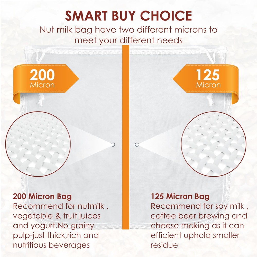 The Nylon Nut Milk bag has been designed to make the most amazing plant based milks a breeze. Can be used for nut milk, oat, rice or soy. It can also be used for making cheese or straining kefir, broth kombucha or other home made goodies. How to make fresh nut milk: STEP1: Activate your Nuts Soak ½ cup raw almonds or other nuts in 1 cup of water overnight. Roasted nuts won't activate but they will soften. STEP2: Blend Drain your soaked nuts and place in a blender with 2 cups of fresh water. Add a pinch of salt and sweetener (optional). Blend for 1-2 minutes until smooth, scraping down as needed. STEP3: Strain Place your Keeper Nut Milk bag in a glass, bowl or jar and pour your blended mixture into it. Squeeze the bag until you have extracted all of the milk and the sodilds are dry. Makes 500ml. Store your fresh nut milk in the fridge in a sealed jar or bottle and use within 3-5 days. HIGH QUALITY MATERIAL - The nut milk bags are Made with high-quality & food-grade nylon; this is a superior alternative to the conventional muslin cloth., It is crafted from nylon with a fine weave for superb straining. Also its best nylon mesh has been with perfect shape & size to give us more surface area to squeeze. TWO DIFFERENT MICRONS - 2 different micron of nut milk bags that meet your different needs. 200 Micron-Recommend for filtration of soy milk, juice, Yogurt (with residue). 125 Micron-Recommend for filtration of milk, coffee, tea or liquids (filter out smaller impurities). DOUBLE REINFORCED STITCHED - Using the highest quality lines and won't rip or tear easily. No messy lint, no more stitching coming loose. Outward seam makes our bag MUCH easier to clean. Plus, it doesn't let pulp through and will remain smell free for the longest time. USER-FRIENDLY & COST-EFFECTIVE - Quickly strains various liquids very easily and thus saves a lot of time & energy; Requires minimal effort while squeezing making its use convenient by everyone.Eliminates the need of having a costly juicer as it is ideal for sieving fine juices of various fruits & vegetables quickly. MULTI TASKER - You can use this nut milk bag to finely filter various homemade dairy-free milk, such as coconut milk, almond milk, cashew milk, oat milk, etc, you can also use it to sieve fresh juices of fruits 8 vegetables easily and enjoy them with your family. Great for home use and travel.