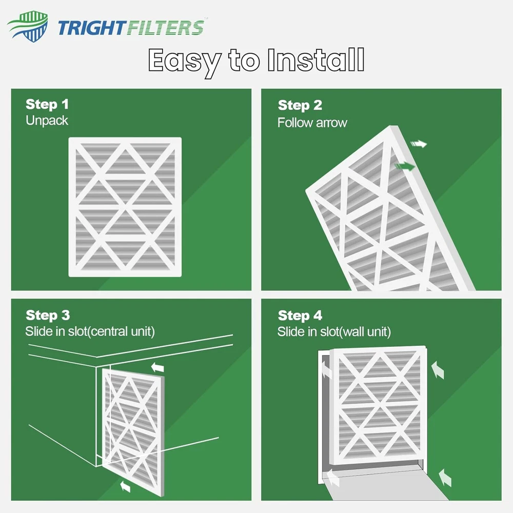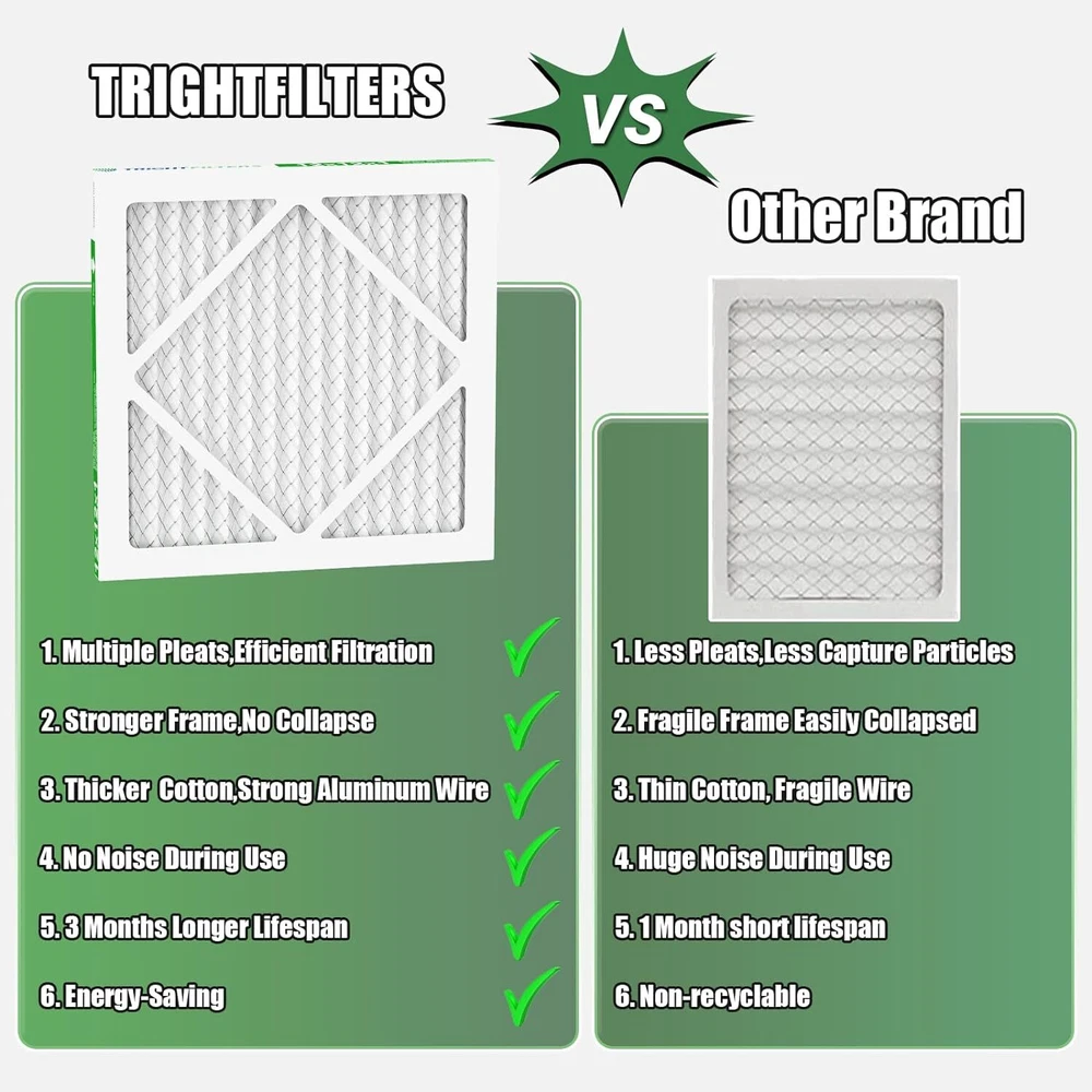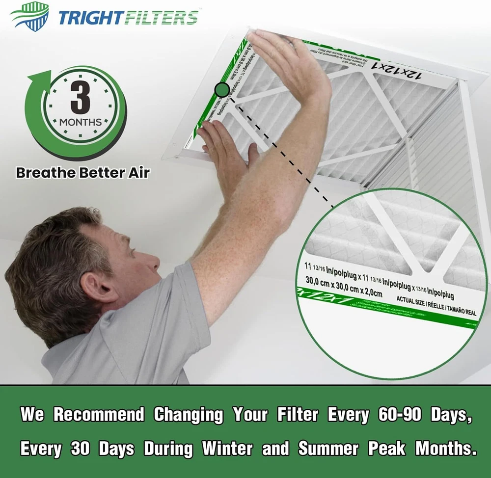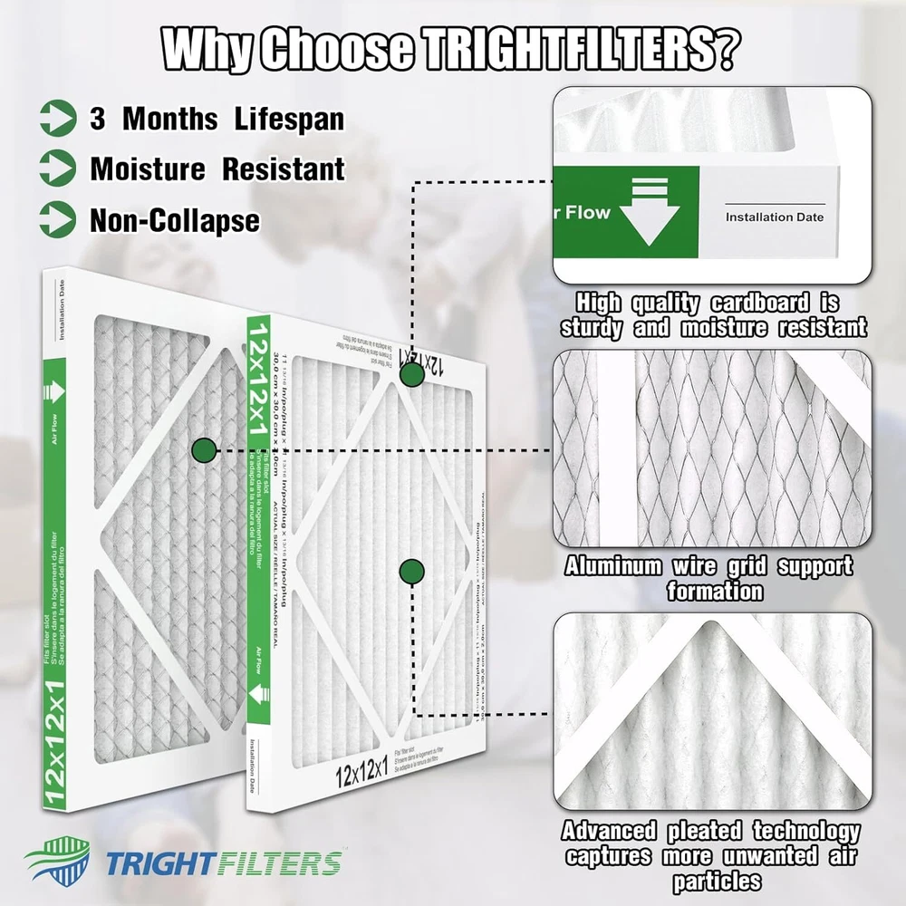 12x12x1 Air Filter 6 Pack, Durable MERV 8 Pleated Home HVAC AC Furnace Filters, Lightweight Compact Air Conditioner Filter Replacement Product Details Brand: TRIGHTFILTERS Material: Aluminum, Paper Product Dimensions: 11.8"L x 11.8"W x 0.79"Th MERV Rating: 8 Compatible Devices: Air Purifier, Air Conditioner, Air Cleaner, Furnace Item Weight: 0.29 Pounds Number of Items: 6 Manufacturer: TRIGHTFILTERS Product Grade: Like New Top Performance: TRIGHTFILTERS 12x12x1 air filter are made of durable thickened white cardboard that strengthens the overall structure without collapsing, providing better capture range and more consistent high-performance filtration with no noise during use. actual size: 11.81x11.81x0.79in High Efficiency Filtration: MERV 8 replacement filters have more pleats compared to most retail home air filters and merv8 has better air permeability relative to another merv rating, providing better airflow and efficiency and protecting your machine from damage and extending the life of your machine Captures Tiny Particles: MERV 8 AC 12 12 1 furnace air filters comparable with MPR 600,FPR 5,keeps trapping 92% of particles as small as 0.5 microns in the air and filter off such as household dust, microscopic particles, lint, dust mites, spores, and pollen, while allowing cleaner air to flow through, giving you a more comfortable and healthy environment Wide Compatibility: AC filters are suitable for furnace, air conditioner, HVAC filter and house vent, Our compact and stable home filters are not only good for your health but also can save you thousands of dollars in repairs and lower monthly energy bills, making them ideal for anyone who wants clean and fresh air Easy to Use: Installing or replacing our 12x12 air filters for AC units or furnace is as simple as it gets. First, you need to turn off your stove, and then Simply slide the filter into the air filter return device as indicated by the arrow to done! for optimal performance of your heating or cooling or hvac system, change your filters every 60 to 90 days but increase frequency to 30 days during peak summer and winter months