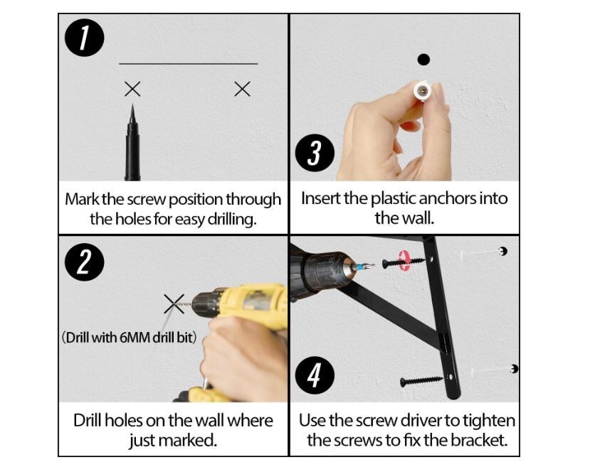12" x 8" Heavy Duty Shelf Brackets with Screws Metal Shelves Supports Wall Mo Color Black Item dimensions L x W x H 11.8 x 0.6 x 7.5 inches Item Weight 2.27 Kilograms Finish Type Powder Coated About this item Package includes 12 x Brackets , 24 x Long Screws and Anchors, 36 x Short Screws. Made of high quality steel with black powder-coating finish, our brackets are durable, water and corrosion resistant. Pre-drilled fixing holes on each side and included screws are convenient for installation. Heavy duty design with max weight capacity per pair is up to 110lb/50kg. Perfect for DIY floating shelving for your home, office, garage and kitchen etc.