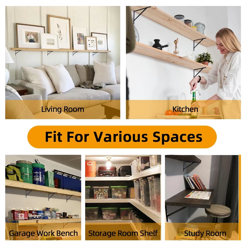 【12 Inches Shelf Brackets】: 6 Pack-12 x 8 inch shelf brackets,including Mounting Hardware.These brackets are designed to support shelves from 12 inches to 14 inches deep. 【Heavy Duty Shelf Brackets】:Our shelf bracktets are fabricated from exceptional steel, characterized by acceptable appulse attrition and no acrylic off. Widely acclimated in assorted apartment of the home, including garage, kitchen, laundry, backyard, etc. 【Rust-proof Coating】 Sturdy steel material with a black -coated finish is durable, chip- and corrosion-resistant. The smooth and rounded surface makes it easy to maintain. 【Easy to install】: The shelf brackets are easy to install, We offer regular screw and butterfly expansion tubes that can be installed on lime or plaster walls 【Quality Services】:We have high efficiency after-sales service. If you have any questions in the process of using, please feel free to us. Our team will help you solve the issues ASAP