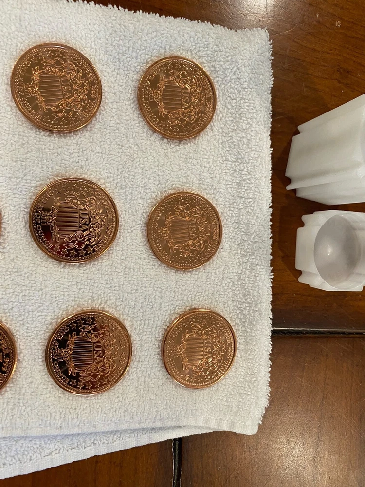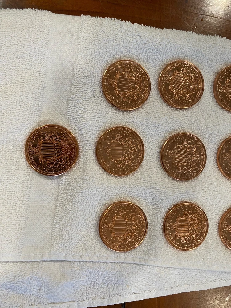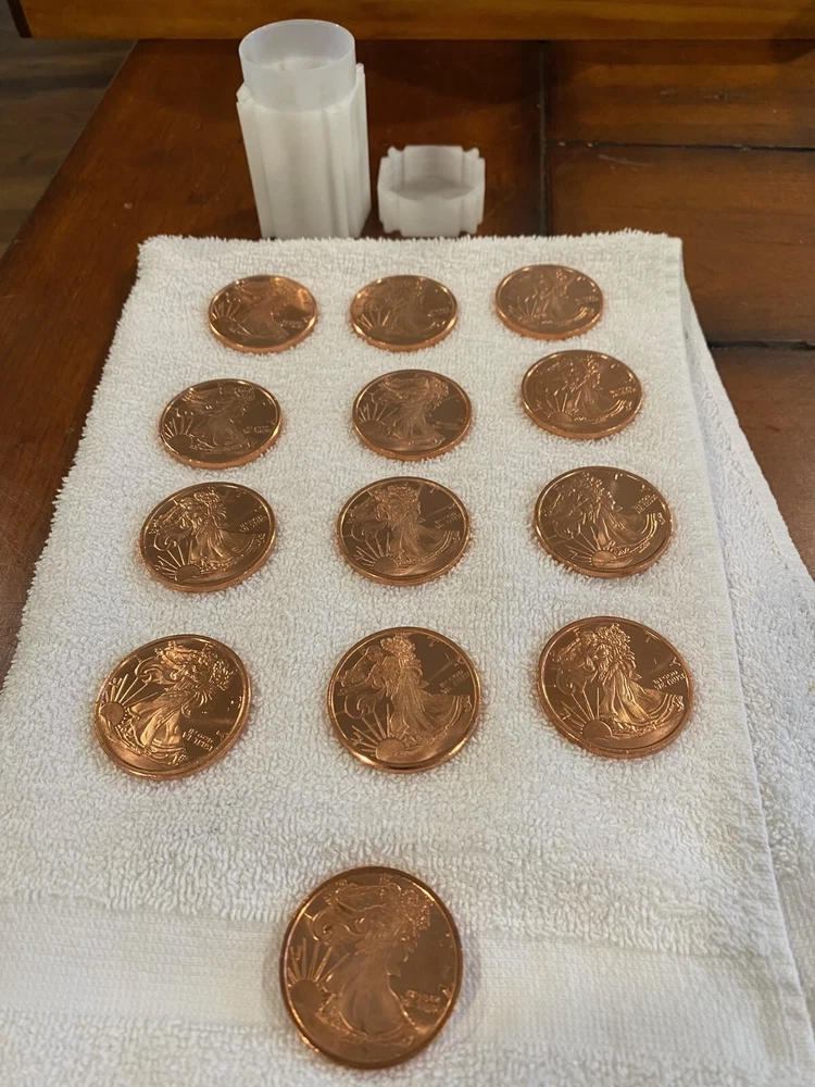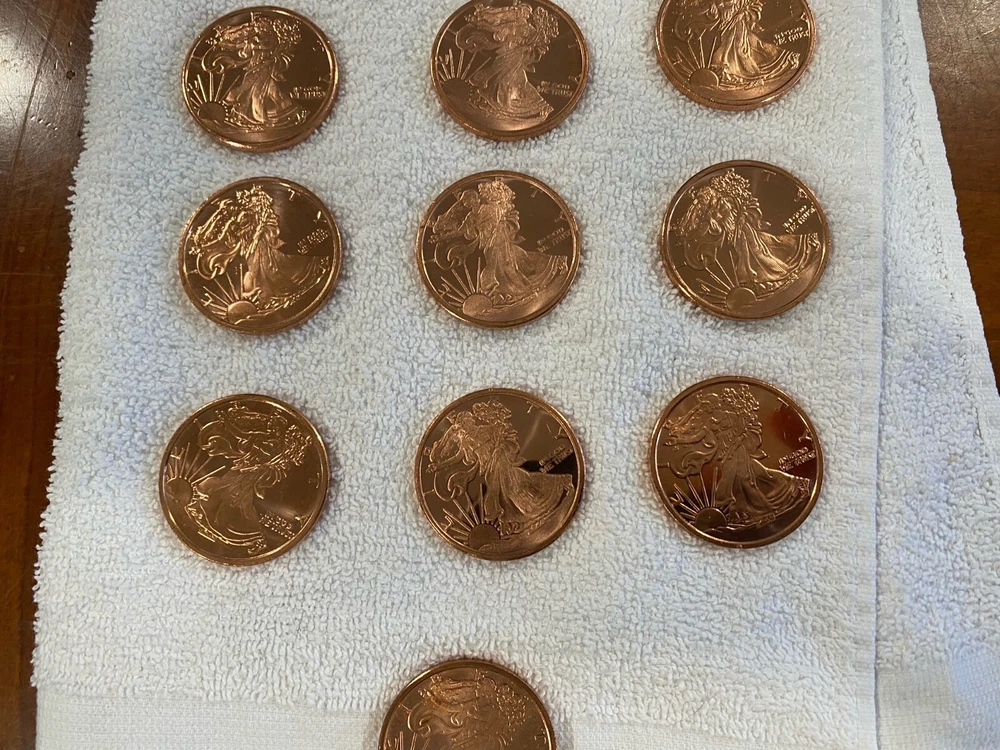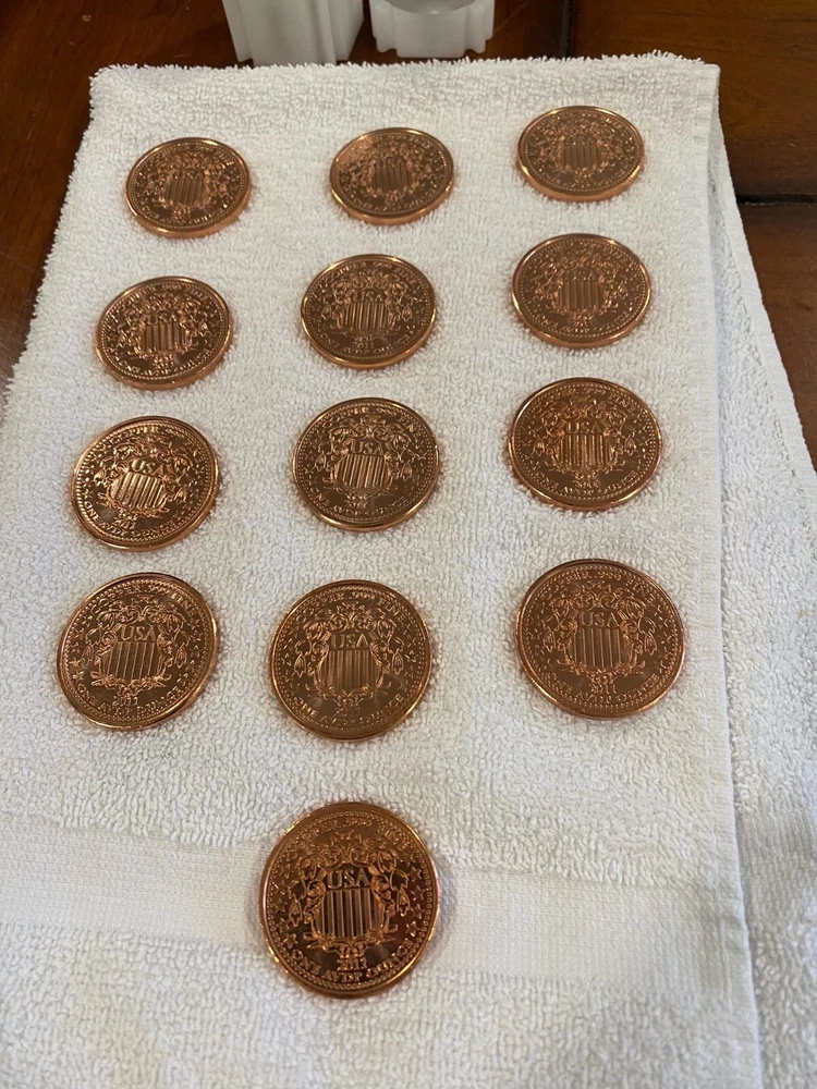 13 Coins Total - each is 2011 Shield Back 1 oz .999 Pure Copper Walking Liberty Coin 1 oz .999 Pure Copper Medallion Comes in a Nice vinyl protective Case Diameter = 39 mm (1.54 in.) ~ Slightly larger than a US Silver Dollar Thickness = 2.5 mm (0.098 in.) Gross Weight = 1 Avoirdupois ounce (28.35 grams)