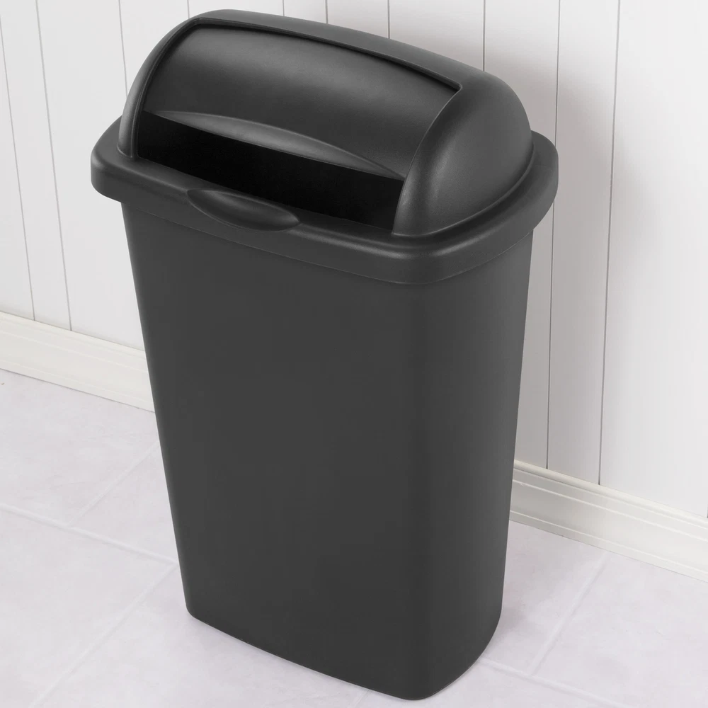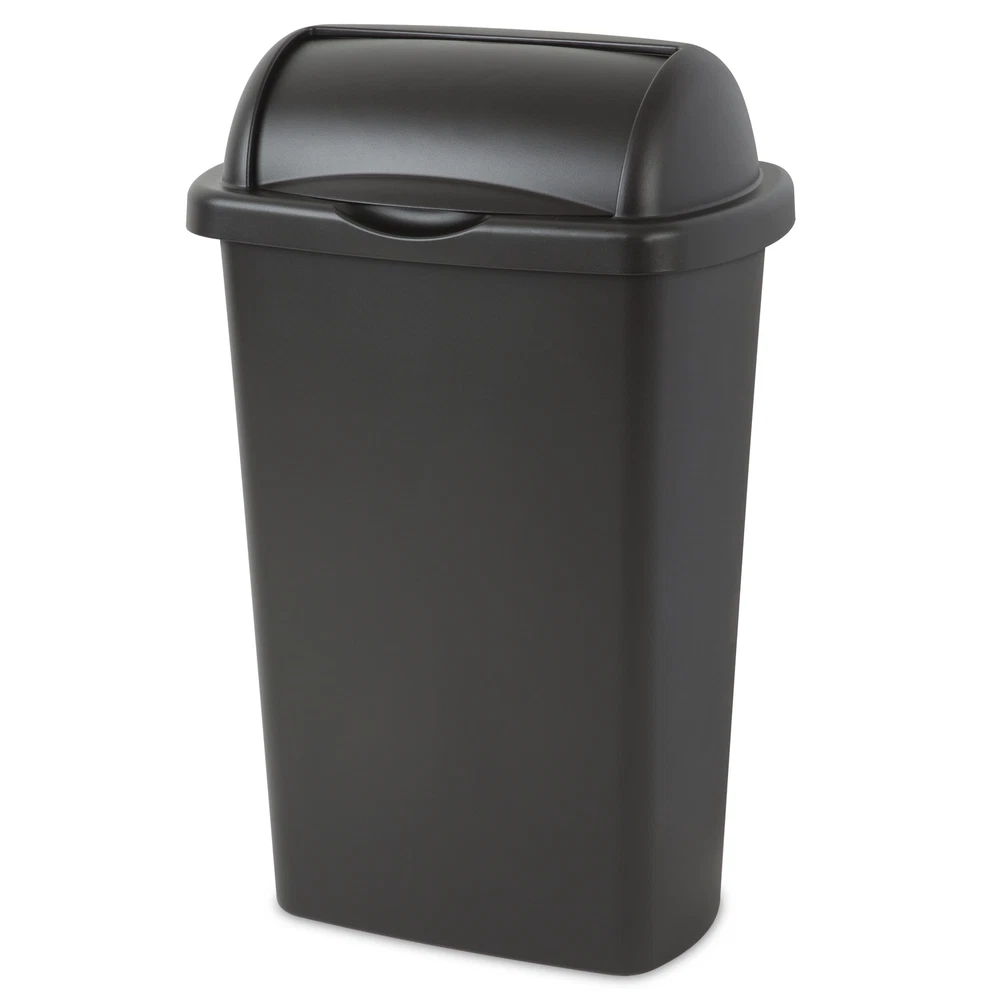 The 13 Gallon Roll-Top Wastebasket features a lid that rolls up, stays open and returns closed, all with minimal effort. The large opening allows for disposal of oversized items while leaving the lid rolled up. The design coordinates with any kitchen décor and this wastebasket features an easy-to-clean textured surface. It accommodates a standard 13-gallon trash liner or it can be used to collect recyclable material. This Wastebasket is ideal for all areas of the home including kitchen, garage, basement or even the office. It's durable design will hold up to regular day-to-day use and confidently conceal contents. The overall assembled dimensions of this item are 18 3/8" L x 12 3/8" W x 28 3/8" H. Adult Plastic 13 Gal. Roll Top Wastebasket Black: Outside Dimensions: 18 3/8" x 12 3/8" x 28 3/8" Large 13 Gallon capacity makes this the ideal size for kitchen use Single unit option Classic color to complement all décor - Black The 13 Gal RollTop lid opens with a touch and stays open for easy disposal Lid rolls up, stays open and returns closed with minimal effort Coordinates with any kitchen décor Easy-to-clean textured surface Accommodates a standard 13-gallon trash liner Ideal for use in the Kitchen, Bathroom, Bedroom, Dorm Room, Mudroom or Basement BPA-free and phthalate-free Made of easy to clean plastic No batteries required