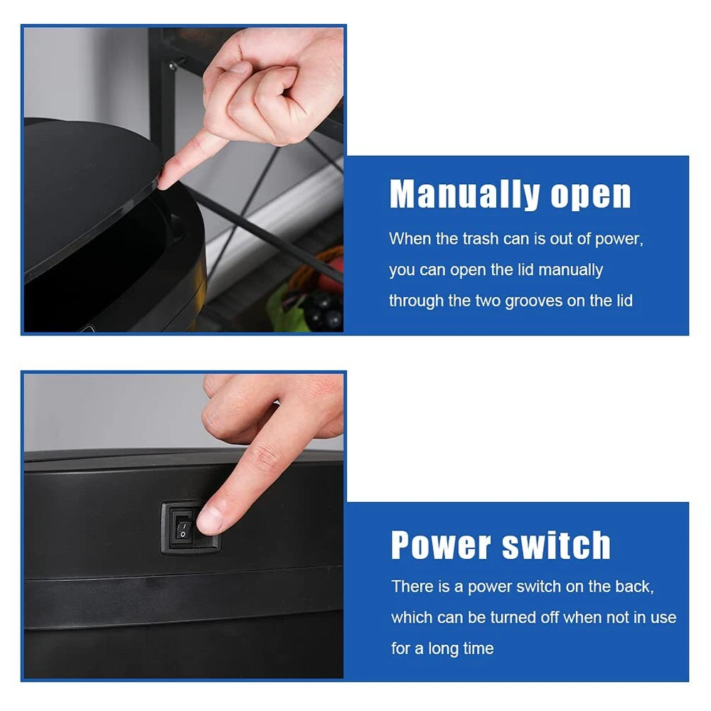 SPECIFICATIONS: Name: Automatic Trash Can Material: Stainless Steel Over Size: 11” x 16” x 23” Capacity: 13 Gallon / 50 Liter Battery: Type C Battery *4 (Which is not include) Applicable Place: Kitchen / Living Room / Bedroom / Bathroom / Office / etc... FEATURES: ✔ Subverting the traditional way of throwing garbage, our auto-sensing non-touch trash can automatically senses the approach of human hands or garbage, and automatically opens the lid. After the garbage is thrown in, the lid is automatically closed to isolate odors. ✔ Durable stainless steel material and appearance not only good looking but also easy to maintain and clean, won’t left any fingerprint, this garbage bin is waterproof and mute, which does not limit its applicable using occasion. ✔ Without complex design, this waste bin is very easy to use, after install the batteries, you only need to press the switch to “ON”, and if you want to change the garbage bag, you only need to lift the top part, the capability will match your daily need. ✔ Shipped from US, the delivery time usually between 3-7 days, you don’t need to wait for a long time to receive your package. 🚮【Large Capability】The 13 Gallon (equal to 50 Liter) capability garbage bin can absolutely meet your daily need. The regular 13 gallon garbage bag in the supermarket can be used in our waste bin perfectly. 🚮【High-Tech Induction Device】Our touch free trash can used high technology induction device, whether it is sensing the proximity of a human hand or an object, it can respond quickly to open the lid of the trash can, and automatically close the lid within 5 seconds after the trash is thrown in. 🚮【Easy To Clean & Isolate Odors】:The trash can’s stainless steel wire drawing is fingerprint-resistant and easily cleaned after sustained use, while the sealed exterior and infrared technology ensures odor is contained. 🚮【Adapt to Various Occasion】You can put it near the cooking table in the kitchen to make it easier to thrown the food waste, and with the waterproof design, you can also put it in the bathroom, it also suitable for living room, bedroom, and office or other various occasion. The classic and simple design will never out of fashion. 🚮【After-Sale Service】If you have any problem with the product or meet any question during the usage, please feel free to contact with our customer service, we promise we will provide you the most professioal technical support and best solution.