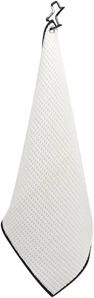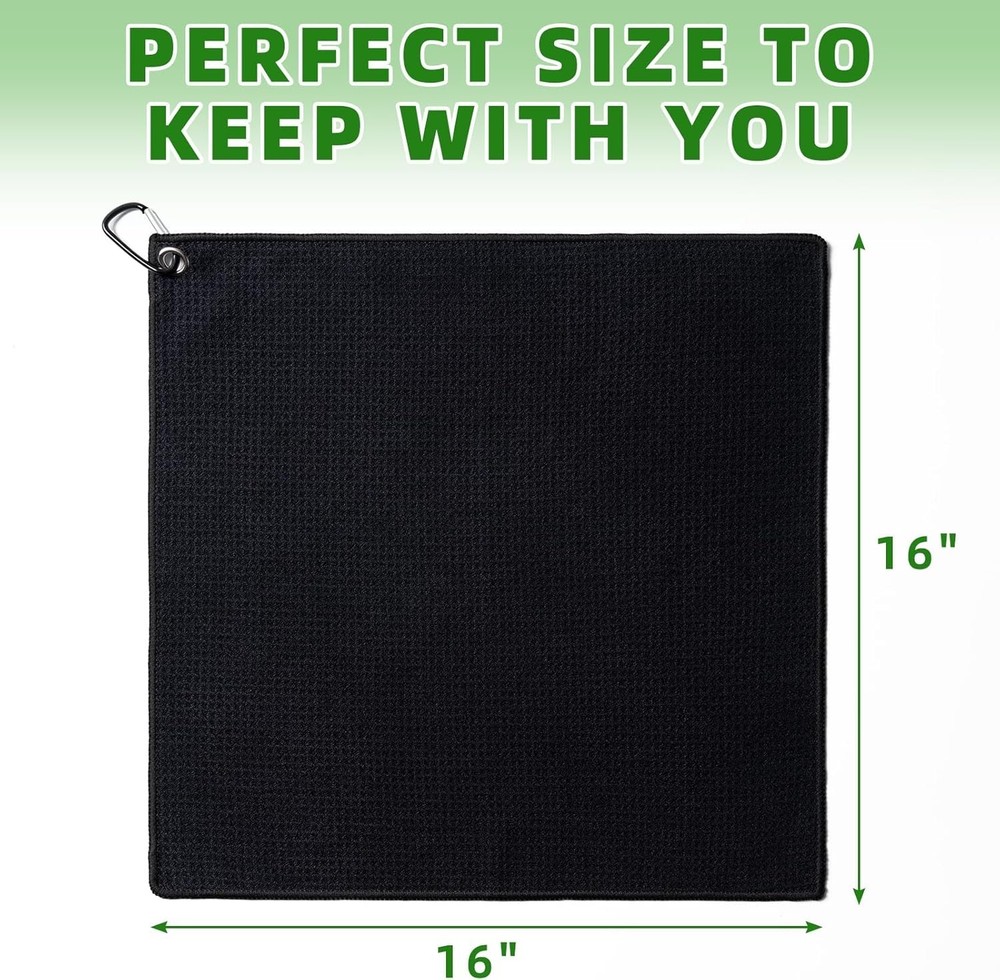 Blue/Black/Gray BRAND NEW Convenient Golf Towel:Each golf towel has dimensions of 16 inches by 16 inches, providing sufficient area for cleaning while still being small enough to conveniently fit in your golf bag without occupying excessive space. Microfiber Fabric Golf Towel:Crafted from microfiber material, our trifold golf towel is not only soft and highly absorbent but also effectively removes dirt, ensuring that your golf clubs, balls, and hands stay dry quickly during your game. Versatile Carabiner Clip: Each golf towel is fitted with a useful clip, which enables effortless attachment to either your golf bag or belt loop for prompt accessibility. This aspect boosts the towel's adaptability and ease of use during your time on the course. Stylish Waffle Weave Design:Stylish Waffle Weave Design:The waffle weave design not only contributes a stylish element but also expands the towel's surface area, improving its ability to clean effectively. This unique pattern can be rubbed into grooves on golf balls and grooves on clubs, and it can clean your sunglasses without leaving streaks. Great Value 3 Golf Towels:We've carefully selected three stunning color combinations that are not only the ideal size but also highly resistant to stains: black, blue, and gray. This gives you more options to coordinate with your golf bag! These make for excellent golf gifts! White 16" x 16" Microfiber Material. The Waffle Pattern helps clean balls and club heads better. Microfiber Material absorbs less water than cotton, easier to wash and carry. Clip conveniently attaches to your golf bag and prevents lost towels. Golf towels come in many styles to match your bag, club, and favorite team. THANK YOU