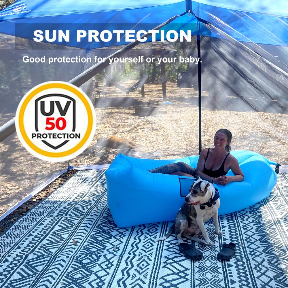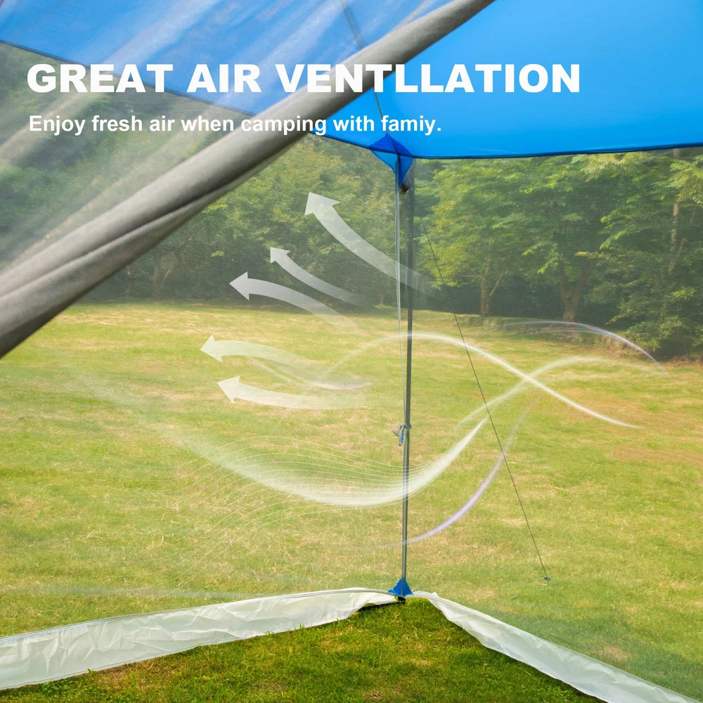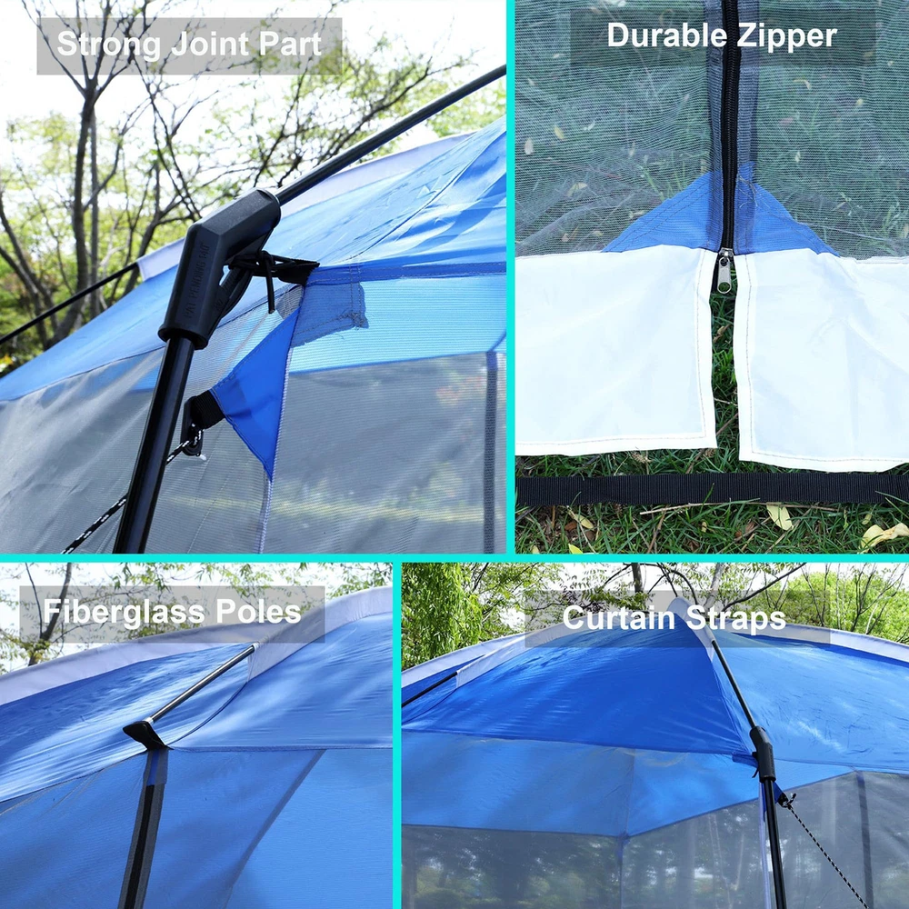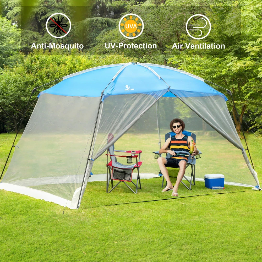 SPACIOUS SPACE: The 13 x 9 Ft screen house tent can easily accommodate 6-8 adults, huge interior space for outdoor & patio furnitures, tables, chairs, BBQ grills and camping equipment, this pop up tent providing a spacious interior shelter for patios outdoor beach camping activities 360° VIEW MOSQUITO TENT: Our screen camping tent provides a goods review of your surroundings and protect you from insects, bugs, mosquito, since the screen house shelter are see-through, you can look up at the stars and enjoy nature as-is without the buzzing and biting of insects. Enjoy nature 2 ZIPPERED ENTRANCES: This screen tent includes 2 doors with zipper that allow easy access to your belongings. Our screen tent canopy give you a nice trip, polyester material breathable design structure is suitable for beach, park, garden LIGHTWEIGHT & PORTABLE: This screen room instant tent weighs only 13 lbs. Carry bag included, you can easily and quickly setup or take down the screen house for camping with no hassle. Flexible fiberglass roof poles and rust-proof steel posts make the mosquito tent sturdy and durable for long-term use OUTDOOR SUN PROTECTION: Made of 190 T Polyester fabric, screen room mesh tent provides UPF 50+ UV protection. Good protection for yourself or your baby. You can travel with your families or friends together for camping, patio, or beach use PACKAGE INCLUDE: Screen house tent x1, Metal stakes x4, Ropes x4 WORLD RENOWNED – are making great products in outdoor camping in over 50 countries around the world – Come and join the Home! Contact us anytime if you got a problem on the products of , we will deal with it for you immediately – always stand with you