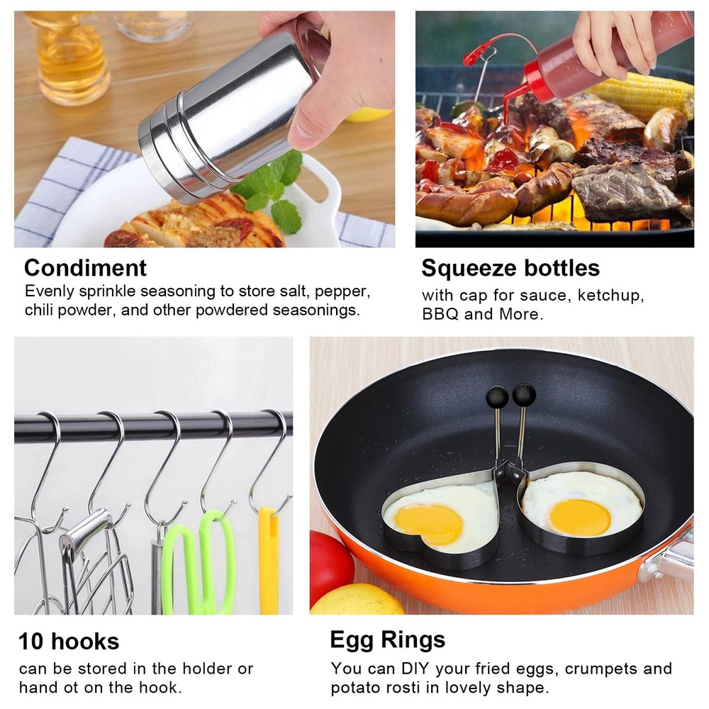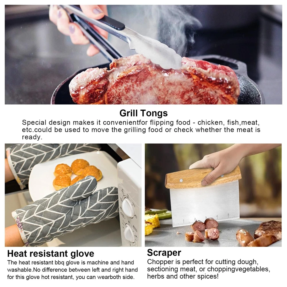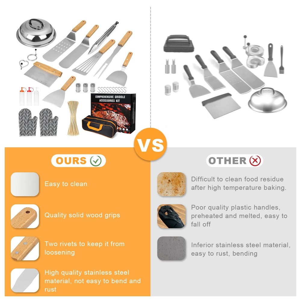 This griddle accessory kit is a game-changer for outdoor cooking! It has everything you need—spatulas, egg rings, a scraper, tongs, and even squeeze bottles—all made from sturdy stainless steel with comfy wooden handles. The basting cover keeps food juicy, and the tray keeps everything organized. Works perfectly with Blackstone, Camp Chef, and other grills. Super durable and easy to clean. A must-have for BBQ lovers!