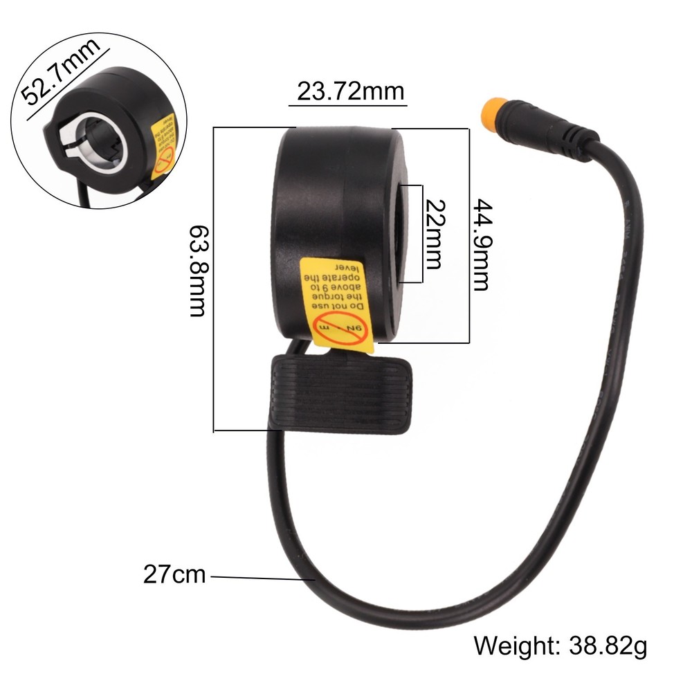 130X Thumb Throttle Electric Scooter Accelerator Long-term Use Reasonable Layout DESCRIPTION Features: *Proper profiles design will not interfere with brake levers or shifters. *Designed to be mounted on either side of your handlebar for flexibility. *M8 waterproof head, good waterproof performance, worry-free travel in rainy days. *Made of plastic, it is wear-resistant and not easy to damage, suitable for long-term use. *The cable length is 27cm, which can meet your installation needs and make a reasonable layout. Specifications: *Product Name:130X Thumb Throttle With For M8 Waterproof Head *Material:Plastic *Size:63.8*23.72cm,Line length 27cm *Color:Black *Weight:About 38.82g Package Content: 1*Thumb throttle Note: 1. The real color of the item may be slightly different from the pictures shown on website caused by many factors such as brightness of your monitor and light brightness. 2. Please allow slight manual measurement deviation for the data. POLICES Shipping Payment WARRANTY We only ship to confirmed ebay Order addresses. Please comfirm that your Order address is in line with your shipping address. Please kindly note that the c ombined shipping is not provided because the shipping fee is calculated by weight. Also, the each additional item means exactly the the same color and size. It takes about 7 -15 working days to US; about 10-30 working days to other countries. Transit time may be a little delayed because of the bad weather and customs inspection . If you do not receive your item within 30 working days since payment finished, please contact us immediately for further assistance. Payment must be completed within 5 days. If you have any problems about payment, please contact us via ebay message. We strive for 100% customer satisfaction! Positive Feedback is very important to us. If you have any questions, p lease feel free to contact us via "Ask seller a question" . We will reply your email within 24 working hours.